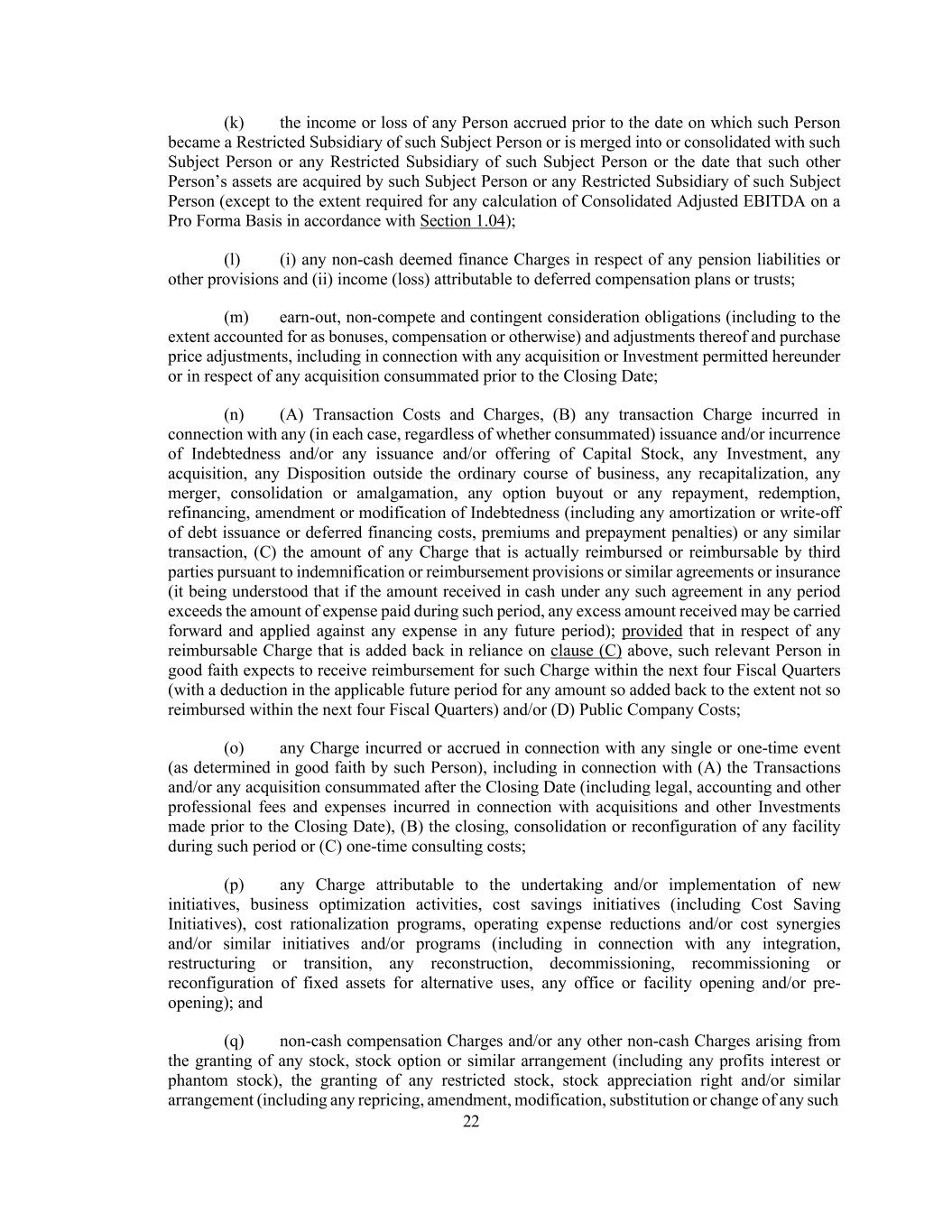 22 (k) the income or loss of any Person accrued prior to the date on which such Person became a Restricted Subsidiary of such Subject Person or is merged into or consolidated with such Subject Person or any Restricted Subsidiary of such Subject Person or the date that such other Person’s assets are acquired by such Subject Person or any Restricted Subsidiary of such Subject Person (except to the extent required for any calculation of Consolidated Adjusted EBITDA on a Pro Forma Basis in accordance with Section 1.04); (l) (i) any non-cash deemed finance Charges in respect of any pension liabilities or other provisions and (ii) income (loss) attributable to deferred compensation plans or trusts; (m) earn-out, non-compete and contingent consideration obligations (including to the extent accounted for as bonuses, compensation or otherwise) and adjustments thereof and purchase price adjustments, including in connection with any acquisition or Investment permitted hereunder or in respect of any acquisition consummated prior to the Closing Date; (n) (A) Transaction Costs and Charges, (B) any transaction Charge incurred in connection with any (in each case, regardless of whether consummated) issuance and/or incurrence of Indebtedness and/or any issuance and/or offering of Capital Stock, any Investment, any acquisition, any Disposition outside the ordinary course of business, any recapitalization, any merger, consolidation or amalgamation, any option buyout or any repayment, redemption, refinancing, amendment or modification of Indebtedness (including any amortization or write-off of debt issuance or deferred financing costs, premiums and prepayment penalties) or any similar transaction, (C) the amount of any Charge that is actually reimbursed or reimbursable by third parties pursuant to indemnification or reimbursement provisions or similar agreements or insurance (it being understood that if the amount received in cash under any such agreement in any period exceeds the amount of expense paid during such period, any excess amount received may be carried forward and applied against any expense in any future period); provided that in respect of any reimbursable Charge that is added back in reliance on clause (C) above, such relevant Person in good faith expects to receive reimbursement for such Charge within the next four Fiscal Quarters (with a deduction in the applicable future period for any amount so added back to the extent not so reimbursed within the next four Fiscal Quarters) and/or (D) Public Company Costs; (o) any Charge incurred or accrued in connection with any single or one-time event (as determined in good faith by such Person), including in connection with (A) the Transactions and/or any acquisition consummated after the Closing Date (including legal, accounting and other professional fees and expenses incurred in connection with acquisitions and other Investments made prior to the Closing Date), (B) the closing, consolidation or reconfiguration of any facility during such period or (C) one-time consulting costs; (p) any Charge attributable to the undertaking and/or implementation of new initiatives, business optimization activities, cost savings initiatives (including Cost Saving Initiatives), cost rationalization programs, operating expense reductions and/or cost synergies and/or similar initiatives and/or programs (including in connection with any integration, restructuring or transition, any reconstruction, decommissioning, recommissioning or reconfiguration of fixed assets for alternative uses, any office or facility opening and/or pre- opening); and (q) non-cash compensation Charges and/or any other non-cash Charges arising from the granting of any stock, stock option or similar arrangement (including any profits interest or phantom stock), the granting of any restricted stock, stock appreciation right and/or similar arrangement (including any repricing, amendment, modification, substitution or change of any such