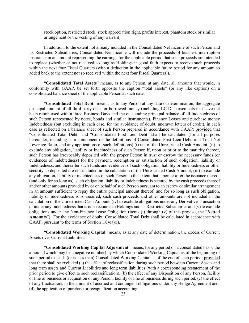 23 stock option, restricted stock, stock appreciation right, profits interest, phantom stock or similar arrangement or the vesting of any warrant). In addition, to the extent not already included in the Consolidated Net Income of such Person and its Restricted Subsidiaries, Consolidated Net Income will include the proceeds of business interruption insurance in an amount representing the earnings for the applicable period that such proceeds are intended to replace (whether or not received so long as Holdings in good faith expects to receive such proceeds within the next four Fiscal Quarters (with a deduction in the applicable future period for any amount so added back to the extent not so received within the next four Fiscal Quarters)). “Consolidated Total Assets” means, as to any Person, at any date, all amounts that would, in conformity with GAAP, be set forth opposite the caption “total assets” (or any like caption) on a consolidated balance sheet of the applicable Person at such date. “Consolidated Total Debt” means, as to any Person at any date of determination, the aggregate principal amount of all third party debt for borrowed money (including LC Disbursements that have not been reimbursed within three Business Days and the outstanding principal balance of all Indebtedness of such Person represented by notes, bonds and similar instruments), Finance Leases and purchase money Indebtedness (but excluding in each case, for the avoidance of doubt, undrawn letters of credit), in each case as reflected on a balance sheet of such Person prepared in accordance with GAAP; provided that “Consolidated Total Debt” and “Consolidated First Lien Debt” shall be calculated (for all purposes hereunder, including as a component of the definitions of Consolidated First Lien Debt, and Total Net Leverage Ratio, and any applications of such definitions) (i) net of the Unrestricted Cash Amount, (ii) to exclude any obligation, liability or Indebtedness of such Person if, upon or prior to the maturity thereof, such Person has irrevocably deposited with the proper Person in trust or escrow the necessary funds (or evidences of indebtedness) for the payment, redemption or satisfaction of such obligation, liability or Indebtedness, and thereafter such funds and evidences of such obligation, liability or Indebtedness or other security so deposited are not included in the calculation of the Unrestricted Cash Amount, (iii) to exclude any obligation, liability or indebtedness of such Person to the extent that, upon or after the issuance thereof (and only for so long as), such obligation, liability or indebtedness is secured by the cash proceeds thereof and/or other amounts provided by or on behalf of such Person pursuant to an escrow or similar arrangement in an amount sufficient to repay the entire principal amount thereof, and for so long as such obligation, liability or indebtedness is so secured, such cash proceeds and other amounts are not included in the calculation of the Unrestricted Cash Amount, (iv) to exclude obligations under any Derivative Transaction or under any Indebtedness that is non-recourse to Holdings and its Restricted Subsidiaries and (v) to exclude obligations under any Non-Finance Lease Obligation (items (i) through (v) of this proviso, the “Netted Amounts”). For the avoidance of doubt, Consolidated Total Debt shall be calculated in accordance with GAAP, pursuant to the terms of Section 1.04(a)(i). “Consolidated Working Capital” means, as at any date of determination, the excess of Current Assets over Current Liabilities. “Consolidated Working Capital Adjustment” means, for any period on a consolidated basis, the amount (which may be a negative number) by which Consolidated Working Capital as of the beginning of such period exceeds (or is less than) Consolidated Working Capital as of the end of such period; provided that there shall be excluded (a) the effect of reclassification during such period between Current Assets and long term assets and Current Liabilities and long term liabilities (with a corresponding restatement of the prior period to give effect to such reclassification), (b) the effect of any Disposition of any Person, facility or line of business or acquisition of any Person, facility or line of business during such period, (c) the effect of any fluctuations in the amount of accrued and contingent obligations under any Hedge Agreement and (d) the application of purchase or recapitalization accounting.