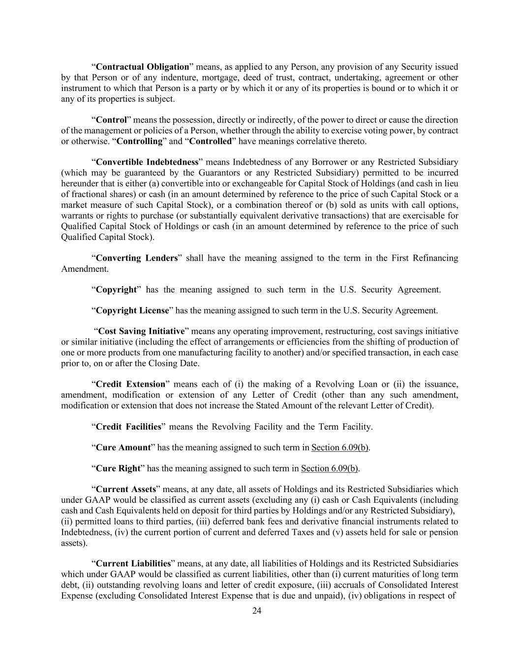 24 “Contractual Obligation” means, as applied to any Person, any provision of any Security issued by that Person or of any indenture, mortgage, deed of trust, contract, undertaking, agreement or other instrument to which that Person is a party or by which it or any of its properties is bound or to which it or any of its properties is subject. “Control” means the possession, directly or indirectly, of the power to direct or cause the direction of the management or policies of a Person, whether through the ability to exercise voting power, by contract or otherwise. “Controlling” and “Controlled” have meanings correlative thereto. “Convertible Indebtedness” means Indebtedness of any Borrower or any Restricted Subsidiary (which may be guaranteed by the Guarantors or any Restricted Subsidiary) permitted to be incurred hereunder that is either (a) convertible into or exchangeable for Capital Stock of Holdings (and cash in lieu of fractional shares) or cash (in an amount determined by reference to the price of such Capital Stock or a market measure of such Capital Stock), or a combination thereof or (b) sold as units with call options, warrants or rights to purchase (or substantially equivalent derivative transactions) that are exercisable for Qualified Capital Stock of Holdings or cash (in an amount determined by reference to the price of such Qualified Capital Stock). “Converting Lenders” shall have the meaning assigned to the term in the First Refinancing Amendment. “Copyright” has the meaning assigned to such term in the U.S. Security Agreement. “Copyright License” has the meaning assigned to such term in the U.S. Security Agreement. “Cost Saving Initiative” means any operating improvement, restructuring, cost savings initiative or similar initiative (including the effect of arrangements or efficiencies from the shifting of production of one or more products from one manufacturing facility to another) and/or specified transaction, in each case prior to, on or after the Closing Date. “Credit Extension” means each of (i) the making of a Revolving Loan or (ii) the issuance, amendment, modification or extension of any Letter of Credit (other than any such amendment, modification or extension that does not increase the Stated Amount of the relevant Letter of Credit). “Credit Facilities” means the Revolving Facility and the Term Facility. “Cure Amount” has the meaning assigned to such term in Section 6.09(b). “Cure Right” has the meaning assigned to such term in Section 6.09(b). “Current Assets” means, at any date, all assets of Holdings and its Restricted Subsidiaries which under GAAP would be classified as current assets (excluding any (i) cash or Cash Equivalents (including cash and Cash Equivalents held on deposit for third parties by Holdings and/or any Restricted Subsidiary), (ii) permitted loans to third parties, (iii) deferred bank fees and derivative financial instruments related to Indebtedness, (iv) the current portion of current and deferred Taxes and (v) assets held for sale or pension assets). “Current Liabilities” means, at any date, all liabilities of Holdings and its Restricted Subsidiaries which under GAAP would be classified as current liabilities, other than (i) current maturities of long term debt, (ii) outstanding revolving loans and letter of credit exposure, (iii) accruals of Consolidated Interest Expense (excluding Consolidated Interest Expense that is due and unpaid), (iv) obligations in respect of