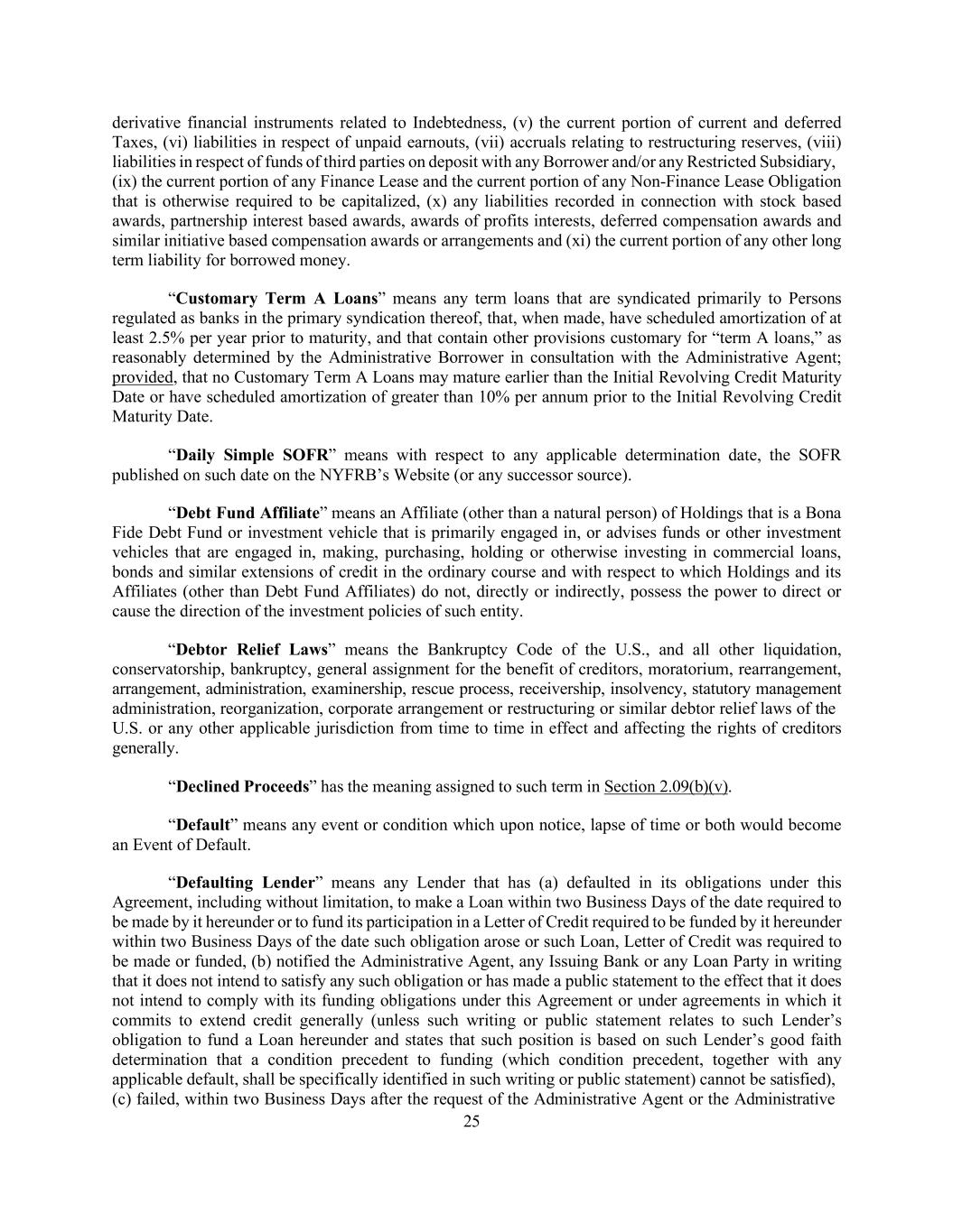 25 derivative financial instruments related to Indebtedness, (v) the current portion of current and deferred Taxes, (vi) liabilities in respect of unpaid earnouts, (vii) accruals relating to restructuring reserves, (viii) liabilities in respect of funds of third parties on deposit with any Borrower and/or any Restricted Subsidiary, (ix) the current portion of any Finance Lease and the current portion of any Non-Finance Lease Obligation that is otherwise required to be capitalized, (x) any liabilities recorded in connection with stock based awards, partnership interest based awards, awards of profits interests, deferred compensation awards and similar initiative based compensation awards or arrangements and (xi) the current portion of any other long term liability for borrowed money. “Customary Term A Loans” means any term loans that are syndicated primarily to Persons regulated as banks in the primary syndication thereof, that, when made, have scheduled amortization of at least 2.5% per year prior to maturity, and that contain other provisions customary for “term A loans,” as reasonably determined by the Administrative Borrower in consultation with the Administrative Agent; provided, that no Customary Term A Loans may mature earlier than the Initial Revolving Credit Maturity Date or have scheduled amortization of greater than 10% per annum prior to the Initial Revolving Credit Maturity Date. “Daily Simple SOFR” means with respect to any applicable determination date, the SOFR published on such date on the NYFRB’s Website (or any successor source). “Debt Fund Affiliate” means an Affiliate (other than a natural person) of Holdings that is a Bona Fide Debt Fund or investment vehicle that is primarily engaged in, or advises funds or other investment vehicles that are engaged in, making, purchasing, holding or otherwise investing in commercial loans, bonds and similar extensions of credit in the ordinary course and with respect to which Holdings and its Affiliates (other than Debt Fund Affiliates) do not, directly or indirectly, possess the power to direct or cause the direction of the investment policies of such entity. “Debtor Relief Laws” means the Bankruptcy Code of the U.S., and all other liquidation, conservatorship, bankruptcy, general assignment for the benefit of creditors, moratorium, rearrangement, arrangement, administration, examinership, rescue process, receivership, insolvency, statutory management administration, reorganization, corporate arrangement or restructuring or similar debtor relief laws of the U.S. or any other applicable jurisdiction from time to time in effect and affecting the rights of creditors generally. “Declined Proceeds” has the meaning assigned to such term in Section 2.09(b)(v). “Default” means any event or condition which upon notice, lapse of time or both would become an Event of Default. “Defaulting Lender” means any Lender that has (a) defaulted in its obligations under this Agreement, including without limitation, to make a Loan within two Business Days of the date required to be made by it hereunder or to fund its participation in a Letter of Credit required to be funded by it hereunder within two Business Days of the date such obligation arose or such Loan, Letter of Credit was required to be made or funded, (b) notified the Administrative Agent, any Issuing Bank or any Loan Party in writing that it does not intend to satisfy any such obligation or has made a public statement to the effect that it does not intend to comply with its funding obligations under this Agreement or under agreements in which it commits to extend credit generally (unless such writing or public statement relates to such Lender’s obligation to fund a Loan hereunder and states that such position is based on such Lender’s good faith determination that a condition precedent to funding (which condition precedent, together with any applicable default, shall be specifically identified in such writing or public statement) cannot be satisfied), (c) failed, within two Business Days after the request of the Administrative Agent or the Administrative