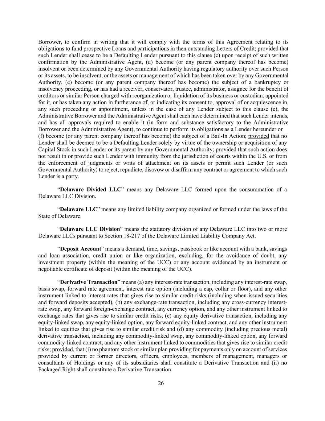 26 Borrower, to confirm in writing that it will comply with the terms of this Agreement relating to its obligations to fund prospective Loans and participations in then outstanding Letters of Credit; provided that such Lender shall cease to be a Defaulting Lender pursuant to this clause (c) upon receipt of such written confirmation by the Administrative Agent, (d) become (or any parent company thereof has become) insolvent or been determined by any Governmental Authority having regulatory authority over such Person or its assets, to be insolvent, or the assets or management of which has been taken over by any Governmental Authority, (e) become (or any parent company thereof has become) the subject of a bankruptcy or insolvency proceeding, or has had a receiver, conservator, trustee, administrator, assignee for the benefit of creditors or similar Person charged with reorganization or liquidation of its business or custodian, appointed for it, or has taken any action in furtherance of, or indicating its consent to, approval of or acquiescence in, any such proceeding or appointment, unless in the case of any Lender subject to this clause (e), the Administrative Borrower and the Administrative Agent shall each have determined that such Lender intends, and has all approvals required to enable it (in form and substance satisfactory to the Administrative Borrower and the Administrative Agent), to continue to perform its obligations as a Lender hereunder or (f) become (or any parent company thereof has become) the subject of a Bail-In Action; provided that no Lender shall be deemed to be a Defaulting Lender solely by virtue of the ownership or acquisition of any Capital Stock in such Lender or its parent by any Governmental Authority; provided that such action does not result in or provide such Lender with immunity from the jurisdiction of courts within the U.S. or from the enforcement of judgments or writs of attachment on its assets or permit such Lender (or such Governmental Authority) to reject, repudiate, disavow or disaffirm any contract or agreement to which such Lender is a party. “Delaware Divided LLC” means any Delaware LLC formed upon the consummation of a Delaware LLC Division. “Delaware LLC” means any limited liability company organized or formed under the laws of the State of Delaware. “Delaware LLC Division” means the statutory division of any Delaware LLC into two or more Delaware LLCs pursuant to Section 18-217 of the Delaware Limited Liability Company Act. “Deposit Account” means a demand, time, savings, passbook or like account with a bank, savings and loan association, credit union or like organization, excluding, for the avoidance of doubt, any investment property (within the meaning of the UCC) or any account evidenced by an instrument or negotiable certificate of deposit (within the meaning of the UCC). “Derivative Transaction” means (a) any interest-rate transaction, including any interest-rate swap, basis swap, forward rate agreement, interest rate option (including a cap, collar or floor), and any other instrument linked to interest rates that gives rise to similar credit risks (including when-issued securities and forward deposits accepted), (b) any exchange-rate transaction, including any cross-currency interest- rate swap, any forward foreign-exchange contract, any currency option, and any other instrument linked to exchange rates that gives rise to similar credit risks, (c) any equity derivative transaction, including any equity-linked swap, any equity-linked option, any forward equity-linked contract, and any other instrument linked to equities that gives rise to similar credit risk and (d) any commodity (including precious metal) derivative transaction, including any commodity-linked swap, any commodity-linked option, any forward commodity-linked contract, and any other instrument linked to commodities that gives rise to similar credit risks; provided, that (i) no phantom stock or similar plan providing for payments only on account of services provided by current or former directors, officers, employees, members of management, managers or consultants of Holdings or any of its subsidiaries shall constitute a Derivative Transaction and (ii) no Packaged Right shall constitute a Derivative Transaction.