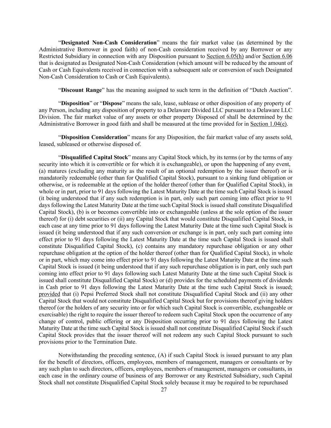 27 “Designated Non-Cash Consideration” means the fair market value (as determined by the Administrative Borrower in good faith) of non-Cash consideration received by any Borrower or any Restricted Subsidiary in connection with any Disposition pursuant to Section 6.05(h) and/or Section 6.06 that is designated as Designated Non-Cash Consideration (which amount will be reduced by the amount of Cash or Cash Equivalents received in connection with a subsequent sale or conversion of such Designated Non-Cash Consideration to Cash or Cash Equivalents). “Discount Range” has the meaning assigned to such term in the definition of “Dutch Auction”. “Disposition” or “Dispose” means the sale, lease, sublease or other disposition of any property of any Person, including any disposition of property to a Delaware Divided LLC pursuant to a Delaware LLC Division. The fair market value of any assets or other property Disposed of shall be determined by the Administrative Borrower in good faith and shall be measured at the time provided for in Section 1.04(e). “Disposition Consideration” means for any Disposition, the fair market value of any assets sold, leased, subleased or otherwise disposed of. “Disqualified Capital Stock” means any Capital Stock which, by its terms (or by the terms of any security into which it is convertible or for which it is exchangeable), or upon the happening of any event, (a) matures (excluding any maturity as the result of an optional redemption by the issuer thereof) or is mandatorily redeemable (other than for Qualified Capital Stock), pursuant to a sinking fund obligation or otherwise, or is redeemable at the option of the holder thereof (other than for Qualified Capital Stock), in whole or in part, prior to 91 days following the Latest Maturity Date at the time such Capital Stock is issued (it being understood that if any such redemption is in part, only such part coming into effect prior to 91 days following the Latest Maturity Date at the time such Capital Stock is issued shall constitute Disqualified Capital Stock), (b) is or becomes convertible into or exchangeable (unless at the sole option of the issuer thereof) for (i) debt securities or (ii) any Capital Stock that would constitute Disqualified Capital Stock, in each case at any time prior to 91 days following the Latest Maturity Date at the time such Capital Stock is issued (it being understood that if any such conversion or exchange is in part, only such part coming into effect prior to 91 days following the Latest Maturity Date at the time such Capital Stock is issued shall constitute Disqualified Capital Stock), (c) contains any mandatory repurchase obligation or any other repurchase obligation at the option of the holder thereof (other than for Qualified Capital Stock), in whole or in part, which may come into effect prior to 91 days following the Latest Maturity Date at the time such Capital Stock is issued (it being understood that if any such repurchase obligation is in part, only such part coming into effect prior to 91 days following such Latest Maturity Date at the time such Capital Stock is issued shall constitute Disqualified Capital Stock) or (d) provides for the scheduled payments of dividends in Cash prior to 91 days following the Latest Maturity Date at the time such Capital Stock is issued; provided that (i) Pepsi Preferred Stock shall not constitute Disqualified Capital Stock and (ii) any other Capital Stock that would not constitute Disqualified Capital Stock but for provisions thereof giving holders thereof (or the holders of any security into or for which such Capital Stock is convertible, exchangeable or exercisable) the right to require the issuer thereof to redeem such Capital Stock upon the occurrence of any change of control, public offering or any Disposition occurring prior to 91 days following the Latest Maturity Date at the time such Capital Stock is issued shall not constitute Disqualified Capital Stock if such Capital Stock provides that the issuer thereof will not redeem any such Capital Stock pursuant to such provisions prior to the Termination Date. Notwithstanding the preceding sentence, (A) if such Capital Stock is issued pursuant to any plan for the benefit of directors, officers, employees, members of management, managers or consultants or by any such plan to such directors, officers, employees, members of management, managers or consultants, in each case in the ordinary course of business of any Borrower or any Restricted Subsidiary, such Capital Stock shall not constitute Disqualified Capital Stock solely because it may be required to be repurchased