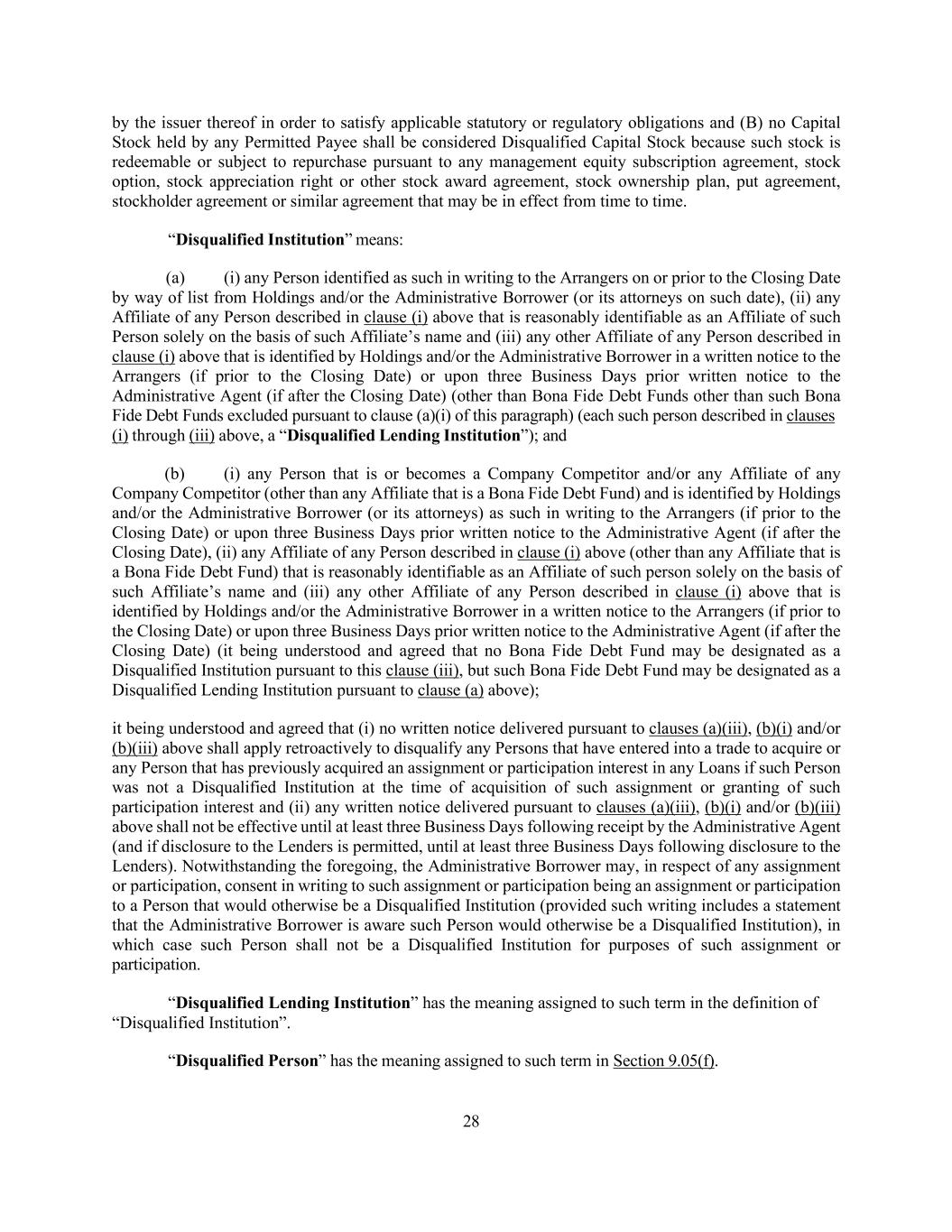 28 by the issuer thereof in order to satisfy applicable statutory or regulatory obligations and (B) no Capital Stock held by any Permitted Payee shall be considered Disqualified Capital Stock because such stock is redeemable or subject to repurchase pursuant to any management equity subscription agreement, stock option, stock appreciation right or other stock award agreement, stock ownership plan, put agreement, stockholder agreement or similar agreement that may be in effect from time to time. “Disqualified Institution” means: (a) (i) any Person identified as such in writing to the Arrangers on or prior to the Closing Date by way of list from Holdings and/or the Administrative Borrower (or its attorneys on such date), (ii) any Affiliate of any Person described in clause (i) above that is reasonably identifiable as an Affiliate of such Person solely on the basis of such Affiliate’s name and (iii) any other Affiliate of any Person described in clause (i) above that is identified by Holdings and/or the Administrative Borrower in a written notice to the Arrangers (if prior to the Closing Date) or upon three Business Days prior written notice to the Administrative Agent (if after the Closing Date) (other than Bona Fide Debt Funds other than such Bona Fide Debt Funds excluded pursuant to clause (a)(i) of this paragraph) (each such person described in clauses (i) through (iii) above, a “Disqualified Lending Institution”); and (b) (i) any Person that is or becomes a Company Competitor and/or any Affiliate of any Company Competitor (other than any Affiliate that is a Bona Fide Debt Fund) and is identified by Holdings and/or the Administrative Borrower (or its attorneys) as such in writing to the Arrangers (if prior to the Closing Date) or upon three Business Days prior written notice to the Administrative Agent (if after the Closing Date), (ii) any Affiliate of any Person described in clause (i) above (other than any Affiliate that is a Bona Fide Debt Fund) that is reasonably identifiable as an Affiliate of such person solely on the basis of such Affiliate’s name and (iii) any other Affiliate of any Person described in clause (i) above that is identified by Holdings and/or the Administrative Borrower in a written notice to the Arrangers (if prior to the Closing Date) or upon three Business Days prior written notice to the Administrative Agent (if after the Closing Date) (it being understood and agreed that no Bona Fide Debt Fund may be designated as a Disqualified Institution pursuant to this clause (iii), but such Bona Fide Debt Fund may be designated as a Disqualified Lending Institution pursuant to clause (a) above); it being understood and agreed that (i) no written notice delivered pursuant to clauses (a)(iii), (b)(i) and/or (b)(iii) above shall apply retroactively to disqualify any Persons that have entered into a trade to acquire or any Person that has previously acquired an assignment or participation interest in any Loans if such Person was not a Disqualified Institution at the time of acquisition of such assignment or granting of such participation interest and (ii) any written notice delivered pursuant to clauses (a)(iii), (b)(i) and/or (b)(iii) above shall not be effective until at least three Business Days following receipt by the Administrative Agent (and if disclosure to the Lenders is permitted, until at least three Business Days following disclosure to the Lenders). Notwithstanding the foregoing, the Administrative Borrower may, in respect of any assignment or participation, consent in writing to such assignment or participation being an assignment or participation to a Person that would otherwise be a Disqualified Institution (provided such writing includes a statement that the Administrative Borrower is aware such Person would otherwise be a Disqualified Institution), in which case such Person shall not be a Disqualified Institution for purposes of such assignment or participation. “Disqualified Lending Institution” has the meaning assigned to such term in the definition of “Disqualified Institution”. “Disqualified Person” has the meaning assigned to such term in Section 9.05(f).