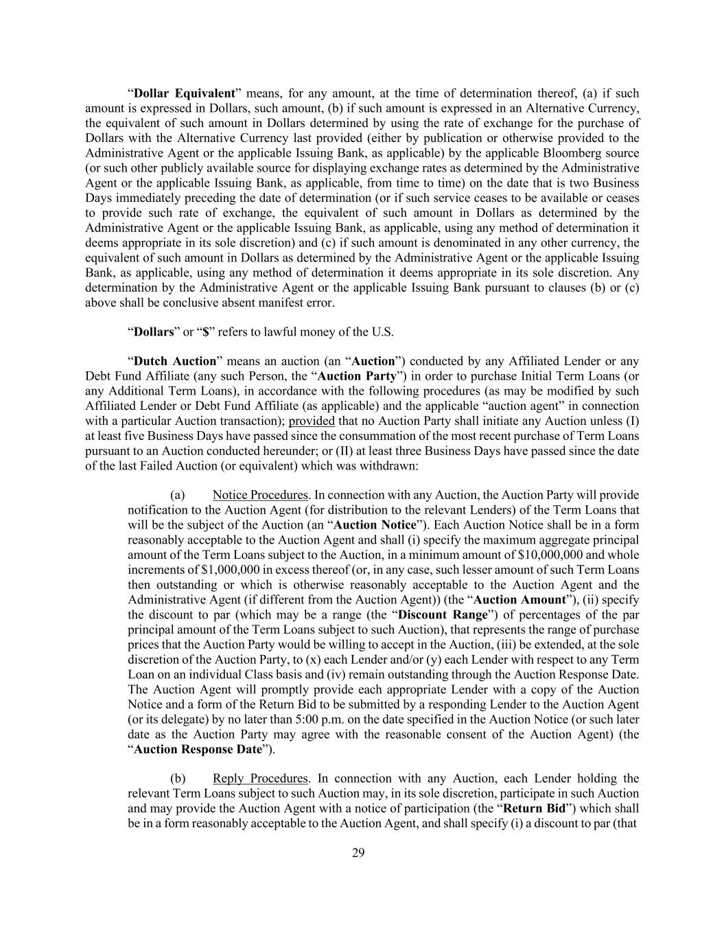 29 “Dollar Equivalent” means, for any amount, at the time of determination thereof, (a) if such amount is expressed in Dollars, such amount, (b) if such amount is expressed in an Alternative Currency, the equivalent of such amount in Dollars determined by using the rate of exchange for the purchase of Dollars with the Alternative Currency last provided (either by publication or otherwise provided to the Administrative Agent or the applicable Issuing Bank, as applicable) by the applicable Bloomberg source (or such other publicly available source for displaying exchange rates as determined by the Administrative Agent or the applicable Issuing Bank, as applicable, from time to time) on the date that is two Business Days immediately preceding the date of determination (or if such service ceases to be available or ceases to provide such rate of exchange, the equivalent of such amount in Dollars as determined by the Administrative Agent or the applicable Issuing Bank, as applicable, using any method of determination it deems appropriate in its sole discretion) and (c) if such amount is denominated in any other currency, the equivalent of such amount in Dollars as determined by the Administrative Agent or the applicable Issuing Bank, as applicable, using any method of determination it deems appropriate in its sole discretion. Any determination by the Administrative Agent or the applicable Issuing Bank pursuant to clauses (b) or (c) above shall be conclusive absent manifest error. “Dollars” or “$” refers to lawful money of the U.S. “Dutch Auction” means an auction (an “Auction”) conducted by any Affiliated Lender or any Debt Fund Affiliate (any such Person, the “Auction Party”) in order to purchase Initial Term Loans (or any Additional Term Loans), in accordance with the following procedures (as may be modified by such Affiliated Lender or Debt Fund Affiliate (as applicable) and the applicable “auction agent” in connection with a particular Auction transaction); provided that no Auction Party shall initiate any Auction unless (I) at least five Business Days have passed since the consummation of the most recent purchase of Term Loans pursuant to an Auction conducted hereunder; or (II) at least three Business Days have passed since the date of the last Failed Auction (or equivalent) which was withdrawn: (a) Notice Procedures. In connection with any Auction, the Auction Party will provide notification to the Auction Agent (for distribution to the relevant Lenders) of the Term Loans that will be the subject of the Auction (an “Auction Notice”). Each Auction Notice shall be in a form reasonably acceptable to the Auction Agent and shall (i) specify the maximum aggregate principal amount of the Term Loans subject to the Auction, in a minimum amount of $10,000,000 and whole increments of $1,000,000 in excess thereof (or, in any case, such lesser amount of such Term Loans then outstanding or which is otherwise reasonably acceptable to the Auction Agent and the Administrative Agent (if different from the Auction Agent)) (the “Auction Amount”), (ii) specify the discount to par (which may be a range (the “Discount Range”) of percentages of the par principal amount of the Term Loans subject to such Auction), that represents the range of purchase prices that the Auction Party would be willing to accept in the Auction, (iii) be extended, at the sole discretion of the Auction Party, to (x) each Lender and/or (y) each Lender with respect to any Term Loan on an individual Class basis and (iv) remain outstanding through the Auction Response Date. The Auction Agent will promptly provide each appropriate Lender with a copy of the Auction Notice and a form of the Return Bid to be submitted by a responding Lender to the Auction Agent (or its delegate) by no later than 5:00 p.m. on the date specified in the Auction Notice (or such later date as the Auction Party may agree with the reasonable consent of the Auction Agent) (the “Auction Response Date”). (b) Reply Procedures. In connection with any Auction, each Lender holding the relevant Term Loans subject to such Auction may, in its sole discretion, participate in such Auction and may provide the Auction Agent with a notice of participation (the “Return Bid”) which shall be in a form reasonably acceptable to the Auction Agent, and shall specify (i) a discount to par (that