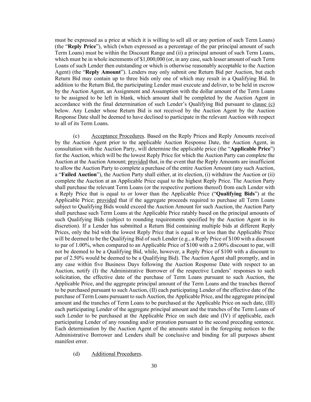 30 must be expressed as a price at which it is willing to sell all or any portion of such Term Loans) (the “Reply Price”), which (when expressed as a percentage of the par principal amount of such Term Loans) must be within the Discount Range and (ii) a principal amount of such Term Loans, which must be in whole increments of $1,000,000 (or, in any case, such lesser amount of such Term Loans of such Lender then outstanding or which is otherwise reasonably acceptable to the Auction Agent) (the “Reply Amount”). Lenders may only submit one Return Bid per Auction, but each Return Bid may contain up to three bids only one of which may result in a Qualifying Bid. In addition to the Return Bid, the participating Lender must execute and deliver, to be held in escrow by the Auction Agent, an Assignment and Assumption with the dollar amount of the Term Loans to be assigned to be left in blank, which amount shall be completed by the Auction Agent in accordance with the final determination of such Lender’s Qualifying Bid pursuant to clause (c) below. Any Lender whose Return Bid is not received by the Auction Agent by the Auction Response Date shall be deemed to have declined to participate in the relevant Auction with respect to all of its Term Loans. (c) Acceptance Procedures. Based on the Reply Prices and Reply Amounts received by the Auction Agent prior to the applicable Auction Response Date, the Auction Agent, in consultation with the Auction Party, will determine the applicable price (the “Applicable Price”) for the Auction, which will be the lowest Reply Price for which the Auction Party can complete the Auction at the Auction Amount; provided that, in the event that the Reply Amounts are insufficient to allow the Auction Party to complete a purchase of the entire Auction Amount (any such Auction, a “Failed Auction”), the Auction Party shall either, at its election, (i) withdraw the Auction or (ii) complete the Auction at an Applicable Price equal to the highest Reply Price. The Auction Party shall purchase the relevant Term Loans (or the respective portions thereof) from each Lender with a Reply Price that is equal to or lower than the Applicable Price (“Qualifying Bids”) at the Applicable Price; provided that if the aggregate proceeds required to purchase all Term Loans subject to Qualifying Bids would exceed the Auction Amount for such Auction, the Auction Party shall purchase such Term Loans at the Applicable Price ratably based on the principal amounts of such Qualifying Bids (subject to rounding requirements specified by the Auction Agent in its discretion). If a Lender has submitted a Return Bid containing multiple bids at different Reply Prices, only the bid with the lowest Reply Price that is equal to or less than the Applicable Price will be deemed to be the Qualifying Bid of such Lender (e.g., a Reply Price of $100 with a discount to par of 1.00%, when compared to an Applicable Price of $100 with a 2.00% discount to par, will not be deemed to be a Qualifying Bid, while, however, a Reply Price of $100 with a discount to par of 2.50% would be deemed to be a Qualifying Bid). The Auction Agent shall promptly, and in any case within five Business Days following the Auction Response Date with respect to an Auction, notify (I) the Administrative Borrower of the respective Lenders’ responses to such solicitation, the effective date of the purchase of Term Loans pursuant to such Auction, the Applicable Price, and the aggregate principal amount of the Term Loans and the tranches thereof to be purchased pursuant to such Auction, (II) each participating Lender of the effective date of the purchase of Term Loans pursuant to such Auction, the Applicable Price, and the aggregate principal amount and the tranches of Term Loans to be purchased at the Applicable Price on such date, (III) each participating Lender of the aggregate principal amount and the tranches of the Term Loans of such Lender to be purchased at the Applicable Price on such date and (IV) if applicable, each participating Lender of any rounding and/or proration pursuant to the second preceding sentence. Each determination by the Auction Agent of the amounts stated in the foregoing notices to the Administrative Borrower and Lenders shall be conclusive and binding for all purposes absent manifest error. (d) Additional Procedures.