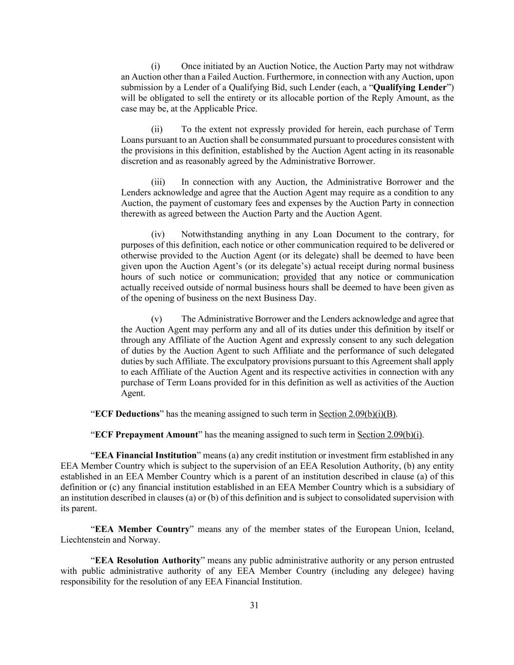 31 (i) Once initiated by an Auction Notice, the Auction Party may not withdraw an Auction other than a Failed Auction. Furthermore, in connection with any Auction, upon submission by a Lender of a Qualifying Bid, such Lender (each, a “Qualifying Lender”) will be obligated to sell the entirety or its allocable portion of the Reply Amount, as the case may be, at the Applicable Price. (ii) To the extent not expressly provided for herein, each purchase of Term Loans pursuant to an Auction shall be consummated pursuant to procedures consistent with the provisions in this definition, established by the Auction Agent acting in its reasonable discretion and as reasonably agreed by the Administrative Borrower. (iii) In connection with any Auction, the Administrative Borrower and the Lenders acknowledge and agree that the Auction Agent may require as a condition to any Auction, the payment of customary fees and expenses by the Auction Party in connection therewith as agreed between the Auction Party and the Auction Agent. (iv) Notwithstanding anything in any Loan Document to the contrary, for purposes of this definition, each notice or other communication required to be delivered or otherwise provided to the Auction Agent (or its delegate) shall be deemed to have been given upon the Auction Agent’s (or its delegate’s) actual receipt during normal business hours of such notice or communication; provided that any notice or communication actually received outside of normal business hours shall be deemed to have been given as of the opening of business on the next Business Day. (v) The Administrative Borrower and the Lenders acknowledge and agree that the Auction Agent may perform any and all of its duties under this definition by itself or through any Affiliate of the Auction Agent and expressly consent to any such delegation of duties by the Auction Agent to such Affiliate and the performance of such delegated duties by such Affiliate. The exculpatory provisions pursuant to this Agreement shall apply to each Affiliate of the Auction Agent and its respective activities in connection with any purchase of Term Loans provided for in this definition as well as activities of the Auction Agent. “ECF Deductions” has the meaning assigned to such term in Section 2.09(b)(i)(B). “ECF Prepayment Amount” has the meaning assigned to such term in Section 2.09(b)(i). “EEA Financial Institution” means (a) any credit institution or investment firm established in any EEA Member Country which is subject to the supervision of an EEA Resolution Authority, (b) any entity established in an EEA Member Country which is a parent of an institution described in clause (a) of this definition or (c) any financial institution established in an EEA Member Country which is a subsidiary of an institution described in clauses (a) or (b) of this definition and is subject to consolidated supervision with its parent. “EEA Member Country” means any of the member states of the European Union, Iceland, Liechtenstein and Norway. “EEA Resolution Authority” means any public administrative authority or any person entrusted with public administrative authority of any EEA Member Country (including any delegee) having responsibility for the resolution of any EEA Financial Institution.