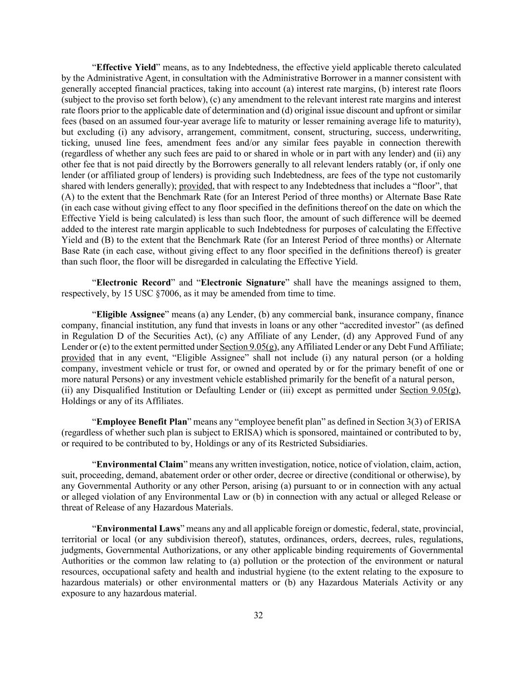 32 “Effective Yield” means, as to any Indebtedness, the effective yield applicable thereto calculated by the Administrative Agent, in consultation with the Administrative Borrower in a manner consistent with generally accepted financial practices, taking into account (a) interest rate margins, (b) interest rate floors (subject to the proviso set forth below), (c) any amendment to the relevant interest rate margins and interest rate floors prior to the applicable date of determination and (d) original issue discount and upfront or similar fees (based on an assumed four-year average life to maturity or lesser remaining average life to maturity), but excluding (i) any advisory, arrangement, commitment, consent, structuring, success, underwriting, ticking, unused line fees, amendment fees and/or any similar fees payable in connection therewith (regardless of whether any such fees are paid to or shared in whole or in part with any lender) and (ii) any other fee that is not paid directly by the Borrowers generally to all relevant lenders ratably (or, if only one lender (or affiliated group of lenders) is providing such Indebtedness, are fees of the type not customarily shared with lenders generally); provided, that with respect to any Indebtedness that includes a “floor”, that (A) to the extent that the Benchmark Rate (for an Interest Period of three months) or Alternate Base Rate (in each case without giving effect to any floor specified in the definitions thereof on the date on which the Effective Yield is being calculated) is less than such floor, the amount of such difference will be deemed added to the interest rate margin applicable to such Indebtedness for purposes of calculating the Effective Yield and (B) to the extent that the Benchmark Rate (for an Interest Period of three months) or Alternate Base Rate (in each case, without giving effect to any floor specified in the definitions thereof) is greater than such floor, the floor will be disregarded in calculating the Effective Yield. “Electronic Record” and “Electronic Signature” shall have the meanings assigned to them, respectively, by 15 USC §7006, as it may be amended from time to time. “Eligible Assignee” means (a) any Lender, (b) any commercial bank, insurance company, finance company, financial institution, any fund that invests in loans or any other “accredited investor” (as defined in Regulation D of the Securities Act), (c) any Affiliate of any Lender, (d) any Approved Fund of any Lender or (e) to the extent permitted under Section 9.05(g), any Affiliated Lender or any Debt Fund Affiliate; provided that in any event, “Eligible Assignee” shall not include (i) any natural person (or a holding company, investment vehicle or trust for, or owned and operated by or for the primary benefit of one or more natural Persons) or any investment vehicle established primarily for the benefit of a natural person, (ii) any Disqualified Institution or Defaulting Lender or (iii) except as permitted under Section 9.05(g), Holdings or any of its Affiliates. “Employee Benefit Plan” means any “employee benefit plan” as defined in Section 3(3) of ERISA (regardless of whether such plan is subject to ERISA) which is sponsored, maintained or contributed to by, or required to be contributed to by, Holdings or any of its Restricted Subsidiaries. “Environmental Claim” means any written investigation, notice, notice of violation, claim, action, suit, proceeding, demand, abatement order or other order, decree or directive (conditional or otherwise), by any Governmental Authority or any other Person, arising (a) pursuant to or in connection with any actual or alleged violation of any Environmental Law or (b) in connection with any actual or alleged Release or threat of Release of any Hazardous Materials. “Environmental Laws” means any and all applicable foreign or domestic, federal, state, provincial, territorial or local (or any subdivision thereof), statutes, ordinances, orders, decrees, rules, regulations, judgments, Governmental Authorizations, or any other applicable binding requirements of Governmental Authorities or the common law relating to (a) pollution or the protection of the environment or natural resources, occupational safety and health and industrial hygiene (to the extent relating to the exposure to hazardous materials) or other environmental matters or (b) any Hazardous Materials Activity or any exposure to any hazardous material.