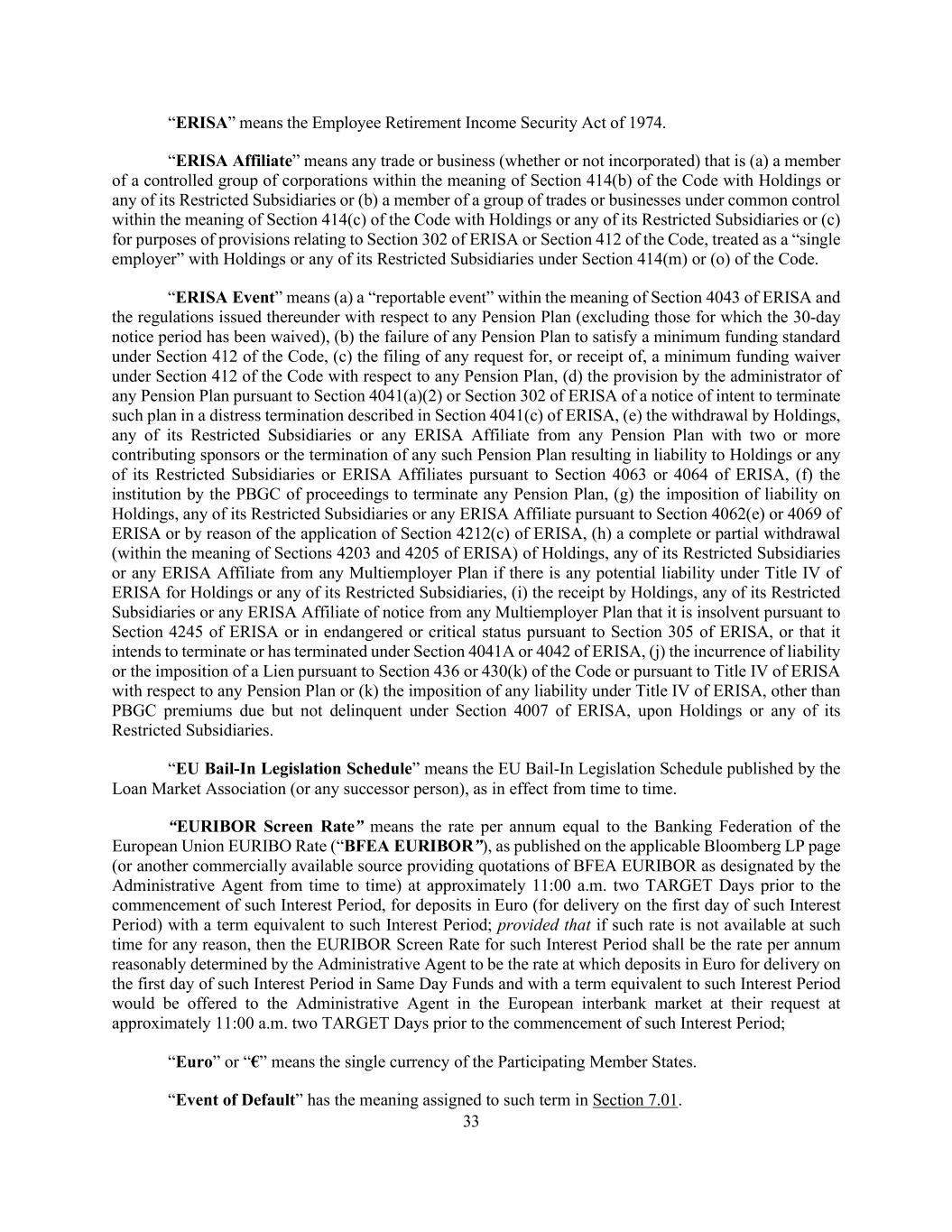 33 “ERISA” means the Employee Retirement Income Security Act of 1974. “ERISA Affiliate” means any trade or business (whether or not incorporated) that is (a) a member of a controlled group of corporations within the meaning of Section 414(b) of the Code with Holdings or any of its Restricted Subsidiaries or (b) a member of a group of trades or businesses under common control within the meaning of Section 414(c) of the Code with Holdings or any of its Restricted Subsidiaries or (c) for purposes of provisions relating to Section 302 of ERISA or Section 412 of the Code, treated as a “single employer” with Holdings or any of its Restricted Subsidiaries under Section 414(m) or (o) of the Code. “ERISA Event” means (a) a “reportable event” within the meaning of Section 4043 of ERISA and the regulations issued thereunder with respect to any Pension Plan (excluding those for which the 30-day notice period has been waived), (b) the failure of any Pension Plan to satisfy a minimum funding standard under Section 412 of the Code, (c) the filing of any request for, or receipt of, a minimum funding waiver under Section 412 of the Code with respect to any Pension Plan, (d) the provision by the administrator of any Pension Plan pursuant to Section 4041(a)(2) or Section 302 of ERISA of a notice of intent to terminate such plan in a distress termination described in Section 4041(c) of ERISA, (e) the withdrawal by Holdings, any of its Restricted Subsidiaries or any ERISA Affiliate from any Pension Plan with two or more contributing sponsors or the termination of any such Pension Plan resulting in liability to Holdings or any of its Restricted Subsidiaries or ERISA Affiliates pursuant to Section 4063 or 4064 of ERISA, (f) the institution by the PBGC of proceedings to terminate any Pension Plan, (g) the imposition of liability on Holdings, any of its Restricted Subsidiaries or any ERISA Affiliate pursuant to Section 4062(e) or 4069 of ERISA or by reason of the application of Section 4212(c) of ERISA, (h) a complete or partial withdrawal (within the meaning of Sections 4203 and 4205 of ERISA) of Holdings, any of its Restricted Subsidiaries or any ERISA Affiliate from any Multiemployer Plan if there is any potential liability under Title IV of ERISA for Holdings or any of its Restricted Subsidiaries, (i) the receipt by Holdings, any of its Restricted Subsidiaries or any ERISA Affiliate of notice from any Multiemployer Plan that it is insolvent pursuant to Section 4245 of ERISA or in endangered or critical status pursuant to Section 305 of ERISA, or that it intends to terminate or has terminated under Section 4041A or 4042 of ERISA, (j) the incurrence of liability or the imposition of a Lien pursuant to Section 436 or 430(k) of the Code or pursuant to Title IV of ERISA with respect to any Pension Plan or (k) the imposition of any liability under Title IV of ERISA, other than PBGC premiums due but not delinquent under Section 4007 of ERISA, upon Holdings or any of its Restricted Subsidiaries. “EU Bail-In Legislation Schedule” means the EU Bail-In Legislation Schedule published by the Loan Market Association (or any successor person), as in effect from time to time. “EURIBOR Screen Rate” means the rate per annum equal to the Banking Federation of the European Union EURIBO Rate (“BFEA EURIBOR”), as published on the applicable Bloomberg LP page (or another commercially available source providing quotations of BFEA EURIBOR as designated by the Administrative Agent from time to time) at approximately 11:00 a.m. two TARGET Days prior to the commencement of such Interest Period, for deposits in Euro (for delivery on the first day of such Interest Period) with a term equivalent to such Interest Period; provided that if such rate is not available at such time for any reason, then the EURIBOR Screen Rate for such Interest Period shall be the rate per annum reasonably determined by the Administrative Agent to be the rate at which deposits in Euro for delivery on the first day of such Interest Period in Same Day Funds and with a term equivalent to such Interest Period would be offered to the Administrative Agent in the European interbank market at their request at approximately 11:00 a.m. two TARGET Days prior to the commencement of such Interest Period; “Euro” or “€” means the single currency of the Participating Member States. “Event of Default” has the meaning assigned to such term in Section 7.01.