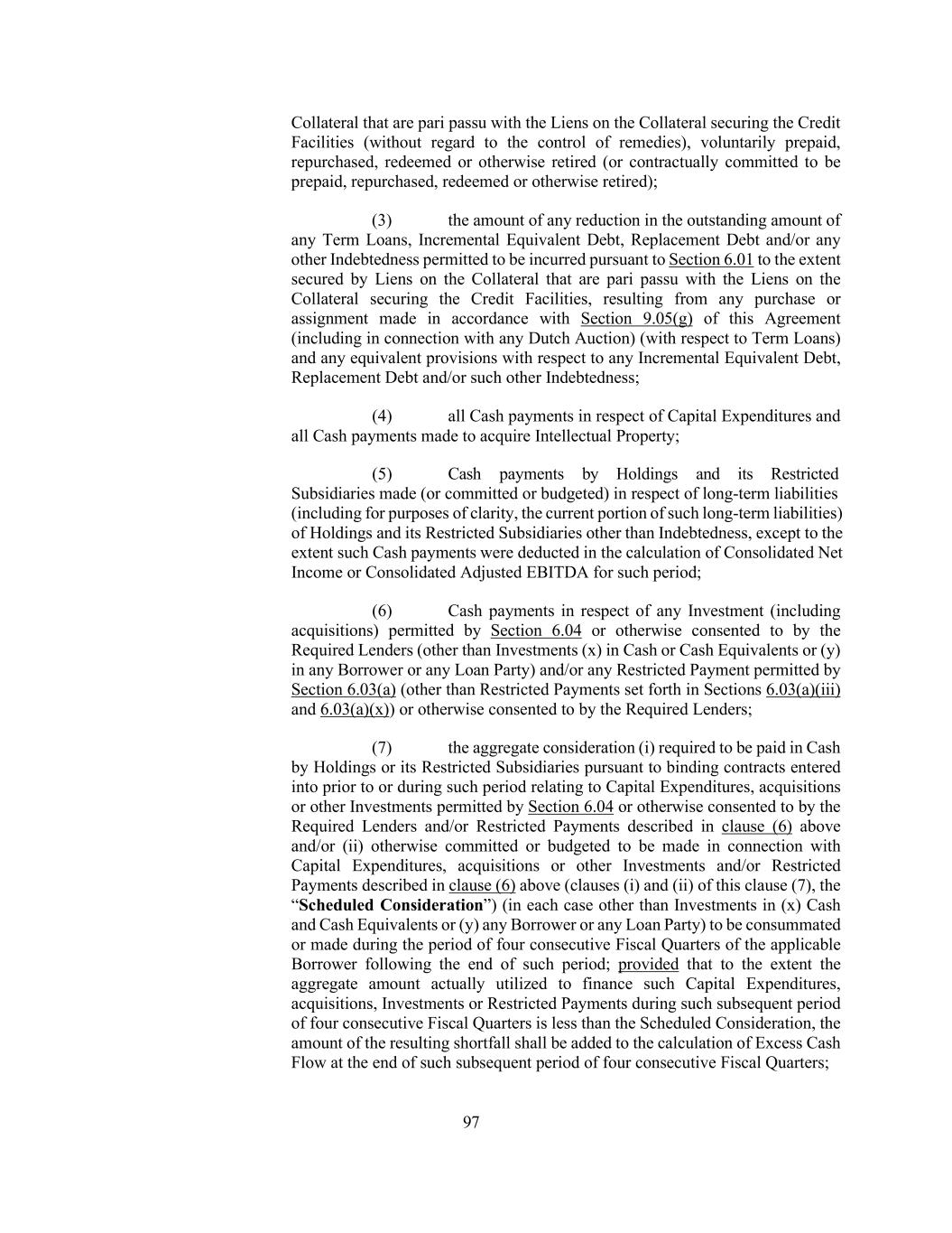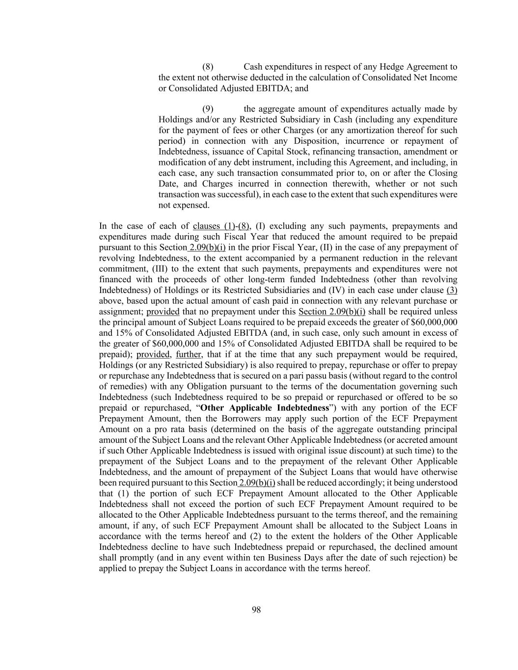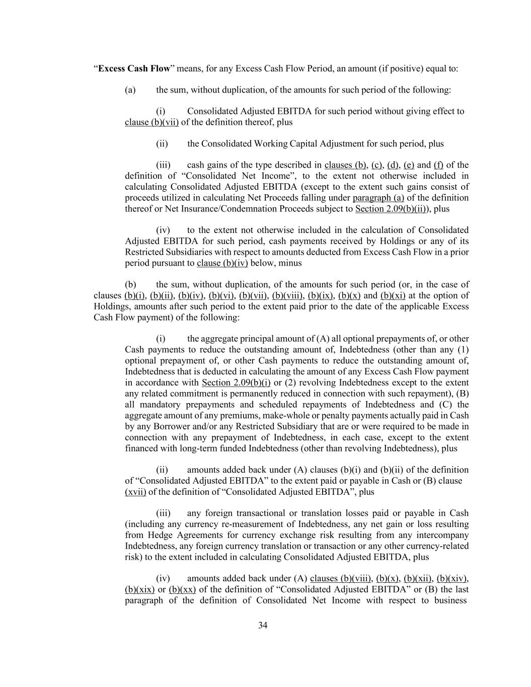34 “Excess Cash Flow” means, for any Excess Cash Flow Period, an amount (if positive) equal to: (a) the sum, without duplication, of the amounts for such period of the following: (i) Consolidated Adjusted EBITDA for such period without giving effect to clause (b)(vii) of the definition thereof, plus (ii) the Consolidated Working Capital Adjustment for such period, plus (iii) cash gains of the type described in clauses (b), (c), (d), (e) and (f) of the definition of “Consolidated Net Income”, to the extent not otherwise included in calculating Consolidated Adjusted EBITDA (except to the extent such gains consist of proceeds utilized in calculating Net Proceeds falling under paragraph (a) of the definition thereof or Net Insurance/Condemnation Proceeds subject to Section 2.09(b)(ii)), plus (iv) to the extent not otherwise included in the calculation of Consolidated Adjusted EBITDA for such period, cash payments received by Holdings or any of its Restricted Subsidiaries with respect to amounts deducted from Excess Cash Flow in a prior period pursuant to clause (b)(iv) below, minus (b) the sum, without duplication, of the amounts for such period (or, in the case of clauses (b)(i), (b)(ii), (b)(iv), (b)(vi), (b)(vii), (b)(viii), (b)(ix), (b)(x) and (b)(xi) at the option of Holdings, amounts after such period to the extent paid prior to the date of the applicable Excess Cash Flow payment) of the following: (i) the aggregate principal amount of (A) all optional prepayments of, or other Cash payments to reduce the outstanding amount of, Indebtedness (other than any (1) optional prepayment of, or other Cash payments to reduce the outstanding amount of, Indebtedness that is deducted in calculating the amount of any Excess Cash Flow payment in accordance with Section 2.09(b)(i) or (2) revolving Indebtedness except to the extent any related commitment is permanently reduced in connection with such repayment), (B) all mandatory prepayments and scheduled repayments of Indebtedness and (C) the aggregate amount of any premiums, make-whole or penalty payments actually paid in Cash by any Borrower and/or any Restricted Subsidiary that are or were required to be made in connection with any prepayment of Indebtedness, in each case, except to the extent financed with long-term funded Indebtedness (other than revolving Indebtedness), plus (ii) amounts added back under (A) clauses (b)(i) and (b)(ii) of the definition of “Consolidated Adjusted EBITDA” to the extent paid or payable in Cash or (B) clause (xvii) of the definition of “Consolidated Adjusted EBITDA”, plus (iii) any foreign transactional or translation losses paid or payable in Cash (including any currency re-measurement of Indebtedness, any net gain or loss resulting from Hedge Agreements for currency exchange risk resulting from any intercompany Indebtedness, any foreign currency translation or transaction or any other currency-related risk) to the extent included in calculating Consolidated Adjusted EBITDA, plus (iv) amounts added back under (A) clauses (b)(viii), (b)(x), (b)(xii), (b)(xiv), (b)(xix) or (b)(xx) of the definition of “Consolidated Adjusted EBITDA” or (B) the last paragraph of the definition of Consolidated Net Income with respect to business