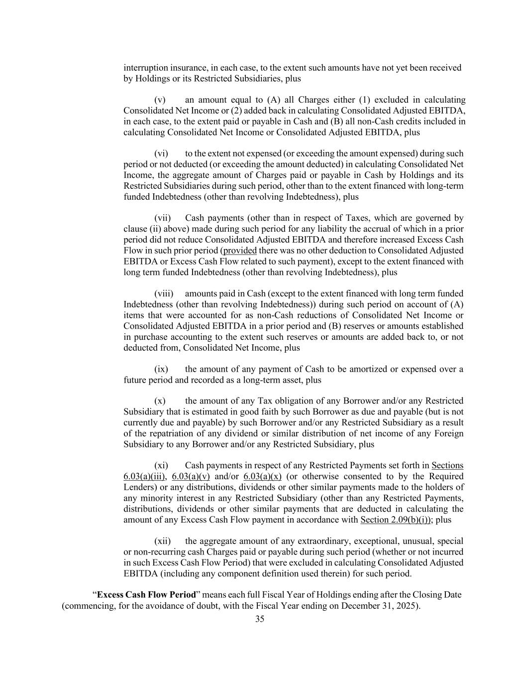 35 interruption insurance, in each case, to the extent such amounts have not yet been received by Holdings or its Restricted Subsidiaries, plus (v) an amount equal to (A) all Charges either (1) excluded in calculating Consolidated Net Income or (2) added back in calculating Consolidated Adjusted EBITDA, in each case, to the extent paid or payable in Cash and (B) all non-Cash credits included in calculating Consolidated Net Income or Consolidated Adjusted EBITDA, plus (vi) to the extent not expensed (or exceeding the amount expensed) during such period or not deducted (or exceeding the amount deducted) in calculating Consolidated Net Income, the aggregate amount of Charges paid or payable in Cash by Holdings and its Restricted Subsidiaries during such period, other than to the extent financed with long-term funded Indebtedness (other than revolving Indebtedness), plus (vii) Cash payments (other than in respect of Taxes, which are governed by clause (ii) above) made during such period for any liability the accrual of which in a prior period did not reduce Consolidated Adjusted EBITDA and therefore increased Excess Cash Flow in such prior period (provided there was no other deduction to Consolidated Adjusted EBITDA or Excess Cash Flow related to such payment), except to the extent financed with long term funded Indebtedness (other than revolving Indebtedness), plus (viii) amounts paid in Cash (except to the extent financed with long term funded Indebtedness (other than revolving Indebtedness)) during such period on account of (A) items that were accounted for as non-Cash reductions of Consolidated Net Income or Consolidated Adjusted EBITDA in a prior period and (B) reserves or amounts established in purchase accounting to the extent such reserves or amounts are added back to, or not deducted from, Consolidated Net Income, plus (ix) the amount of any payment of Cash to be amortized or expensed over a future period and recorded as a long-term asset, plus (x) the amount of any Tax obligation of any Borrower and/or any Restricted Subsidiary that is estimated in good faith by such Borrower as due and payable (but is not currently due and payable) by such Borrower and/or any Restricted Subsidiary as a result of the repatriation of any dividend or similar distribution of net income of any Foreign Subsidiary to any Borrower and/or any Restricted Subsidiary, plus (xi) Cash payments in respect of any Restricted Payments set forth in Sections 6.03(a)(iii), 6.03(a)(v) and/or 6.03(a)(x) (or otherwise consented to by the Required Lenders) or any distributions, dividends or other similar payments made to the holders of any minority interest in any Restricted Subsidiary (other than any Restricted Payments, distributions, dividends or other similar payments that are deducted in calculating the amount of any Excess Cash Flow payment in accordance with Section 2.09(b)(i)); plus (xii) the aggregate amount of any extraordinary, exceptional, unusual, special or non-recurring cash Charges paid or payable during such period (whether or not incurred in such Excess Cash Flow Period) that were excluded in calculating Consolidated Adjusted EBITDA (including any component definition used therein) for such period. “Excess Cash Flow Period” means each full Fiscal Year of Holdings ending after the Closing Date (commencing, for the avoidance of doubt, with the Fiscal Year ending on December 31, 2025).