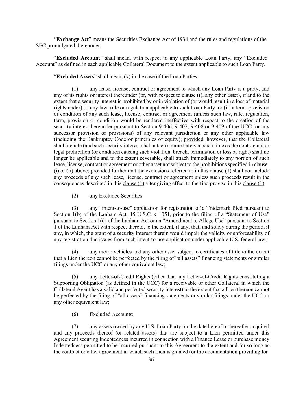 36 “Exchange Act” means the Securities Exchange Act of 1934 and the rules and regulations of the SEC promulgated thereunder. “Excluded Account” shall mean, with respect to any applicable Loan Party, any “Excluded Account” as defined in each applicable Collateral Document to the extent applicable to such Loan Party. “Excluded Assets” shall mean, (x) in the case of the Loan Parties: (1) any lease, license, contract or agreement to which any Loan Party is a party, and any of its rights or interest thereunder (or, with respect to clause (i), any other asset), if and to the extent that a security interest is prohibited by or in violation of (or would result in a loss of material rights under) (i) any law, rule or regulation applicable to such Loan Party, or (ii) a term, provision or condition of any such lease, license, contract or agreement (unless such law, rule, regulation, term, provision or condition would be rendered ineffective with respect to the creation of the security interest hereunder pursuant to Section 9-406, 9-407, 9-408 or 9-409 of the UCC (or any successor provision or provisions) of any relevant jurisdiction or any other applicable law (including the Bankruptcy Code or principles of equity); provided, however, that the Collateral shall include (and such security interest shall attach) immediately at such time as the contractual or legal prohibition (or condition causing such violation, breach, termination or loss of right) shall no longer be applicable and to the extent severable, shall attach immediately to any portion of such lease, license, contract or agreement or other asset not subject to the prohibitions specified in clause (i) or (ii) above; provided further that the exclusions referred to in this clause (1) shall not include any proceeds of any such lease, license, contract or agreement unless such proceeds result in the consequences described in this clause (1) after giving effect to the first proviso in this clause (1); (2) any Excluded Securities; (3) any “intent-to-use” application for registration of a Trademark filed pursuant to Section 1(b) of the Lanham Act, 15 U.S.C. § 1051, prior to the filing of a “Statement of Use” pursuant to Section 1(d) of the Lanham Act or an “Amendment to Allege Use” pursuant to Section 1 of the Lanham Act with respect thereto, to the extent, if any, that, and solely during the period, if any, in which, the grant of a security interest therein would impair the validity or enforceability of any registration that issues from such intent-to-use application under applicable U.S. federal law; (4) any motor vehicles and any other asset subject to certificates of title to the extent that a Lien thereon cannot be perfected by the filing of “all assets” financing statements or similar filings under the UCC or any other equivalent law; (5) any Letter-of-Credit Rights (other than any Letter-of-Credit Rights constituting a Supporting Obligation (as defined in the UCC) for a receivable or other Collateral in which the Collateral Agent has a valid and perfected security interest) to the extent that a Lien thereon cannot be perfected by the filing of “all assets” financing statements or similar filings under the UCC or any other equivalent law; (6) Excluded Accounts; (7) any assets owned by any U.S. Loan Party on the date hereof or hereafter acquired and any proceeds thereof (or related assets) that are subject to a Lien permitted under this Agreement securing Indebtedness incurred in connection with a Finance Lease or purchase money Indebtedness permitted to be incurred pursuant to this Agreement to the extent and for so long as the contract or other agreement in which such Lien is granted (or the documentation providing for