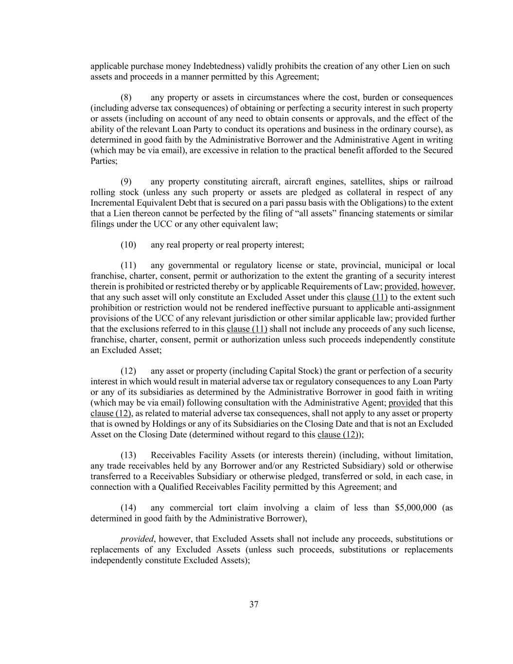 37 applicable purchase money Indebtedness) validly prohibits the creation of any other Lien on such assets and proceeds in a manner permitted by this Agreement; (8) any property or assets in circumstances where the cost, burden or consequences (including adverse tax consequences) of obtaining or perfecting a security interest in such property or assets (including on account of any need to obtain consents or approvals, and the effect of the ability of the relevant Loan Party to conduct its operations and business in the ordinary course), as determined in good faith by the Administrative Borrower and the Administrative Agent in writing (which may be via email), are excessive in relation to the practical benefit afforded to the Secured Parties; (9) any property constituting aircraft, aircraft engines, satellites, ships or railroad rolling stock (unless any such property or assets are pledged as collateral in respect of any Incremental Equivalent Debt that is secured on a pari passu basis with the Obligations) to the extent that a Lien thereon cannot be perfected by the filing of “all assets” financing statements or similar filings under the UCC or any other equivalent law; (10) any real property or real property interest; (11) any governmental or regulatory license or state, provincial, municipal or local franchise, charter, consent, permit or authorization to the extent the granting of a security interest therein is prohibited or restricted thereby or by applicable Requirements of Law; provided, however, that any such asset will only constitute an Excluded Asset under this clause (11) to the extent such prohibition or restriction would not be rendered ineffective pursuant to applicable anti-assignment provisions of the UCC of any relevant jurisdiction or other similar applicable law; provided further that the exclusions referred to in this clause (11) shall not include any proceeds of any such license, franchise, charter, consent, permit or authorization unless such proceeds independently constitute an Excluded Asset; (12) any asset or property (including Capital Stock) the grant or perfection of a security interest in which would result in material adverse tax or regulatory consequences to any Loan Party or any of its subsidiaries as determined by the Administrative Borrower in good faith in writing (which may be via email) following consultation with the Administrative Agent; provided that this clause (12), as related to material adverse tax consequences, shall not apply to any asset or property that is owned by Holdings or any of its Subsidiaries on the Closing Date and that is not an Excluded Asset on the Closing Date (determined without regard to this clause (12)); (13) Receivables Facility Assets (or interests therein) (including, without limitation, any trade receivables held by any Borrower and/or any Restricted Subsidiary) sold or otherwise transferred to a Receivables Subsidiary or otherwise pledged, transferred or sold, in each case, in connection with a Qualified Receivables Facility permitted by this Agreement; and (14) any commercial tort claim involving a claim of less than $5,000,000 (as determined in good faith by the Administrative Borrower), provided, however, that Excluded Assets shall not include any proceeds, substitutions or replacements of any Excluded Assets (unless such proceeds, substitutions or replacements independently constitute Excluded Assets);