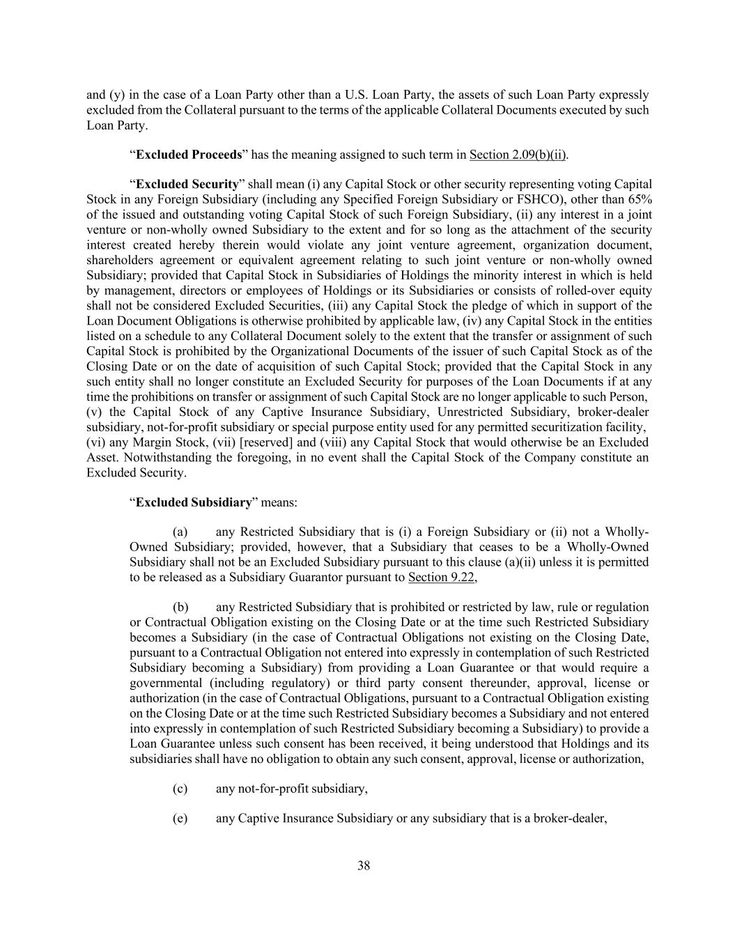38 and (y) in the case of a Loan Party other than a U.S. Loan Party, the assets of such Loan Party expressly excluded from the Collateral pursuant to the terms of the applicable Collateral Documents executed by such Loan Party. “Excluded Proceeds” has the meaning assigned to such term in Section 2.09(b)(ii). “Excluded Security” shall mean (i) any Capital Stock or other security representing voting Capital Stock in any Foreign Subsidiary (including any Specified Foreign Subsidiary or FSHCO), other than 65% of the issued and outstanding voting Capital Stock of such Foreign Subsidiary, (ii) any interest in a joint venture or non-wholly owned Subsidiary to the extent and for so long as the attachment of the security interest created hereby therein would violate any joint venture agreement, organization document, shareholders agreement or equivalent agreement relating to such joint venture or non-wholly owned Subsidiary; provided that Capital Stock in Subsidiaries of Holdings the minority interest in which is held by management, directors or employees of Holdings or its Subsidiaries or consists of rolled-over equity shall not be considered Excluded Securities, (iii) any Capital Stock the pledge of which in support of the Loan Document Obligations is otherwise prohibited by applicable law, (iv) any Capital Stock in the entities listed on a schedule to any Collateral Document solely to the extent that the transfer or assignment of such Capital Stock is prohibited by the Organizational Documents of the issuer of such Capital Stock as of the Closing Date or on the date of acquisition of such Capital Stock; provided that the Capital Stock in any such entity shall no longer constitute an Excluded Security for purposes of the Loan Documents if at any time the prohibitions on transfer or assignment of such Capital Stock are no longer applicable to such Person, (v) the Capital Stock of any Captive Insurance Subsidiary, Unrestricted Subsidiary, broker-dealer subsidiary, not-for-profit subsidiary or special purpose entity used for any permitted securitization facility, (vi) any Margin Stock, (vii) [reserved] and (viii) any Capital Stock that would otherwise be an Excluded Asset. Notwithstanding the foregoing, in no event shall the Capital Stock of the Company constitute an Excluded Security. “Excluded Subsidiary” means: (a) any Restricted Subsidiary that is (i) a Foreign Subsidiary or (ii) not a Wholly- Owned Subsidiary; provided, however, that a Subsidiary that ceases to be a Wholly-Owned Subsidiary shall not be an Excluded Subsidiary pursuant to this clause (a)(ii) unless it is permitted to be released as a Subsidiary Guarantor pursuant to Section 9.22, (b) any Restricted Subsidiary that is prohibited or restricted by law, rule or regulation or Contractual Obligation existing on the Closing Date or at the time such Restricted Subsidiary becomes a Subsidiary (in the case of Contractual Obligations not existing on the Closing Date, pursuant to a Contractual Obligation not entered into expressly in contemplation of such Restricted Subsidiary becoming a Subsidiary) from providing a Loan Guarantee or that would require a governmental (including regulatory) or third party consent thereunder, approval, license or authorization (in the case of Contractual Obligations, pursuant to a Contractual Obligation existing on the Closing Date or at the time such Restricted Subsidiary becomes a Subsidiary and not entered into expressly in contemplation of such Restricted Subsidiary becoming a Subsidiary) to provide a Loan Guarantee unless such consent has been received, it being understood that Holdings and its subsidiaries shall have no obligation to obtain any such consent, approval, license or authorization, (c) any not-for-profit subsidiary, (e) any Captive Insurance Subsidiary or any subsidiary that is a broker-dealer,