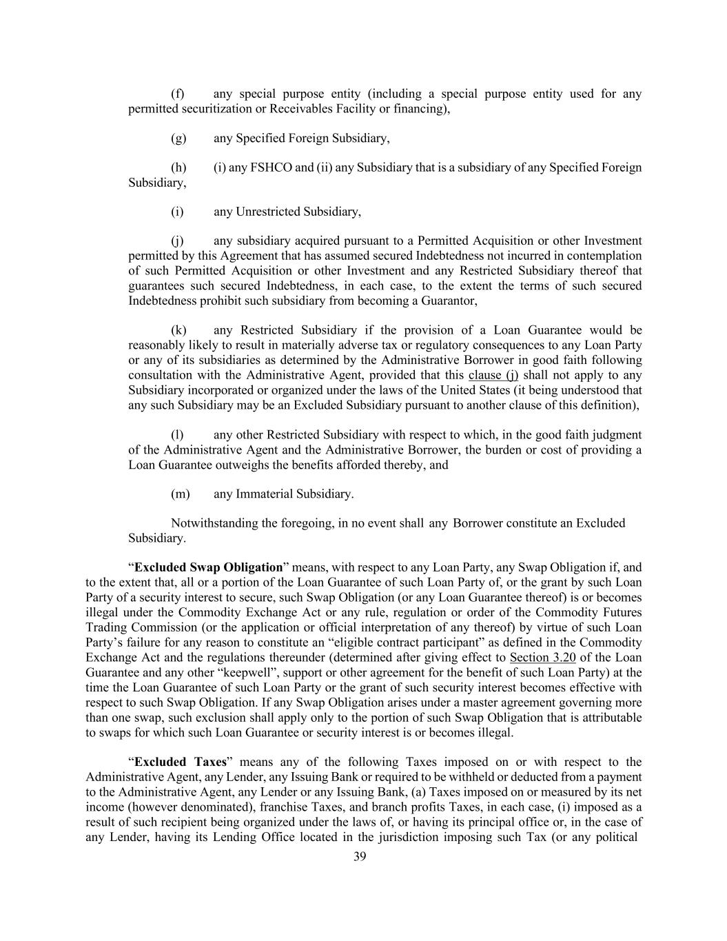 39 (f) any special purpose entity (including a special purpose entity used for any permitted securitization or Receivables Facility or financing), (g) any Specified Foreign Subsidiary, (h) (i) any FSHCO and (ii) any Subsidiary that is a subsidiary of any Specified Foreign Subsidiary, (i) any Unrestricted Subsidiary, (j) any subsidiary acquired pursuant to a Permitted Acquisition or other Investment permitted by this Agreement that has assumed secured Indebtedness not incurred in contemplation of such Permitted Acquisition or other Investment and any Restricted Subsidiary thereof that guarantees such secured Indebtedness, in each case, to the extent the terms of such secured Indebtedness prohibit such subsidiary from becoming a Guarantor, (k) any Restricted Subsidiary if the provision of a Loan Guarantee would be reasonably likely to result in materially adverse tax or regulatory consequences to any Loan Party or any of its subsidiaries as determined by the Administrative Borrower in good faith following consultation with the Administrative Agent, provided that this clause (j) shall not apply to any Subsidiary incorporated or organized under the laws of the United States (it being understood that any such Subsidiary may be an Excluded Subsidiary pursuant to another clause of this definition), (l) any other Restricted Subsidiary with respect to which, in the good faith judgment of the Administrative Agent and the Administrative Borrower, the burden or cost of providing a Loan Guarantee outweighs the benefits afforded thereby, and (m) any Immaterial Subsidiary. Notwithstanding the foregoing, in no event shall any Borrower constitute an Excluded Subsidiary. “Excluded Swap Obligation” means, with respect to any Loan Party, any Swap Obligation if, and to the extent that, all or a portion of the Loan Guarantee of such Loan Party of, or the grant by such Loan Party of a security interest to secure, such Swap Obligation (or any Loan Guarantee thereof) is or becomes illegal under the Commodity Exchange Act or any rule, regulation or order of the Commodity Futures Trading Commission (or the application or official interpretation of any thereof) by virtue of such Loan Party’s failure for any reason to constitute an “eligible contract participant” as defined in the Commodity Exchange Act and the regulations thereunder (determined after giving effect to Section 3.20 of the Loan Guarantee and any other “keepwell”, support or other agreement for the benefit of such Loan Party) at the time the Loan Guarantee of such Loan Party or the grant of such security interest becomes effective with respect to such Swap Obligation. If any Swap Obligation arises under a master agreement governing more than one swap, such exclusion shall apply only to the portion of such Swap Obligation that is attributable to swaps for which such Loan Guarantee or security interest is or becomes illegal. “Excluded Taxes” means any of the following Taxes imposed on or with respect to the Administrative Agent, any Lender, any Issuing Bank or required to be withheld or deducted from a payment to the Administrative Agent, any Lender or any Issuing Bank, (a) Taxes imposed on or measured by its net income (however denominated), franchise Taxes, and branch profits Taxes, in each case, (i) imposed as a result of such recipient being organized under the laws of, or having its principal office or, in the case of any Lender, having its Lending Office located in the jurisdiction imposing such Tax (or any political