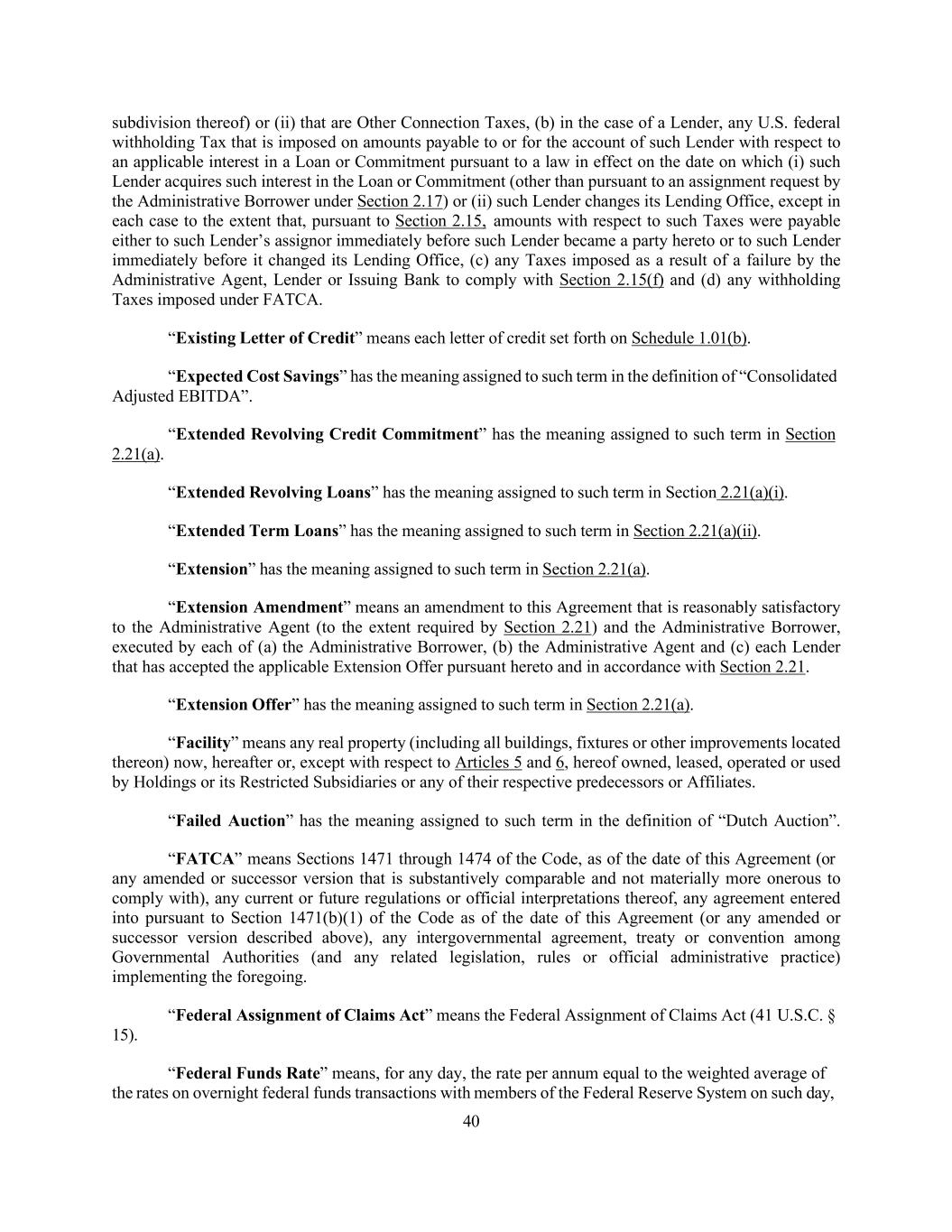 40 subdivision thereof) or (ii) that are Other Connection Taxes, (b) in the case of a Lender, any U.S. federal withholding Tax that is imposed on amounts payable to or for the account of such Lender with respect to an applicable interest in a Loan or Commitment pursuant to a law in effect on the date on which (i) such Lender acquires such interest in the Loan or Commitment (other than pursuant to an assignment request by the Administrative Borrower under Section 2.17) or (ii) such Lender changes its Lending Office, except in each case to the extent that, pursuant to Section 2.15, amounts with respect to such Taxes were payable either to such Lender’s assignor immediately before such Lender became a party hereto or to such Lender immediately before it changed its Lending Office, (c) any Taxes imposed as a result of a failure by the Administrative Agent, Lender or Issuing Bank to comply with Section 2.15(f) and (d) any withholding Taxes imposed under FATCA. “Existing Letter of Credit” means each letter of credit set forth on Schedule 1.01(b). “Expected Cost Savings” has the meaning assigned to such term in the definition of “Consolidated Adjusted EBITDA”. “Extended Revolving Credit Commitment” has the meaning assigned to such term in Section 2.21(a). “Extended Revolving Loans” has the meaning assigned to such term in Section 2.21(a)(i). “Extended Term Loans” has the meaning assigned to such term in Section 2.21(a)(ii). “Extension” has the meaning assigned to such term in Section 2.21(a). “Extension Amendment” means an amendment to this Agreement that is reasonably satisfactory to the Administrative Agent (to the extent required by Section 2.21) and the Administrative Borrower, executed by each of (a) the Administrative Borrower, (b) the Administrative Agent and (c) each Lender that has accepted the applicable Extension Offer pursuant hereto and in accordance with Section 2.21. “Extension Offer” has the meaning assigned to such term in Section 2.21(a). “Facility” means any real property (including all buildings, fixtures or other improvements located thereon) now, hereafter or, except with respect to Articles 5 and 6, hereof owned, leased, operated or used by Holdings or its Restricted Subsidiaries or any of their respective predecessors or Affiliates. “Failed Auction” has the meaning assigned to such term in the definition of “Dutch Auction”. “FATCA” means Sections 1471 through 1474 of the Code, as of the date of this Agreement (or any amended or successor version that is substantively comparable and not materially more onerous to comply with), any current or future regulations or official interpretations thereof, any agreement entered into pursuant to Section 1471(b)(1) of the Code as of the date of this Agreement (or any amended or successor version described above), any intergovernmental agreement, treaty or convention among Governmental Authorities (and any related legislation, rules or official administrative practice) implementing the foregoing. “Federal Assignment of Claims Act” means the Federal Assignment of Claims Act (41 U.S.C. § 15). “Federal Funds Rate” means, for any day, the rate per annum equal to the weighted average of the rates on overnight federal funds transactions with members of the Federal Reserve System on such day,
