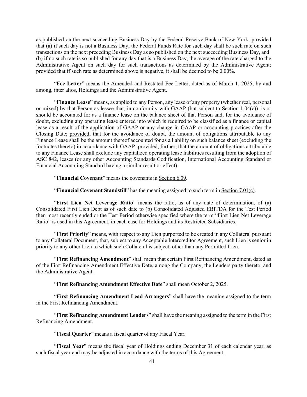 41 as published on the next succeeding Business Day by the Federal Reserve Bank of New York; provided that (a) if such day is not a Business Day, the Federal Funds Rate for such day shall be such rate on such transactions on the next preceding Business Day as so published on the next succeeding Business Day, and (b) if no such rate is so published for any day that is a Business Day, the average of the rate charged to the Administrative Agent on such day for such transactions as determined by the Administrative Agent; provided that if such rate as determined above is negative, it shall be deemed to be 0.00%. “Fee Letter” means the Amended and Restated Fee Letter, dated as of March 1, 2025, by and among, inter alios, Holdings and the Administrative Agent. “Finance Lease” means, as applied to any Person, any lease of any property (whether real, personal or mixed) by that Person as lessee that, in conformity with GAAP (but subject to Section 1.04(c)), is or should be accounted for as a finance lease on the balance sheet of that Person and, for the avoidance of doubt, excluding any operating lease entered into which is required to be classified as a finance or capital lease as a result of the application of GAAP or any change in GAAP or accounting practices after the Closing Date; provided, that for the avoidance of doubt, the amount of obligations attributable to any Finance Lease shall be the amount thereof accounted for as a liability on such balance sheet (excluding the footnotes thereto) in accordance with GAAP; provided, further, that the amount of obligations attributable to any Finance Lease shall exclude any capitalized operating lease liabilities resulting from the adoption of ASC 842, leases (or any other Accounting Standards Codification, International Accounting Standard or Financial Accounting Standard having a similar result or effect). “Financial Covenant” means the covenants in Section 6.09. “Financial Covenant Standstill” has the meaning assigned to such term in Section 7.01(c). “First Lien Net Leverage Ratio” means the ratio, as of any date of determination, of (a) Consolidated First Lien Debt as of such date to (b) Consolidated Adjusted EBITDA for the Test Period then most recently ended or the Test Period otherwise specified where the term “First Lien Net Leverage Ratio” is used in this Agreement, in each case for Holdings and its Restricted Subsidiaries. “First Priority” means, with respect to any Lien purported to be created in any Collateral pursuant to any Collateral Document, that, subject to any Acceptable Intercreditor Agreement, such Lien is senior in priority to any other Lien to which such Collateral is subject, other than any Permitted Lien. “First Refinancing Amendment” shall mean that certain First Refinancing Amendment, dated as of the First Refinancing Amendment Effective Date, among the Company, the Lenders party thereto, and the Administrative Agent. “First Refinancing Amendment Effective Date” shall mean October 2, 2025. “First Refinancing Amendment Lead Arrangers” shall have the meaning assigned to the term in the First Refinancing Amendment. “First Refinancing Amendment Lenders” shall have the meaning assigned to the term in the First Refinancing Amendment. “Fiscal Quarter” means a fiscal quarter of any Fiscal Year. “Fiscal Year” means the fiscal year of Holdings ending December 31 of each calendar year, as such fiscal year end may be adjusted in accordance with the terms of this Agreement.