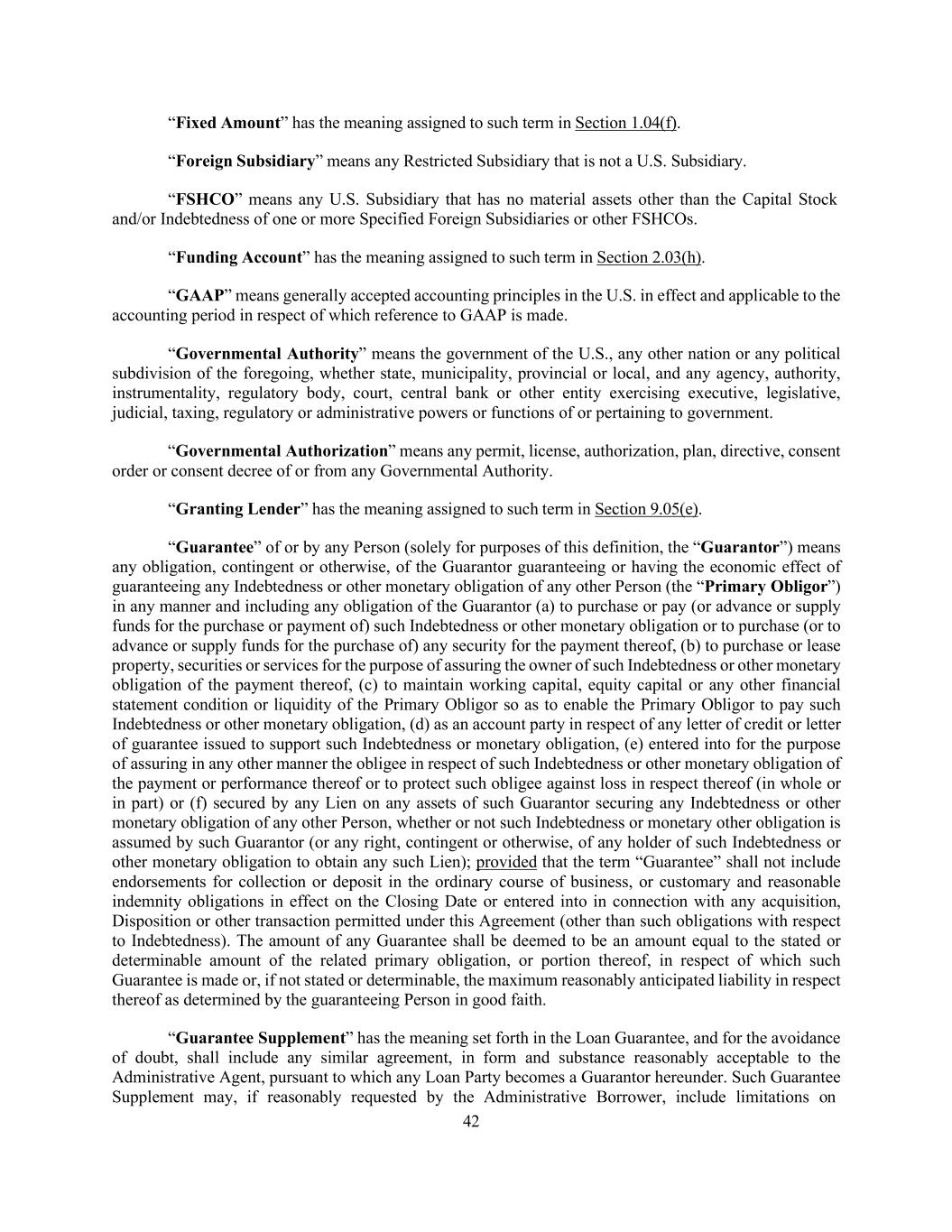 42 “Fixed Amount” has the meaning assigned to such term in Section 1.04(f). “Foreign Subsidiary” means any Restricted Subsidiary that is not a U.S. Subsidiary. “FSHCO” means any U.S. Subsidiary that has no material assets other than the Capital Stock and/or Indebtedness of one or more Specified Foreign Subsidiaries or other FSHCOs. “Funding Account” has the meaning assigned to such term in Section 2.03(h). “GAAP” means generally accepted accounting principles in the U.S. in effect and applicable to the accounting period in respect of which reference to GAAP is made. “Governmental Authority” means the government of the U.S., any other nation or any political subdivision of the foregoing, whether state, municipality, provincial or local, and any agency, authority, instrumentality, regulatory body, court, central bank or other entity exercising executive, legislative, judicial, taxing, regulatory or administrative powers or functions of or pertaining to government. “Governmental Authorization” means any permit, license, authorization, plan, directive, consent order or consent decree of or from any Governmental Authority. “Granting Lender” has the meaning assigned to such term in Section 9.05(e). “Guarantee” of or by any Person (solely for purposes of this definition, the “Guarantor”) means any obligation, contingent or otherwise, of the Guarantor guaranteeing or having the economic effect of guaranteeing any Indebtedness or other monetary obligation of any other Person (the “Primary Obligor”) in any manner and including any obligation of the Guarantor (a) to purchase or pay (or advance or supply funds for the purchase or payment of) such Indebtedness or other monetary obligation or to purchase (or to advance or supply funds for the purchase of) any security for the payment thereof, (b) to purchase or lease property, securities or services for the purpose of assuring the owner of such Indebtedness or other monetary obligation of the payment thereof, (c) to maintain working capital, equity capital or any other financial statement condition or liquidity of the Primary Obligor so as to enable the Primary Obligor to pay such Indebtedness or other monetary obligation, (d) as an account party in respect of any letter of credit or letter of guarantee issued to support such Indebtedness or monetary obligation, (e) entered into for the purpose of assuring in any other manner the obligee in respect of such Indebtedness or other monetary obligation of the payment or performance thereof or to protect such obligee against loss in respect thereof (in whole or in part) or (f) secured by any Lien on any assets of such Guarantor securing any Indebtedness or other monetary obligation of any other Person, whether or not such Indebtedness or monetary other obligation is assumed by such Guarantor (or any right, contingent or otherwise, of any holder of such Indebtedness or other monetary obligation to obtain any such Lien); provided that the term “Guarantee” shall not include endorsements for collection or deposit in the ordinary course of business, or customary and reasonable indemnity obligations in effect on the Closing Date or entered into in connection with any acquisition, Disposition or other transaction permitted under this Agreement (other than such obligations with respect to Indebtedness). The amount of any Guarantee shall be deemed to be an amount equal to the stated or determinable amount of the related primary obligation, or portion thereof, in respect of which such Guarantee is made or, if not stated or determinable, the maximum reasonably anticipated liability in respect thereof as determined by the guaranteeing Person in good faith. “Guarantee Supplement” has the meaning set forth in the Loan Guarantee, and for the avoidance of doubt, shall include any similar agreement, in form and substance reasonably acceptable to the Administrative Agent, pursuant to which any Loan Party becomes a Guarantor hereunder. Such Guarantee Supplement may, if reasonably requested by the Administrative Borrower, include limitations on