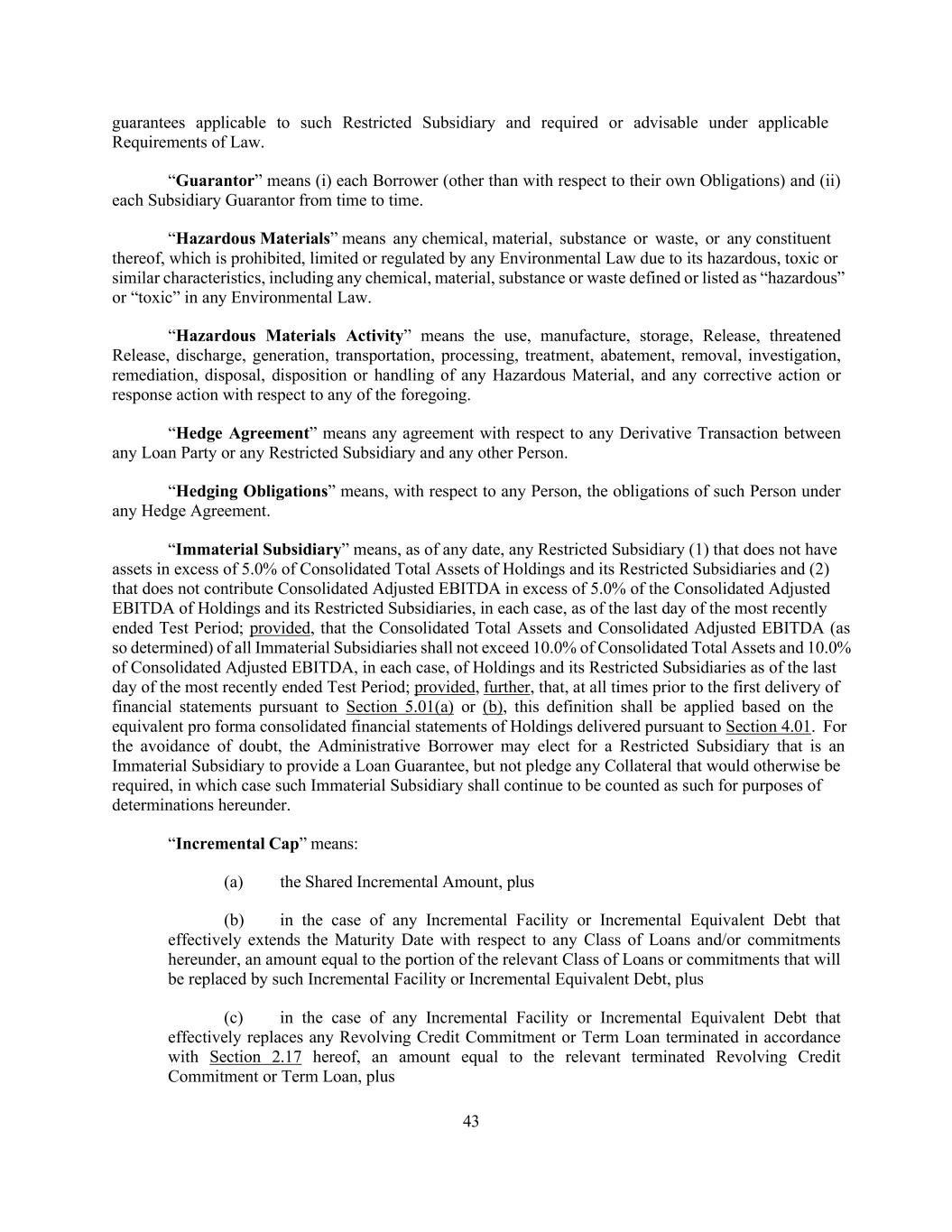 43 guarantees applicable to such Restricted Subsidiary and required or advisable under applicable Requirements of Law. “Guarantor” means (i) each Borrower (other than with respect to their own Obligations) and (ii) each Subsidiary Guarantor from time to time. “Hazardous Materials” means any chemical, material, substance or waste, or any constituent thereof, which is prohibited, limited or regulated by any Environmental Law due to its hazardous, toxic or similar characteristics, including any chemical, material, substance or waste defined or listed as “hazardous” or “toxic” in any Environmental Law. “Hazardous Materials Activity” means the use, manufacture, storage, Release, threatened Release, discharge, generation, transportation, processing, treatment, abatement, removal, investigation, remediation, disposal, disposition or handling of any Hazardous Material, and any corrective action or response action with respect to any of the foregoing. “Hedge Agreement” means any agreement with respect to any Derivative Transaction between any Loan Party or any Restricted Subsidiary and any other Person. “Hedging Obligations” means, with respect to any Person, the obligations of such Person under any Hedge Agreement. “Immaterial Subsidiary” means, as of any date, any Restricted Subsidiary (1) that does not have assets in excess of 5.0% of Consolidated Total Assets of Holdings and its Restricted Subsidiaries and (2) that does not contribute Consolidated Adjusted EBITDA in excess of 5.0% of the Consolidated Adjusted EBITDA of Holdings and its Restricted Subsidiaries, in each case, as of the last day of the most recently ended Test Period; provided, that the Consolidated Total Assets and Consolidated Adjusted EBITDA (as so determined) of all Immaterial Subsidiaries shall not exceed 10.0% of Consolidated Total Assets and 10.0% of Consolidated Adjusted EBITDA, in each case, of Holdings and its Restricted Subsidiaries as of the last day of the most recently ended Test Period; provided, further, that, at all times prior to the first delivery of financial statements pursuant to Section 5.01(a) or (b), this definition shall be applied based on the equivalent pro forma consolidated financial statements of Holdings delivered pursuant to Section 4.01. For the avoidance of doubt, the Administrative Borrower may elect for a Restricted Subsidiary that is an Immaterial Subsidiary to provide a Loan Guarantee, but not pledge any Collateral that would otherwise be required, in which case such Immaterial Subsidiary shall continue to be counted as such for purposes of determinations hereunder. “Incremental Cap” means: (a) the Shared Incremental Amount, plus (b) in the case of any Incremental Facility or Incremental Equivalent Debt that effectively extends the Maturity Date with respect to any Class of Loans and/or commitments hereunder, an amount equal to the portion of the relevant Class of Loans or commitments that will be replaced by such Incremental Facility or Incremental Equivalent Debt, plus (c) in the case of any Incremental Facility or Incremental Equivalent Debt that effectively replaces any Revolving Credit Commitment or Term Loan terminated in accordance with Section 2.17 hereof, an amount equal to the relevant terminated Revolving Credit Commitment or Term Loan, plus