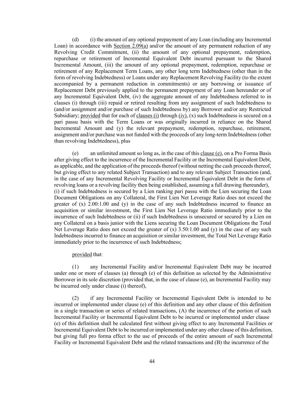 44 (d) (i) the amount of any optional prepayment of any Loan (including any Incremental Loan) in accordance with Section 2.09(a) and/or the amount of any permanent reduction of any Revolving Credit Commitment, (ii) the amount of any optional prepayment, redemption, repurchase or retirement of Incremental Equivalent Debt incurred pursuant to the Shared Incremental Amount, (iii) the amount of any optional prepayment, redemption, repurchase or retirement of any Replacement Term Loans, any other long term Indebtedness (other than in the form of revolving Indebtedness) or Loans under any Replacement Revolving Facility (to the extent accompanied by a permanent reduction in commitments) or any borrowing or issuance of Replacement Debt previously applied to the permanent prepayment of any Loan hereunder or of any Incremental Equivalent Debt, (iv) the aggregate amount of any Indebtedness referred to in clauses (i) through (iii) repaid or retired resulting from any assignment of such Indebtedness to (and/or assignment and/or purchase of such Indebtedness by) any Borrower and/or any Restricted Subsidiary; provided that for each of clauses (i) through (iv), (x) such Indebtedness is secured on a pari passu basis with the Term Loans or was originally incurred in reliance on the Shared Incremental Amount and (y) the relevant prepayment, redemption, repurchase, retirement, assignment and/or purchase was not funded with the proceeds of any long-term Indebtedness (other than revolving Indebtedness), plus (e) an unlimited amount so long as, in the case of this clause (e), on a Pro Forma Basis after giving effect to the incurrence of the Incremental Facility or the Incremental Equivalent Debt, as applicable, and the application of the proceeds thereof (without netting the cash proceeds thereof, but giving effect to any related Subject Transaction) and to any relevant Subject Transaction (and, in the case of any Incremental Revolving Facility or Incremental Equivalent Debt in the form of revolving loans or a revolving facility then being established, assuming a full drawing thereunder), (i) if such Indebtedness is secured by a Lien ranking pari passu with the Lien securing the Loan Document Obligations on any Collateral, the First Lien Net Leverage Ratio does not exceed the greater of (x) 2.00:1.00 and (y) in the case of any such Indebtedness incurred to finance an acquisition or similar investment, the First Lien Net Leverage Ratio immediately prior to the incurrence of such Indebtedness or (ii) if such Indebtedness is unsecured or secured by a Lien on any Collateral on a basis junior with the Liens securing the Loan Document Obligations the Total Net Leverage Ratio does not exceed the greater of (x) 3.50:1.00 and (y) in the case of any such Indebtedness incurred to finance an acquisition or similar investment, the Total Net Leverage Ratio immediately prior to the incurrence of such Indebtedness; provided that: (1) any Incremental Facility and/or Incremental Equivalent Debt may be incurred under one or more of clauses (a) through (e) of this definition as selected by the Administrative Borrower in its sole discretion (provided that, in the case of clause (e), an Incremental Facility may be incurred only under clause (i) thereof), (2) if any Incremental Facility or Incremental Equivalent Debt is intended to be incurred or implemented under clause (e) of this definition and any other clause of this definition in a single transaction or series of related transactions, (A) the incurrence of the portion of such Incremental Facility or Incremental Equivalent Debt to be incurred or implemented under clause (e) of this definition shall be calculated first without giving effect to any Incremental Facilities or Incremental Equivalent Debt to be incurred or implemented under any other clause of this definition, but giving full pro forma effect to the use of proceeds of the entire amount of such Incremental Facility or Incremental Equivalent Debt and the related transactions and (B) the incurrence of the