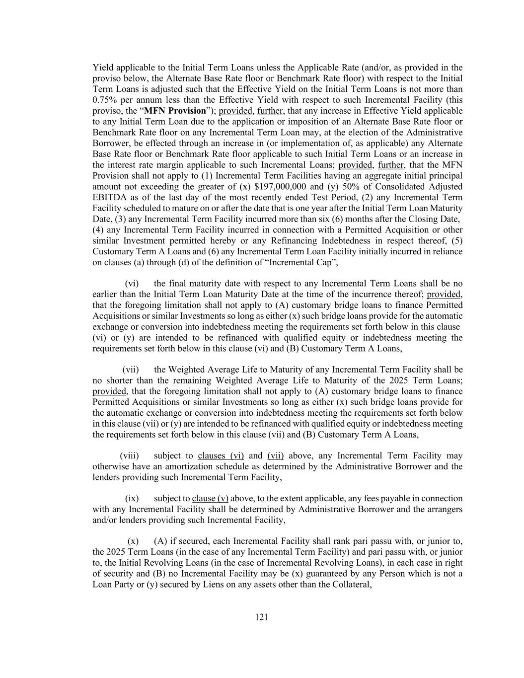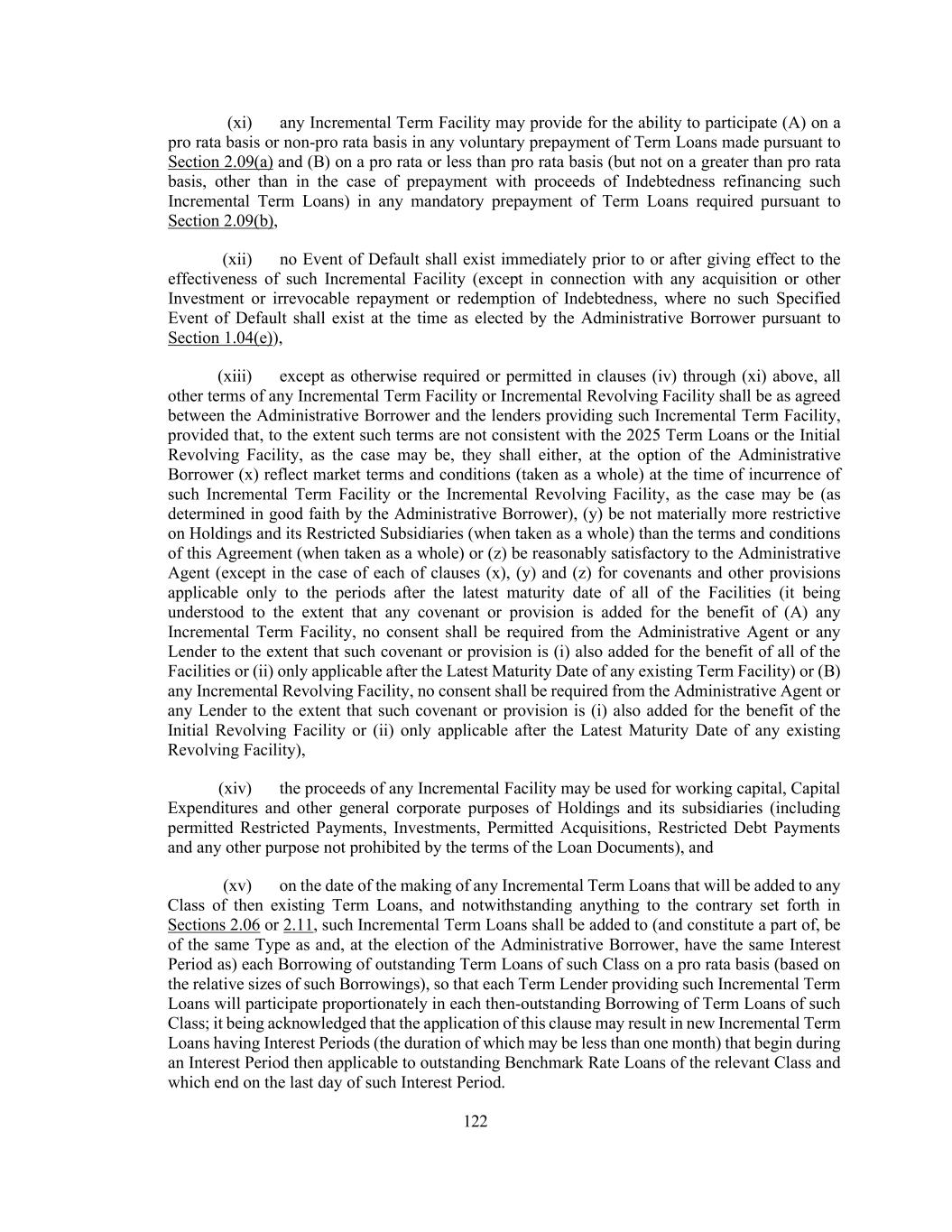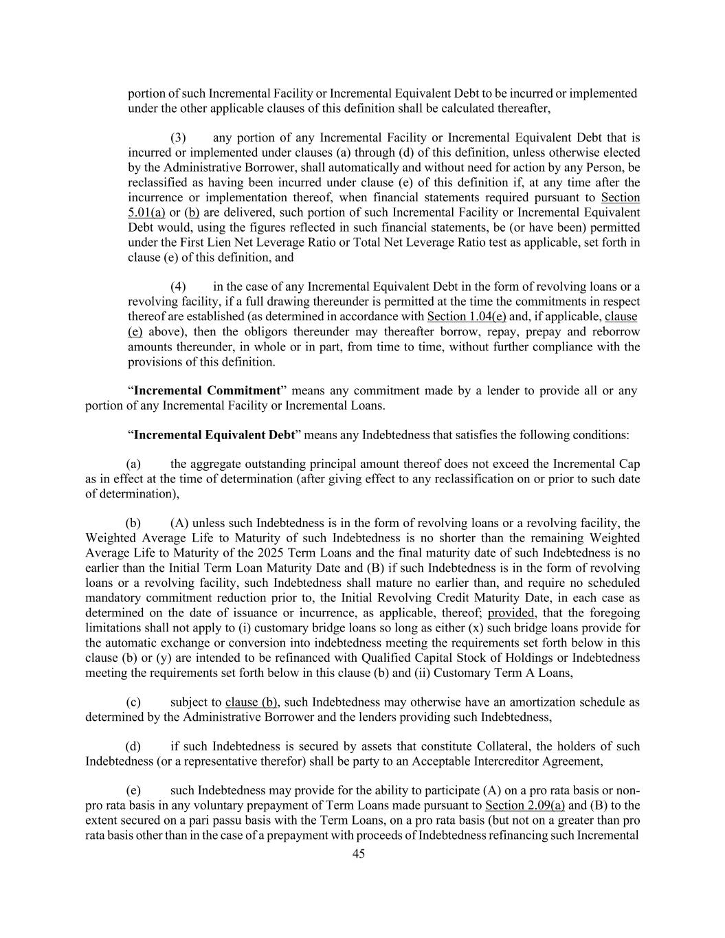 45 portion of such Incremental Facility or Incremental Equivalent Debt to be incurred or implemented under the other applicable clauses of this definition shall be calculated thereafter, (3) any portion of any Incremental Facility or Incremental Equivalent Debt that is incurred or implemented under clauses (a) through (d) of this definition, unless otherwise elected by the Administrative Borrower, shall automatically and without need for action by any Person, be reclassified as having been incurred under clause (e) of this definition if, at any time after the incurrence or implementation thereof, when financial statements required pursuant to Section 5.01(a) or (b) are delivered, such portion of such Incremental Facility or Incremental Equivalent Debt would, using the figures reflected in such financial statements, be (or have been) permitted under the First Lien Net Leverage Ratio or Total Net Leverage Ratio test as applicable, set forth in clause (e) of this definition, and (4) in the case of any Incremental Equivalent Debt in the form of revolving loans or a revolving facility, if a full drawing thereunder is permitted at the time the commitments in respect thereof are established (as determined in accordance with Section 1.04(e) and, if applicable, clause (e) above), then the obligors thereunder may thereafter borrow, repay, prepay and reborrow amounts thereunder, in whole or in part, from time to time, without further compliance with the provisions of this definition. “Incremental Commitment” means any commitment made by a lender to provide all or any portion of any Incremental Facility or Incremental Loans. “Incremental Equivalent Debt” means any Indebtedness that satisfies the following conditions: (a) the aggregate outstanding principal amount thereof does not exceed the Incremental Cap as in effect at the time of determination (after giving effect to any reclassification on or prior to such date of determination), (b) (A) unless such Indebtedness is in the form of revolving loans or a revolving facility, the Weighted Average Life to Maturity of such Indebtedness is no shorter than the remaining Weighted Average Life to Maturity of the 2025 Term Loans and the final maturity date of such Indebtedness is no earlier than the Initial Term Loan Maturity Date and (B) if such Indebtedness is in the form of revolving loans or a revolving facility, such Indebtedness shall mature no earlier than, and require no scheduled mandatory commitment reduction prior to, the Initial Revolving Credit Maturity Date, in each case as determined on the date of issuance or incurrence, as applicable, thereof; provided, that the foregoing limitations shall not apply to (i) customary bridge loans so long as either (x) such bridge loans provide for the automatic exchange or conversion into indebtedness meeting the requirements set forth below in this clause (b) or (y) are intended to be refinanced with Qualified Capital Stock of Holdings or Indebtedness meeting the requirements set forth below in this clause (b) and (ii) Customary Term A Loans, (c) subject to clause (b), such Indebtedness may otherwise have an amortization schedule as determined by the Administrative Borrower and the lenders providing such Indebtedness, (d) if such Indebtedness is secured by assets that constitute Collateral, the holders of such Indebtedness (or a representative therefor) shall be party to an Acceptable Intercreditor Agreement, (e) such Indebtedness may provide for the ability to participate (A) on a pro rata basis or non- pro rata basis in any voluntary prepayment of Term Loans made pursuant to Section 2.09(a) and (B) to the extent secured on a pari passu basis with the Term Loans, on a pro rata basis (but not on a greater than pro rata basis other than in the case of a prepayment with proceeds of Indebtedness refinancing such Incremental