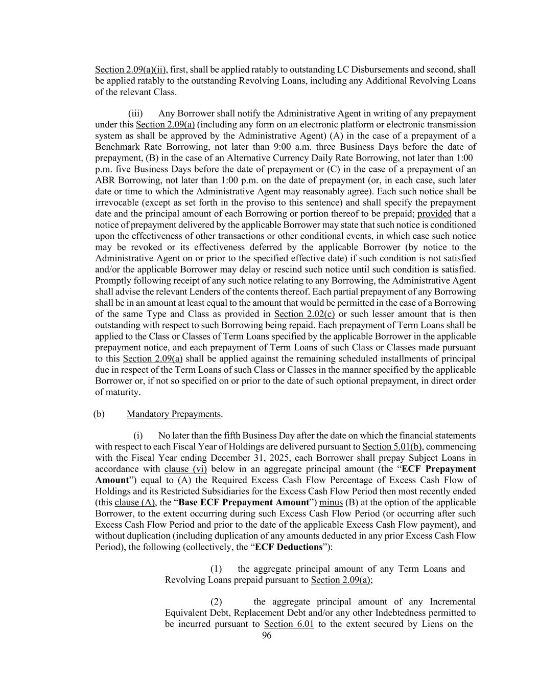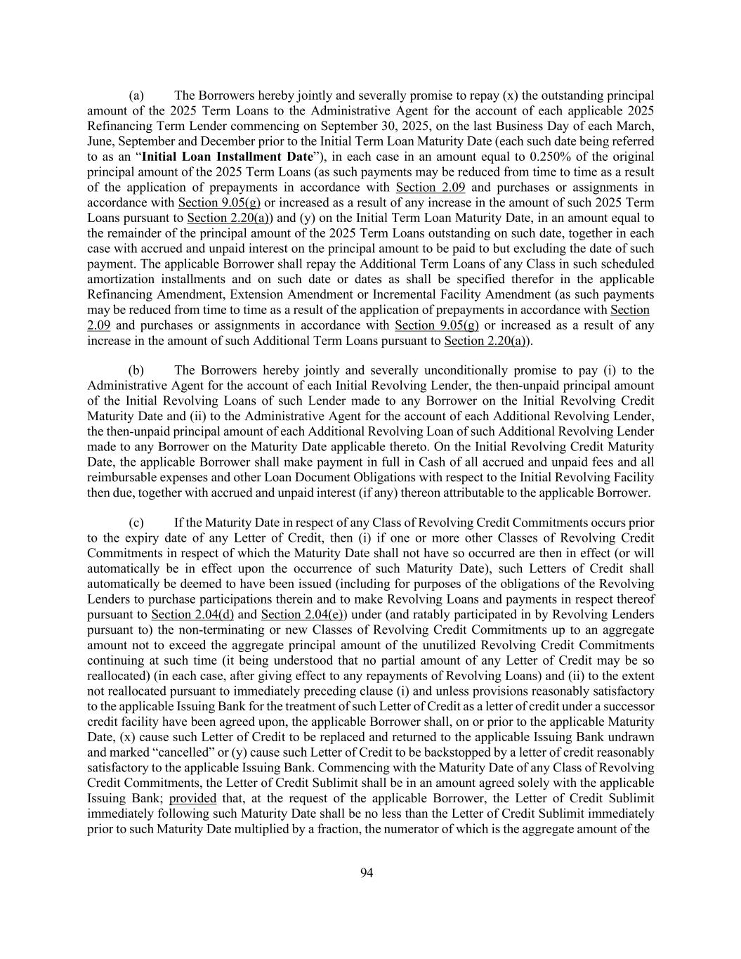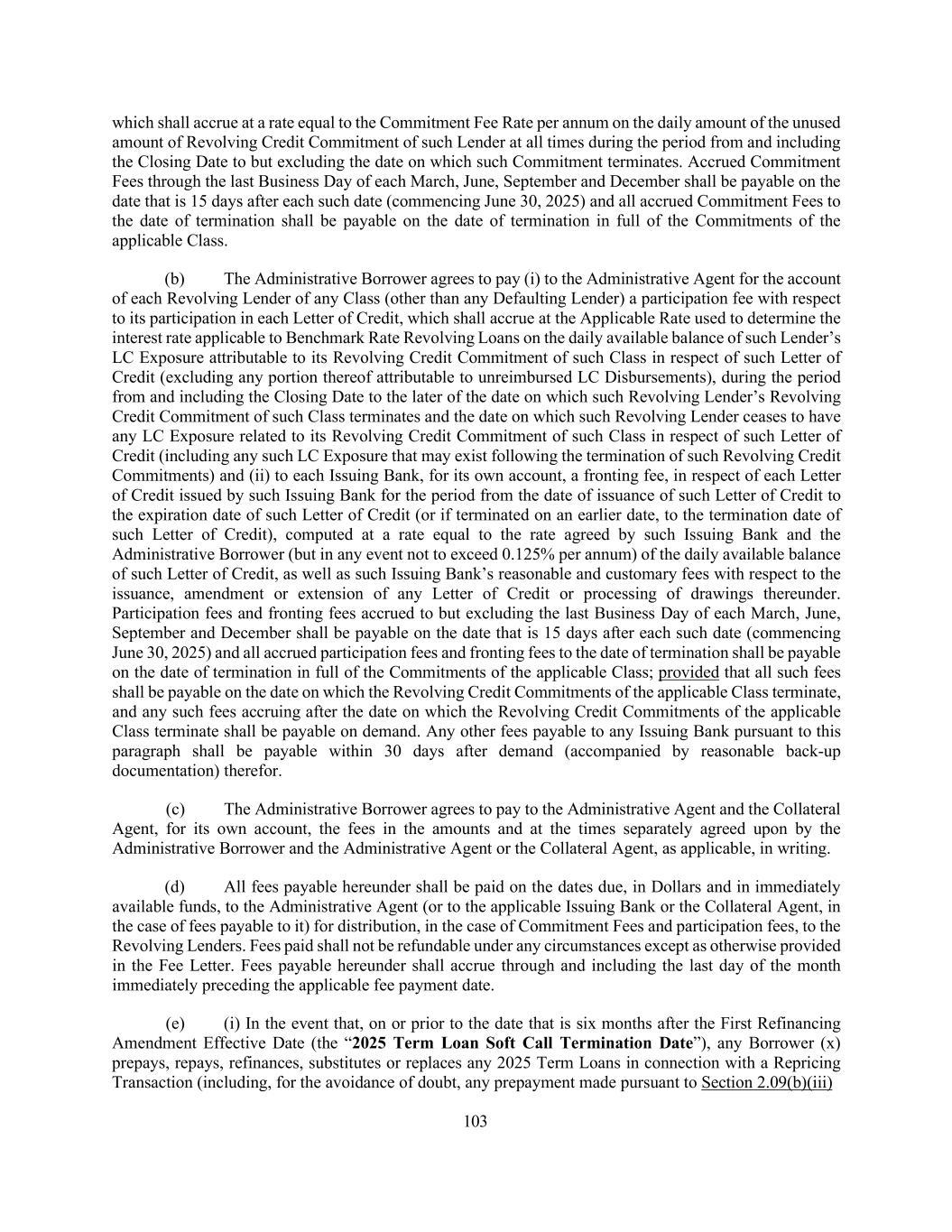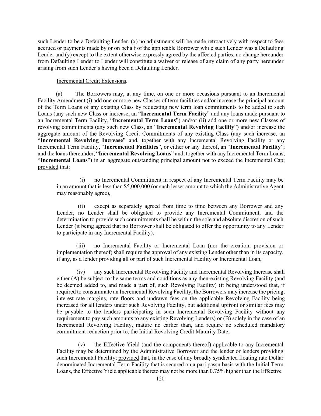45 portion of such Incremental Facility or Incremental Equivalent Debt to be incurred or implemented under the other applicable clauses of this definition shall be calculated thereafter, (3) any portion of any Incremental Facility or Incremental Equivalent Debt that is incurred or implemented under clauses (a) through (d) of this definition, unless otherwise elected by the Administrative Borrower, shall automatically and without need for action by any Person, be reclassified as having been incurred under clause (e) of this definition if, at any time after the incurrence or implementation thereof, when financial statements required pursuant to Section 5.01(a) or (b) are delivered, such portion of such Incremental Facility or Incremental Equivalent Debt would, using the figures reflected in such financial statements, be (or have been) permitted under the First Lien Net Leverage Ratio or Total Net Leverage Ratio test as applicable, set forth in clause (e) of this definition, and (4) in the case of any Incremental Equivalent Debt in the form of revolving loans or a revolving facility, if a full drawing thereunder is permitted at the time the commitments in respect thereof are established (as determined in accordance with Section 1.04(e) and, if applicable, clause (e) above), then the obligors thereunder may thereafter borrow, repay, prepay and reborrow amounts thereunder, in whole or in part, from time to time, without further compliance with the provisions of this definition. “Incremental Commitment” means any commitment made by a lender to provide all or any portion of any Incremental Facility or Incremental Loans. “Incremental Equivalent Debt” means any Indebtedness that satisfies the following conditions: (a) the aggregate outstanding principal amount thereof does not exceed the Incremental Cap as in effect at the time of determination (after giving effect to any reclassification on or prior to such date of determination), (b) (A) unless such Indebtedness is in the form of revolving loans or a revolving facility, the Weighted Average Life to Maturity of such Indebtedness is no shorter than the remaining Weighted Average Life to Maturity of the 2025 Term Loans and the final maturity date of such Indebtedness is no earlier than the Initial Term Loan Maturity Date and (B) if such Indebtedness is in the form of revolving loans or a revolving facility, such Indebtedness shall mature no earlier than, and require no scheduled mandatory commitment reduction prior to, the Initial Revolving Credit Maturity Date, in each case as determined on the date of issuance or incurrence, as applicable, thereof; provided, that the foregoing limitations shall not apply to (i) customary bridge loans so long as either (x) such bridge loans provide for the automatic exchange or conversion into indebtedness meeting the requirements set forth below in this clause (b) or (y) are intended to be refinanced with Qualified Capital Stock of Holdings or Indebtedness meeting the requirements set forth below in this clause (b) and (ii) Customary Term A Loans, (c) subject to clause (b), such Indebtedness may otherwise have an amortization schedule as determined by the Administrative Borrower and the lenders providing such Indebtedness, (d) if such Indebtedness is secured by assets that constitute Collateral, the holders of such Indebtedness (or a representative therefor) shall be party to an Acceptable Intercreditor Agreement, (e) such Indebtedness may provide for the ability to participate (A) on a pro rata basis or non- pro rata basis in any voluntary prepayment of Term Loans made pursuant to Section 2.09(a) and (B) to the extent secured on a pari passu basis with the Term Loans, on a pro rata basis (but not on a greater than pro rata basis other than in the case of a prepayment with proceeds of Indebtedness refinancing such Incremental