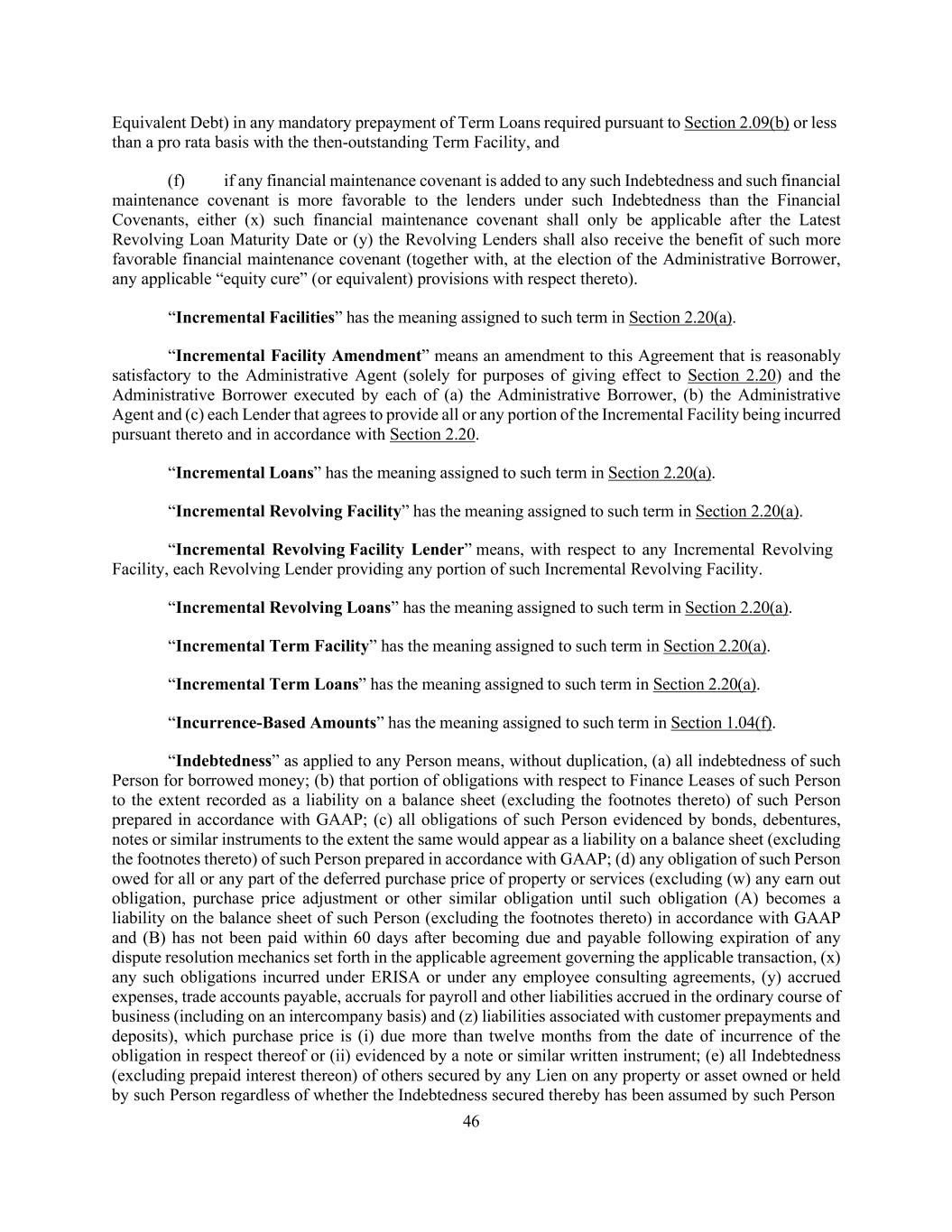 46 Equivalent Debt) in any mandatory prepayment of Term Loans required pursuant to Section 2.09(b) or less than a pro rata basis with the then-outstanding Term Facility, and (f) if any financial maintenance covenant is added to any such Indebtedness and such financial maintenance covenant is more favorable to the lenders under such Indebtedness than the Financial Covenants, either (x) such financial maintenance covenant shall only be applicable after the Latest Revolving Loan Maturity Date or (y) the Revolving Lenders shall also receive the benefit of such more favorable financial maintenance covenant (together with, at the election of the Administrative Borrower, any applicable “equity cure” (or equivalent) provisions with respect thereto). “Incremental Facilities” has the meaning assigned to such term in Section 2.20(a). “Incremental Facility Amendment” means an amendment to this Agreement that is reasonably satisfactory to the Administrative Agent (solely for purposes of giving effect to Section 2.20) and the Administrative Borrower executed by each of (a) the Administrative Borrower, (b) the Administrative Agent and (c) each Lender that agrees to provide all or any portion of the Incremental Facility being incurred pursuant thereto and in accordance with Section 2.20. “Incremental Loans” has the meaning assigned to such term in Section 2.20(a). “Incremental Revolving Facility” has the meaning assigned to such term in Section 2.20(a). “Incremental Revolving Facility Lender” means, with respect to any Incremental Revolving Facility, each Revolving Lender providing any portion of such Incremental Revolving Facility. “Incremental Revolving Loans” has the meaning assigned to such term in Section 2.20(a). “Incremental Term Facility” has the meaning assigned to such term in Section 2.20(a). “Incremental Term Loans” has the meaning assigned to such term in Section 2.20(a). “Incurrence-Based Amounts” has the meaning assigned to such term in Section 1.04(f). “Indebtedness” as applied to any Person means, without duplication, (a) all indebtedness of such Person for borrowed money; (b) that portion of obligations with respect to Finance Leases of such Person to the extent recorded as a liability on a balance sheet (excluding the footnotes thereto) of such Person prepared in accordance with GAAP; (c) all obligations of such Person evidenced by bonds, debentures, notes or similar instruments to the extent the same would appear as a liability on a balance sheet (excluding the footnotes thereto) of such Person prepared in accordance with GAAP; (d) any obligation of such Person owed for all or any part of the deferred purchase price of property or services (excluding (w) any earn out obligation, purchase price adjustment or other similar obligation until such obligation (A) becomes a liability on the balance sheet of such Person (excluding the footnotes thereto) in accordance with GAAP and (B) has not been paid within 60 days after becoming due and payable following expiration of any dispute resolution mechanics set forth in the applicable agreement governing the applicable transaction, (x) any such obligations incurred under ERISA or under any employee consulting agreements, (y) accrued expenses, trade accounts payable, accruals for payroll and other liabilities accrued in the ordinary course of business (including on an intercompany basis) and (z) liabilities associated with customer prepayments and deposits), which purchase price is (i) due more than twelve months from the date of incurrence of the obligation in respect thereof or (ii) evidenced by a note or similar written instrument; (e) all Indebtedness (excluding prepaid interest thereon) of others secured by any Lien on any property or asset owned or held by such Person regardless of whether the Indebtedness secured thereby has been assumed by such Person