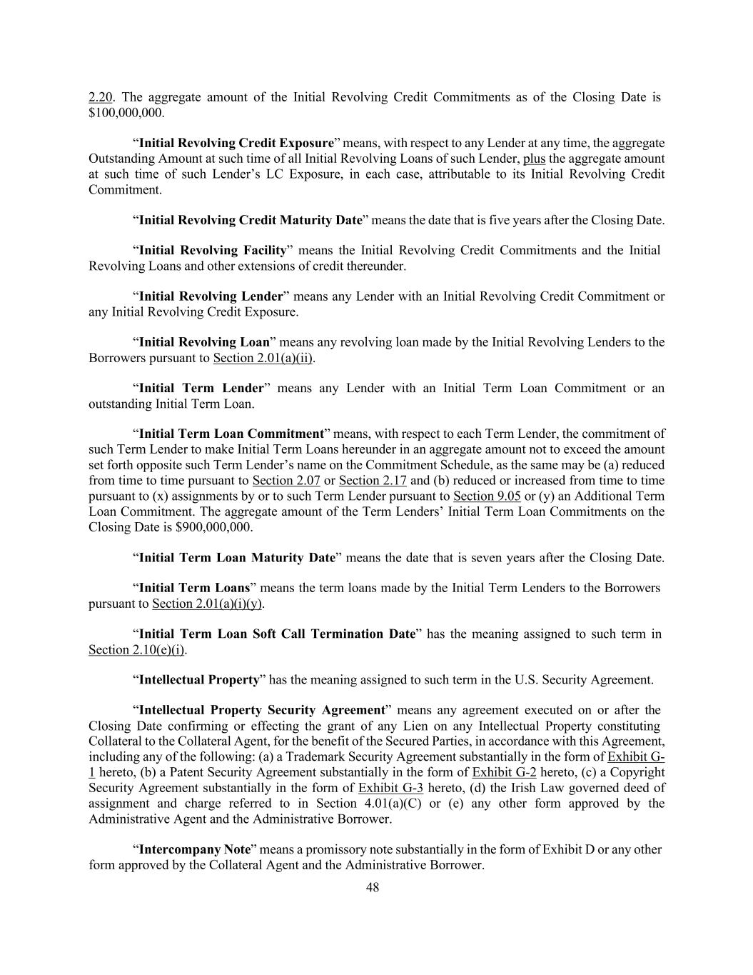 48 2.20. The aggregate amount of the Initial Revolving Credit Commitments as of the Closing Date is $100,000,000. “Initial Revolving Credit Exposure” means, with respect to any Lender at any time, the aggregate Outstanding Amount at such time of all Initial Revolving Loans of such Lender, plus the aggregate amount at such time of such Lender’s LC Exposure, in each case, attributable to its Initial Revolving Credit Commitment. “Initial Revolving Credit Maturity Date” means the date that is five years after the Closing Date. “Initial Revolving Facility” means the Initial Revolving Credit Commitments and the Initial Revolving Loans and other extensions of credit thereunder. “Initial Revolving Lender” means any Lender with an Initial Revolving Credit Commitment or any Initial Revolving Credit Exposure. “Initial Revolving Loan” means any revolving loan made by the Initial Revolving Lenders to the Borrowers pursuant to Section 2.01(a)(ii). “Initial Term Lender” means any Lender with an Initial Term Loan Commitment or an outstanding Initial Term Loan. “Initial Term Loan Commitment” means, with respect to each Term Lender, the commitment of such Term Lender to make Initial Term Loans hereunder in an aggregate amount not to exceed the amount set forth opposite such Term Lender’s name on the Commitment Schedule, as the same may be (a) reduced from time to time pursuant to Section 2.07 or Section 2.17 and (b) reduced or increased from time to time pursuant to (x) assignments by or to such Term Lender pursuant to Section 9.05 or (y) an Additional Term Loan Commitment. The aggregate amount of the Term Lenders’ Initial Term Loan Commitments on the Closing Date is $900,000,000. “Initial Term Loan Maturity Date” means the date that is seven years after the Closing Date. “Initial Term Loans” means the term loans made by the Initial Term Lenders to the Borrowers pursuant to Section 2.01(a)(i)(y). “Initial Term Loan Soft Call Termination Date” has the meaning assigned to such term in Section 2.10(e)(i). “Intellectual Property” has the meaning assigned to such term in the U.S. Security Agreement. “Intellectual Property Security Agreement” means any agreement executed on or after the Closing Date confirming or effecting the grant of any Lien on any Intellectual Property constituting Collateral to the Collateral Agent, for the benefit of the Secured Parties, in accordance with this Agreement, including any of the following: (a) a Trademark Security Agreement substantially in the form of Exhibit G- 1 hereto, (b) a Patent Security Agreement substantially in the form of Exhibit G-2 hereto, (c) a Copyright Security Agreement substantially in the form of Exhibit G-3 hereto, (d) the Irish Law governed deed of assignment and charge referred to in Section 4.01(a)(C) or (e) any other form approved by the Administrative Agent and the Administrative Borrower. “Intercompany Note” means a promissory note substantially in the form of Exhibit D or any other form approved by the Collateral Agent and the Administrative Borrower.