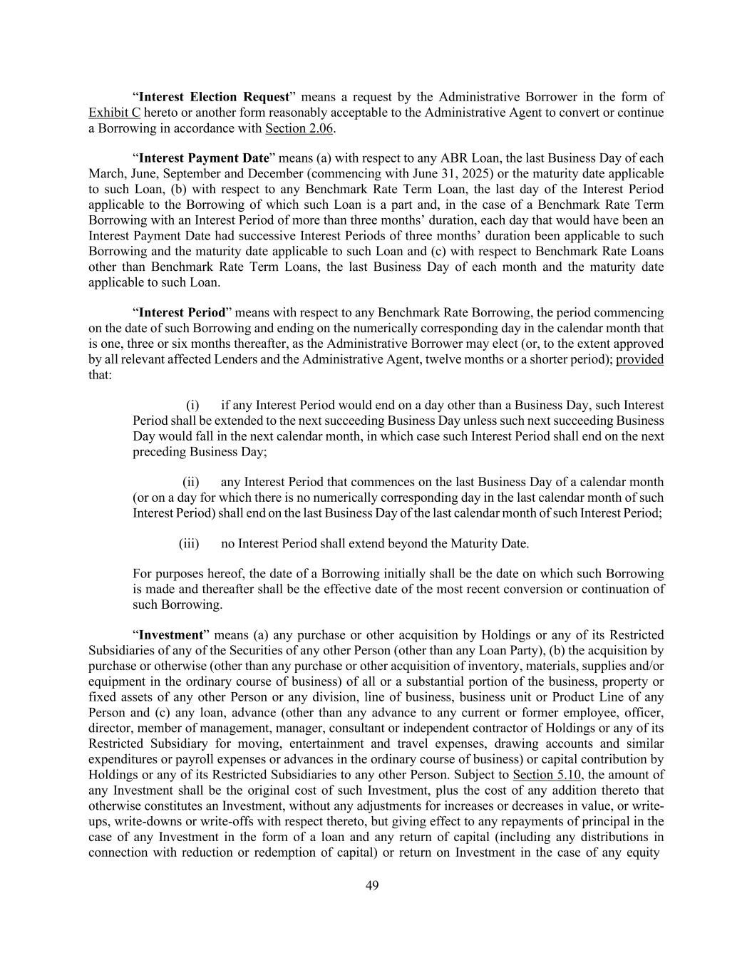 49 “Interest Election Request” means a request by the Administrative Borrower in the form of Exhibit C hereto or another form reasonably acceptable to the Administrative Agent to convert or continue a Borrowing in accordance with Section 2.06. “Interest Payment Date” means (a) with respect to any ABR Loan, the last Business Day of each March, June, September and December (commencing with June 31, 2025) or the maturity date applicable to such Loan, (b) with respect to any Benchmark Rate Term Loan, the last day of the Interest Period applicable to the Borrowing of which such Loan is a part and, in the case of a Benchmark Rate Term Borrowing with an Interest Period of more than three months’ duration, each day that would have been an Interest Payment Date had successive Interest Periods of three months’ duration been applicable to such Borrowing and the maturity date applicable to such Loan and (c) with respect to Benchmark Rate Loans other than Benchmark Rate Term Loans, the last Business Day of each month and the maturity date applicable to such Loan. “Interest Period” means with respect to any Benchmark Rate Borrowing, the period commencing on the date of such Borrowing and ending on the numerically corresponding day in the calendar month that is one, three or six months thereafter, as the Administrative Borrower may elect (or, to the extent approved by all relevant affected Lenders and the Administrative Agent, twelve months or a shorter period); provided that: (i) if any Interest Period would end on a day other than a Business Day, such Interest Period shall be extended to the next succeeding Business Day unless such next succeeding Business Day would fall in the next calendar month, in which case such Interest Period shall end on the next preceding Business Day; (ii) any Interest Period that commences on the last Business Day of a calendar month (or on a day for which there is no numerically corresponding day in the last calendar month of such Interest Period) shall end on the last Business Day of the last calendar month of such Interest Period; (iii) no Interest Period shall extend beyond the Maturity Date. For purposes hereof, the date of a Borrowing initially shall be the date on which such Borrowing is made and thereafter shall be the effective date of the most recent conversion or continuation of such Borrowing. “Investment” means (a) any purchase or other acquisition by Holdings or any of its Restricted Subsidiaries of any of the Securities of any other Person (other than any Loan Party), (b) the acquisition by purchase or otherwise (other than any purchase or other acquisition of inventory, materials, supplies and/or equipment in the ordinary course of business) of all or a substantial portion of the business, property or fixed assets of any other Person or any division, line of business, business unit or Product Line of any Person and (c) any loan, advance (other than any advance to any current or former employee, officer, director, member of management, manager, consultant or independent contractor of Holdings or any of its Restricted Subsidiary for moving, entertainment and travel expenses, drawing accounts and similar expenditures or payroll expenses or advances in the ordinary course of business) or capital contribution by Holdings or any of its Restricted Subsidiaries to any other Person. Subject to Section 5.10, the amount of any Investment shall be the original cost of such Investment, plus the cost of any addition thereto that otherwise constitutes an Investment, without any adjustments for increases or decreases in value, or write- ups, write-downs or write-offs with respect thereto, but giving effect to any repayments of principal in the case of any Investment in the form of a loan and any return of capital (including any distributions in connection with reduction or redemption of capital) or return on Investment in the case of any equity