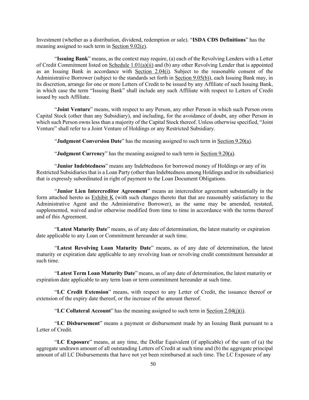 50 Investment (whether as a distribution, dividend, redemption or sale). “ISDA CDS Definitions” has the meaning assigned to such term in Section 9.02(e). “Issuing Bank” means, as the context may require, (a) each of the Revolving Lenders with a Letter of Credit Commitment listed on Schedule 1.01(a)(ii) and (b) any other Revolving Lender that is appointed as an Issuing Bank in accordance with Section 2.04(i). Subject to the reasonable consent of the Administrative Borrower (subject to the standards set forth in Section 9.05(b)), each Issuing Bank may, in its discretion, arrange for one or more Letters of Credit to be issued by any Affiliate of such Issuing Bank, in which case the term “Issuing Bank” shall include any such Affiliate with respect to Letters of Credit issued by such Affiliate. “Joint Venture” means, with respect to any Person, any other Person in which such Person owns Capital Stock (other than any Subsidiary), and including, for the avoidance of doubt, any other Person in which such Person owns less than a majority of the Capital Stock thereof. Unless otherwise specified, “Joint Venture” shall refer to a Joint Venture of Holdings or any Restricted Subsidiary. “Judgment Conversion Date” has the meaning assigned to such term in Section 9.20(a). “Judgment Currency” has the meaning assigned to such term in Section 9.20(a). “Junior Indebtedness” means any Indebtedness for borrowed money of Holdings or any of its Restricted Subsidiaries that is a Loan Party (other than Indebtedness among Holdings and/or its subsidiaries) that is expressly subordinated in right of payment to the Loan Document Obligations. “Junior Lien Intercreditor Agreement” means an intercreditor agreement substantially in the form attached hereto as Exhibit K (with such changes thereto that that are reasonably satisfactory to the Administrative Agent and the Administrative Borrower), as the same may be amended, restated, supplemented, waived and/or otherwise modified from time to time in accordance with the terms thereof and of this Agreement. “Latest Maturity Date” means, as of any date of determination, the latest maturity or expiration date applicable to any Loan or Commitment hereunder at such time. “Latest Revolving Loan Maturity Date” means, as of any date of determination, the latest maturity or expiration date applicable to any revolving loan or revolving credit commitment hereunder at such time. “Latest Term Loan Maturity Date” means, as of any date of determination, the latest maturity or expiration date applicable to any term loan or term commitment hereunder at such time. “LC Credit Extension” means, with respect to any Letter of Credit, the issuance thereof or extension of the expiry date thereof, or the increase of the amount thereof. “LC Collateral Account” has the meaning assigned to such term in Section 2.04(j)(i). “LC Disbursement” means a payment or disbursement made by an Issuing Bank pursuant to a Letter of Credit. “LC Exposure” means, at any time, the Dollar Equivalent (if applicable) of the sum of (a) the aggregate undrawn amount of all outstanding Letters of Credit at such time and (b) the aggregate principal amount of all LC Disbursements that have not yet been reimbursed at such time. The LC Exposure of any