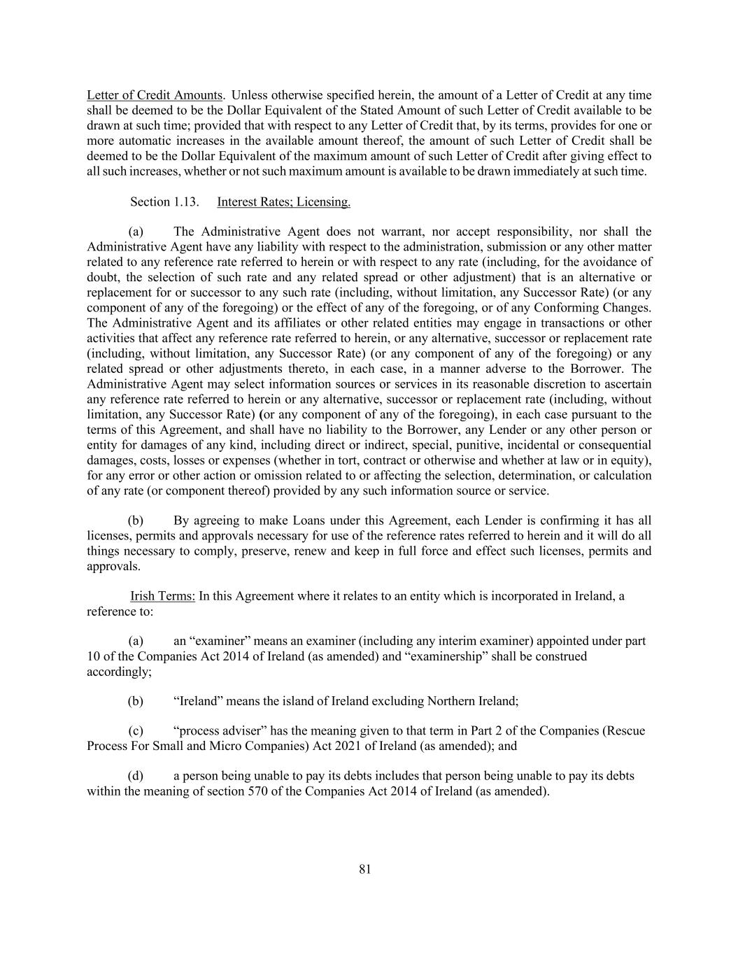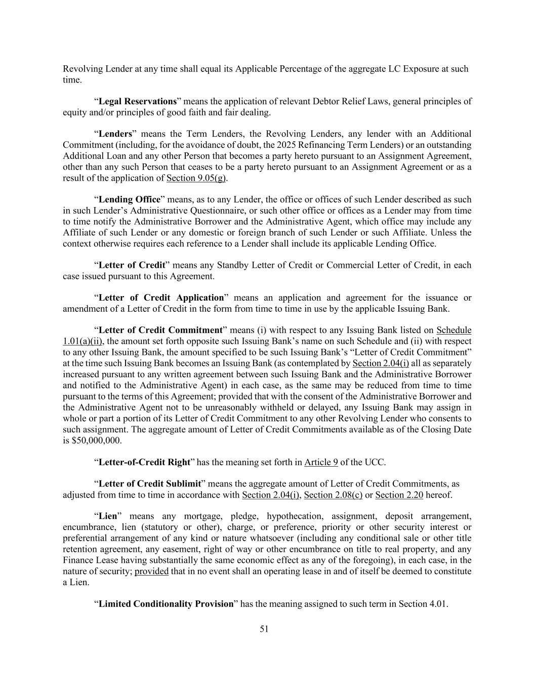 51 Revolving Lender at any time shall equal its Applicable Percentage of the aggregate LC Exposure at such time. “Legal Reservations” means the application of relevant Debtor Relief Laws, general principles of equity and/or principles of good faith and fair dealing. “Lenders” means the Term Lenders, the Revolving Lenders, any lender with an Additional Commitment (including, for the avoidance of doubt, the 2025 Refinancing Term Lenders) or an outstanding Additional Loan and any other Person that becomes a party hereto pursuant to an Assignment Agreement, other than any such Person that ceases to be a party hereto pursuant to an Assignment Agreement or as a result of the application of Section 9.05(g). “Lending Office” means, as to any Lender, the office or offices of such Lender described as such in such Lender’s Administrative Questionnaire, or such other office or offices as a Lender may from time to time notify the Administrative Borrower and the Administrative Agent, which office may include any Affiliate of such Lender or any domestic or foreign branch of such Lender or such Affiliate. Unless the context otherwise requires each reference to a Lender shall include its applicable Lending Office. “Letter of Credit” means any Standby Letter of Credit or Commercial Letter of Credit, in each case issued pursuant to this Agreement. “Letter of Credit Application” means an application and agreement for the issuance or amendment of a Letter of Credit in the form from time to time in use by the applicable Issuing Bank. “Letter of Credit Commitment” means (i) with respect to any Issuing Bank listed on Schedule 1.01(a)(ii), the amount set forth opposite such Issuing Bank’s name on such Schedule and (ii) with respect to any other Issuing Bank, the amount specified to be such Issuing Bank’s “Letter of Credit Commitment” at the time such Issuing Bank becomes an Issuing Bank (as contemplated by Section 2.04(i) all as separately increased pursuant to any written agreement between such Issuing Bank and the Administrative Borrower and notified to the Administrative Agent) in each case, as the same may be reduced from time to time pursuant to the terms of this Agreement; provided that with the consent of the Administrative Borrower and the Administrative Agent not to be unreasonably withheld or delayed, any Issuing Bank may assign in whole or part a portion of its Letter of Credit Commitment to any other Revolving Lender who consents to such assignment. The aggregate amount of Letter of Credit Commitments available as of the Closing Date is $50,000,000. “Letter-of-Credit Right” has the meaning set forth in Article 9 of the UCC. “Letter of Credit Sublimit” means the aggregate amount of Letter of Credit Commitments, as adjusted from time to time in accordance with Section 2.04(i), Section 2.08(c) or Section 2.20 hereof. “Lien” means any mortgage, pledge, hypothecation, assignment, deposit arrangement, encumbrance, lien (statutory or other), charge, or preference, priority or other security interest or preferential arrangement of any kind or nature whatsoever (including any conditional sale or other title retention agreement, any easement, right of way or other encumbrance on title to real property, and any Finance Lease having substantially the same economic effect as any of the foregoing), in each case, in the nature of security; provided that in no event shall an operating lease in and of itself be deemed to constitute a Lien. “Limited Conditionality Provision” has the meaning assigned to such term in Section 4.01.