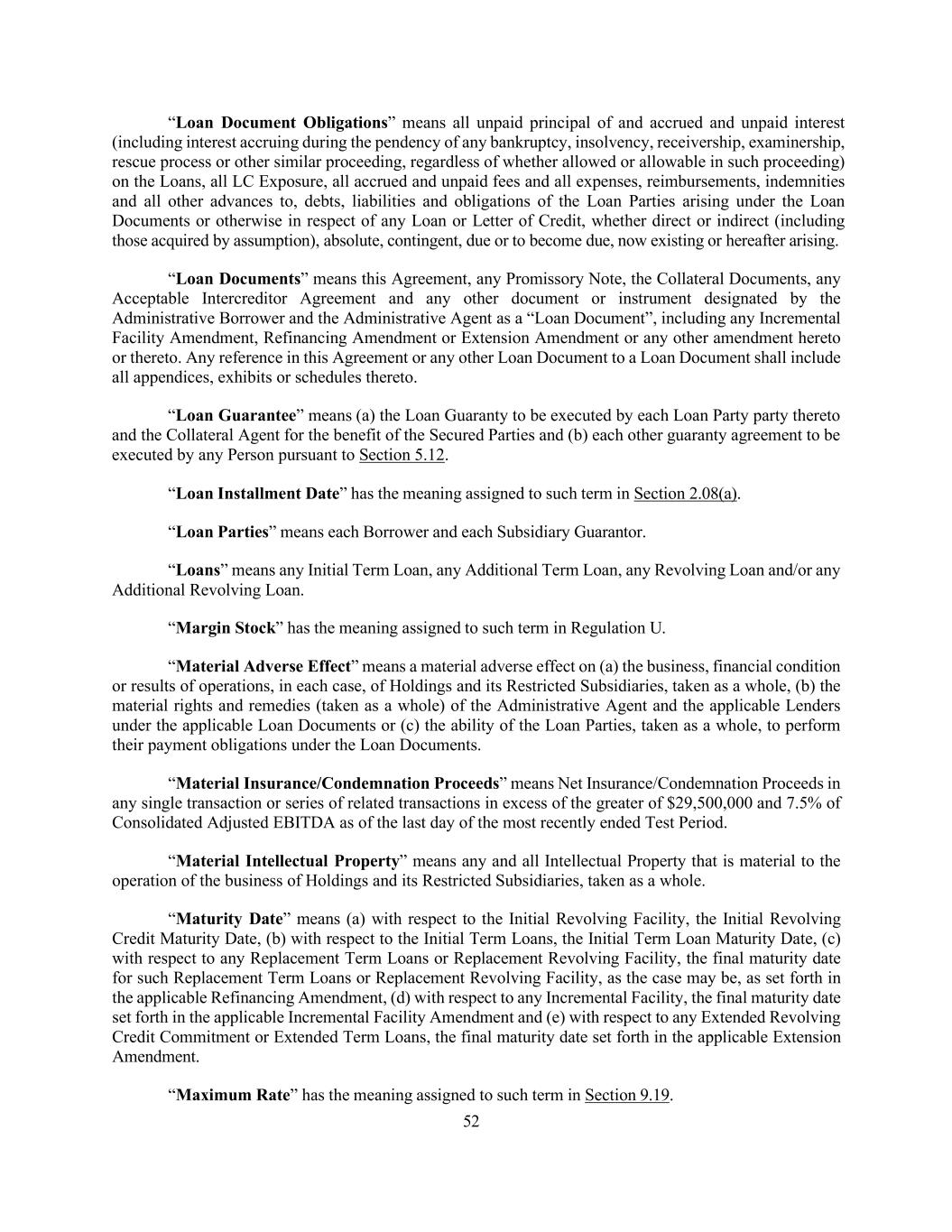 52 “Loan Document Obligations” means all unpaid principal of and accrued and unpaid interest (including interest accruing during the pendency of any bankruptcy, insolvency, receivership, examinership, rescue process or other similar proceeding, regardless of whether allowed or allowable in such proceeding) on the Loans, all LC Exposure, all accrued and unpaid fees and all expenses, reimbursements, indemnities and all other advances to, debts, liabilities and obligations of the Loan Parties arising under the Loan Documents or otherwise in respect of any Loan or Letter of Credit, whether direct or indirect (including those acquired by assumption), absolute, contingent, due or to become due, now existing or hereafter arising. “Loan Documents” means this Agreement, any Promissory Note, the Collateral Documents, any Acceptable Intercreditor Agreement and any other document or instrument designated by the Administrative Borrower and the Administrative Agent as a “Loan Document”, including any Incremental Facility Amendment, Refinancing Amendment or Extension Amendment or any other amendment hereto or thereto. Any reference in this Agreement or any other Loan Document to a Loan Document shall include all appendices, exhibits or schedules thereto. “Loan Guarantee” means (a) the Loan Guaranty to be executed by each Loan Party party thereto and the Collateral Agent for the benefit of the Secured Parties and (b) each other guaranty agreement to be executed by any Person pursuant to Section 5.12. “Loan Installment Date” has the meaning assigned to such term in Section 2.08(a). “Loan Parties” means each Borrower and each Subsidiary Guarantor. “Loans” means any Initial Term Loan, any Additional Term Loan, any Revolving Loan and/or any Additional Revolving Loan. “Margin Stock” has the meaning assigned to such term in Regulation U. “Material Adverse Effect” means a material adverse effect on (a) the business, financial condition or results of operations, in each case, of Holdings and its Restricted Subsidiaries, taken as a whole, (b) the material rights and remedies (taken as a whole) of the Administrative Agent and the applicable Lenders under the applicable Loan Documents or (c) the ability of the Loan Parties, taken as a whole, to perform their payment obligations under the Loan Documents. “Material Insurance/Condemnation Proceeds” means Net Insurance/Condemnation Proceeds in any single transaction or series of related transactions in excess of the greater of $29,500,000 and 7.5% of Consolidated Adjusted EBITDA as of the last day of the most recently ended Test Period. “Material Intellectual Property” means any and all Intellectual Property that is material to the operation of the business of Holdings and its Restricted Subsidiaries, taken as a whole. “Maturity Date” means (a) with respect to the Initial Revolving Facility, the Initial Revolving Credit Maturity Date, (b) with respect to the Initial Term Loans, the Initial Term Loan Maturity Date, (c) with respect to any Replacement Term Loans or Replacement Revolving Facility, the final maturity date for such Replacement Term Loans or Replacement Revolving Facility, as the case may be, as set forth in the applicable Refinancing Amendment, (d) with respect to any Incremental Facility, the final maturity date set forth in the applicable Incremental Facility Amendment and (e) with respect to any Extended Revolving Credit Commitment or Extended Term Loans, the final maturity date set forth in the applicable Extension Amendment. “Maximum Rate” has the meaning assigned to such term in Section 9.19.