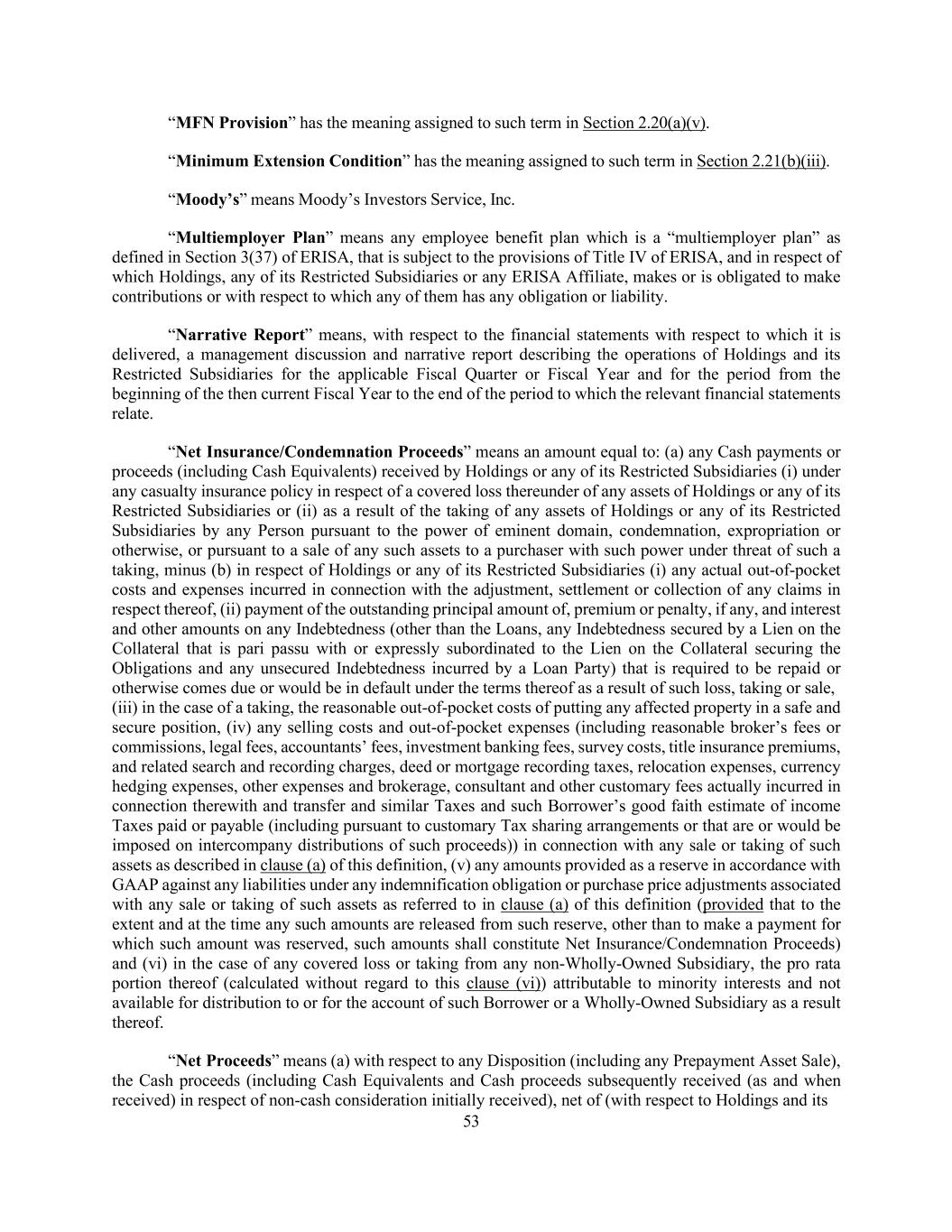 53 “MFN Provision” has the meaning assigned to such term in Section 2.20(a)(v). “Minimum Extension Condition” has the meaning assigned to such term in Section 2.21(b)(iii). “Moody’s” means Moody’s Investors Service, Inc. “Multiemployer Plan” means any employee benefit plan which is a “multiemployer plan” as defined in Section 3(37) of ERISA, that is subject to the provisions of Title IV of ERISA, and in respect of which Holdings, any of its Restricted Subsidiaries or any ERISA Affiliate, makes or is obligated to make contributions or with respect to which any of them has any obligation or liability. “Narrative Report” means, with respect to the financial statements with respect to which it is delivered, a management discussion and narrative report describing the operations of Holdings and its Restricted Subsidiaries for the applicable Fiscal Quarter or Fiscal Year and for the period from the beginning of the then current Fiscal Year to the end of the period to which the relevant financial statements relate. “Net Insurance/Condemnation Proceeds” means an amount equal to: (a) any Cash payments or proceeds (including Cash Equivalents) received by Holdings or any of its Restricted Subsidiaries (i) under any casualty insurance policy in respect of a covered loss thereunder of any assets of Holdings or any of its Restricted Subsidiaries or (ii) as a result of the taking of any assets of Holdings or any of its Restricted Subsidiaries by any Person pursuant to the power of eminent domain, condemnation, expropriation or otherwise, or pursuant to a sale of any such assets to a purchaser with such power under threat of such a taking, minus (b) in respect of Holdings or any of its Restricted Subsidiaries (i) any actual out-of-pocket costs and expenses incurred in connection with the adjustment, settlement or collection of any claims in respect thereof, (ii) payment of the outstanding principal amount of, premium or penalty, if any, and interest and other amounts on any Indebtedness (other than the Loans, any Indebtedness secured by a Lien on the Collateral that is pari passu with or expressly subordinated to the Lien on the Collateral securing the Obligations and any unsecured Indebtedness incurred by a Loan Party) that is required to be repaid or otherwise comes due or would be in default under the terms thereof as a result of such loss, taking or sale, (iii) in the case of a taking, the reasonable out-of-pocket costs of putting any affected property in a safe and secure position, (iv) any selling costs and out-of-pocket expenses (including reasonable broker’s fees or commissions, legal fees, accountants’ fees, investment banking fees, survey costs, title insurance premiums, and related search and recording charges, deed or mortgage recording taxes, relocation expenses, currency hedging expenses, other expenses and brokerage, consultant and other customary fees actually incurred in connection therewith and transfer and similar Taxes and such Borrower’s good faith estimate of income Taxes paid or payable (including pursuant to customary Tax sharing arrangements or that are or would be imposed on intercompany distributions of such proceeds)) in connection with any sale or taking of such assets as described in clause (a) of this definition, (v) any amounts provided as a reserve in accordance with GAAP against any liabilities under any indemnification obligation or purchase price adjustments associated with any sale or taking of such assets as referred to in clause (a) of this definition (provided that to the extent and at the time any such amounts are released from such reserve, other than to make a payment for which such amount was reserved, such amounts shall constitute Net Insurance/Condemnation Proceeds) and (vi) in the case of any covered loss or taking from any non-Wholly-Owned Subsidiary, the pro rata portion thereof (calculated without regard to this clause (vi)) attributable to minority interests and not available for distribution to or for the account of such Borrower or a Wholly-Owned Subsidiary as a result thereof. “Net Proceeds” means (a) with respect to any Disposition (including any Prepayment Asset Sale), the Cash proceeds (including Cash Equivalents and Cash proceeds subsequently received (as and when received) in respect of non-cash consideration initially received), net of (with respect to Holdings and its