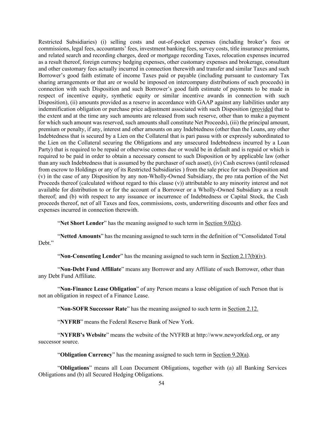54 Restricted Subsidiaries) (i) selling costs and out-of-pocket expenses (including broker’s fees or commissions, legal fees, accountants’ fees, investment banking fees, survey costs, title insurance premiums, and related search and recording charges, deed or mortgage recording Taxes, relocation expenses incurred as a result thereof, foreign currency hedging expenses, other customary expenses and brokerage, consultant and other customary fees actually incurred in connection therewith and transfer and similar Taxes and such Borrower’s good faith estimate of income Taxes paid or payable (including pursuant to customary Tax sharing arrangements or that are or would be imposed on intercompany distributions of such proceeds) in connection with such Disposition and such Borrower’s good faith estimate of payments to be made in respect of incentive equity, synthetic equity or similar incentive awards in connection with such Disposition), (ii) amounts provided as a reserve in accordance with GAAP against any liabilities under any indemnification obligation or purchase price adjustment associated with such Disposition (provided that to the extent and at the time any such amounts are released from such reserve, other than to make a payment for which such amount was reserved, such amounts shall constitute Net Proceeds), (iii) the principal amount, premium or penalty, if any, interest and other amounts on any Indebtedness (other than the Loans, any other Indebtedness that is secured by a Lien on the Collateral that is pari passu with or expressly subordinated to the Lien on the Collateral securing the Obligations and any unsecured Indebtedness incurred by a Loan Party) that is required to be repaid or otherwise comes due or would be in default and is repaid or which is required to be paid in order to obtain a necessary consent to such Disposition or by applicable law (other than any such Indebtedness that is assumed by the purchaser of such asset), (iv) Cash escrows (until released from escrow to Holdings or any of its Restricted Subsidiaries ) from the sale price for such Disposition and (v) in the case of any Disposition by any non-Wholly-Owned Subsidiary, the pro rata portion of the Net Proceeds thereof (calculated without regard to this clause (v)) attributable to any minority interest and not available for distribution to or for the account of a Borrower or a Wholly-Owned Subsidiary as a result thereof; and (b) with respect to any issuance or incurrence of Indebtedness or Capital Stock, the Cash proceeds thereof, net of all Taxes and fees, commissions, costs, underwriting discounts and other fees and expenses incurred in connection therewith. “Net Short Lender” has the meaning assigned to such term in Section 9.02(e). “Netted Amounts” has the meaning assigned to such term in the definition of “Consolidated Total Debt.” “Non-Consenting Lender” has the meaning assigned to such term in Section 2.17(b)(iv). “Non-Debt Fund Affiliate” means any Borrower and any Affiliate of such Borrower, other than any Debt Fund Affiliate. “Non-Finance Lease Obligation” of any Person means a lease obligation of such Person that is not an obligation in respect of a Finance Lease. “Non-SOFR Successor Rate” has the meaning assigned to such term in Section 2.12. “NYFRB” means the Federal Reserve Bank of New York. “NYFRB’s Website” means the website of the NYFRB at http://www.newyorkfed.org, or any successor source. “Obligation Currency” has the meaning assigned to such term in Section 9.20(a). “Obligations” means all Loan Document Obligations, together with (a) all Banking Services Obligations and (b) all Secured Hedging Obligations.