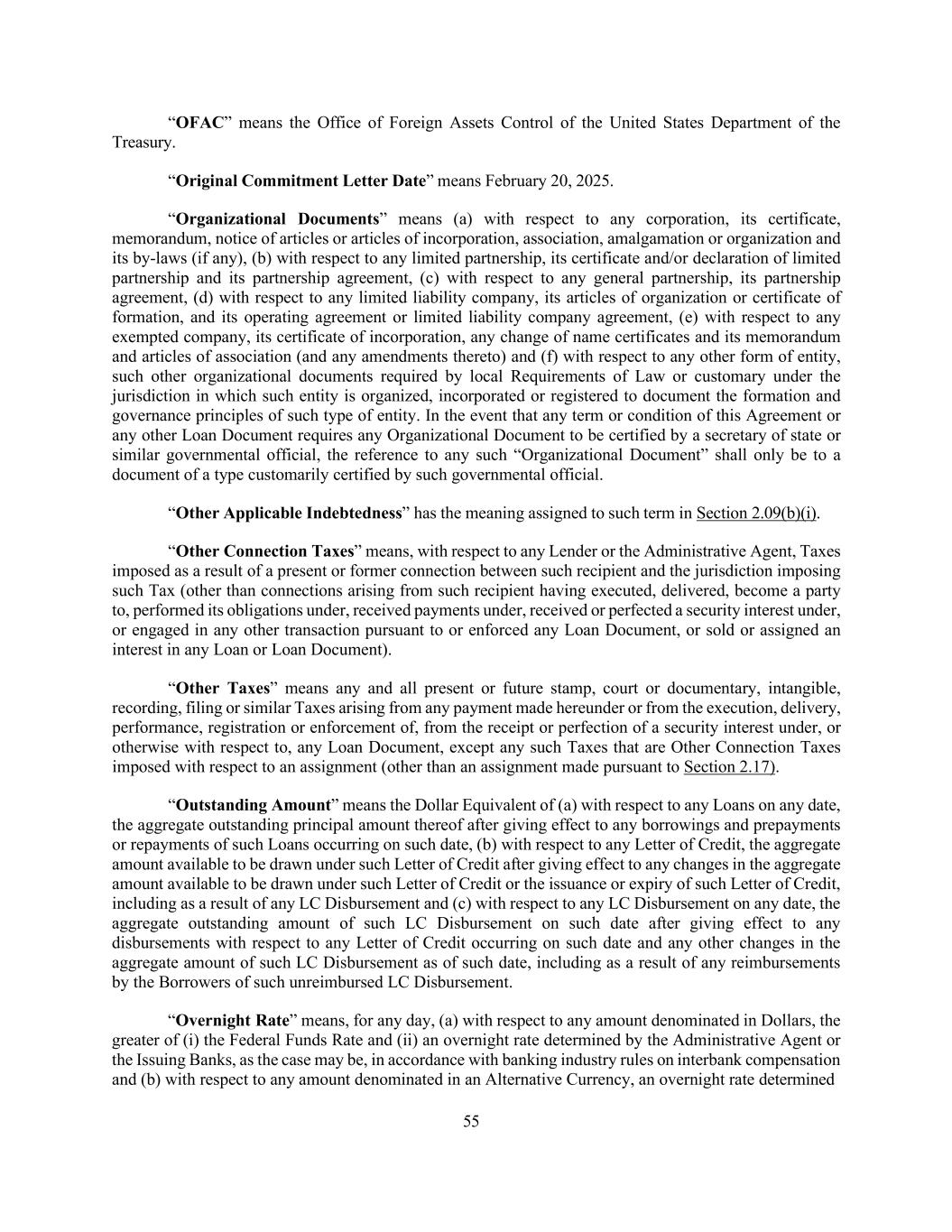 55 “OFAC” means the Office of Foreign Assets Control of the United States Department of the Treasury. “Original Commitment Letter Date” means February 20, 2025. “Organizational Documents” means (a) with respect to any corporation, its certificate, memorandum, notice of articles or articles of incorporation, association, amalgamation or organization and its by-laws (if any), (b) with respect to any limited partnership, its certificate and/or declaration of limited partnership and its partnership agreement, (c) with respect to any general partnership, its partnership agreement, (d) with respect to any limited liability company, its articles of organization or certificate of formation, and its operating agreement or limited liability company agreement, (e) with respect to any exempted company, its certificate of incorporation, any change of name certificates and its memorandum and articles of association (and any amendments thereto) and (f) with respect to any other form of entity, such other organizational documents required by local Requirements of Law or customary under the jurisdiction in which such entity is organized, incorporated or registered to document the formation and governance principles of such type of entity. In the event that any term or condition of this Agreement or any other Loan Document requires any Organizational Document to be certified by a secretary of state or similar governmental official, the reference to any such “Organizational Document” shall only be to a document of a type customarily certified by such governmental official. “Other Applicable Indebtedness” has the meaning assigned to such term in Section 2.09(b)(i). “Other Connection Taxes” means, with respect to any Lender or the Administrative Agent, Taxes imposed as a result of a present or former connection between such recipient and the jurisdiction imposing such Tax (other than connections arising from such recipient having executed, delivered, become a party to, performed its obligations under, received payments under, received or perfected a security interest under, or engaged in any other transaction pursuant to or enforced any Loan Document, or sold or assigned an interest in any Loan or Loan Document). “Other Taxes” means any and all present or future stamp, court or documentary, intangible, recording, filing or similar Taxes arising from any payment made hereunder or from the execution, delivery, performance, registration or enforcement of, from the receipt or perfection of a security interest under, or otherwise with respect to, any Loan Document, except any such Taxes that are Other Connection Taxes imposed with respect to an assignment (other than an assignment made pursuant to Section 2.17). “Outstanding Amount” means the Dollar Equivalent of (a) with respect to any Loans on any date, the aggregate outstanding principal amount thereof after giving effect to any borrowings and prepayments or repayments of such Loans occurring on such date, (b) with respect to any Letter of Credit, the aggregate amount available to be drawn under such Letter of Credit after giving effect to any changes in the aggregate amount available to be drawn under such Letter of Credit or the issuance or expiry of such Letter of Credit, including as a result of any LC Disbursement and (c) with respect to any LC Disbursement on any date, the aggregate outstanding amount of such LC Disbursement on such date after giving effect to any disbursements with respect to any Letter of Credit occurring on such date and any other changes in the aggregate amount of such LC Disbursement as of such date, including as a result of any reimbursements by the Borrowers of such unreimbursed LC Disbursement. “Overnight Rate” means, for any day, (a) with respect to any amount denominated in Dollars, the greater of (i) the Federal Funds Rate and (ii) an overnight rate determined by the Administrative Agent or the Issuing Banks, as the case may be, in accordance with banking industry rules on interbank compensation and (b) with respect to any amount denominated in an Alternative Currency, an overnight rate determined