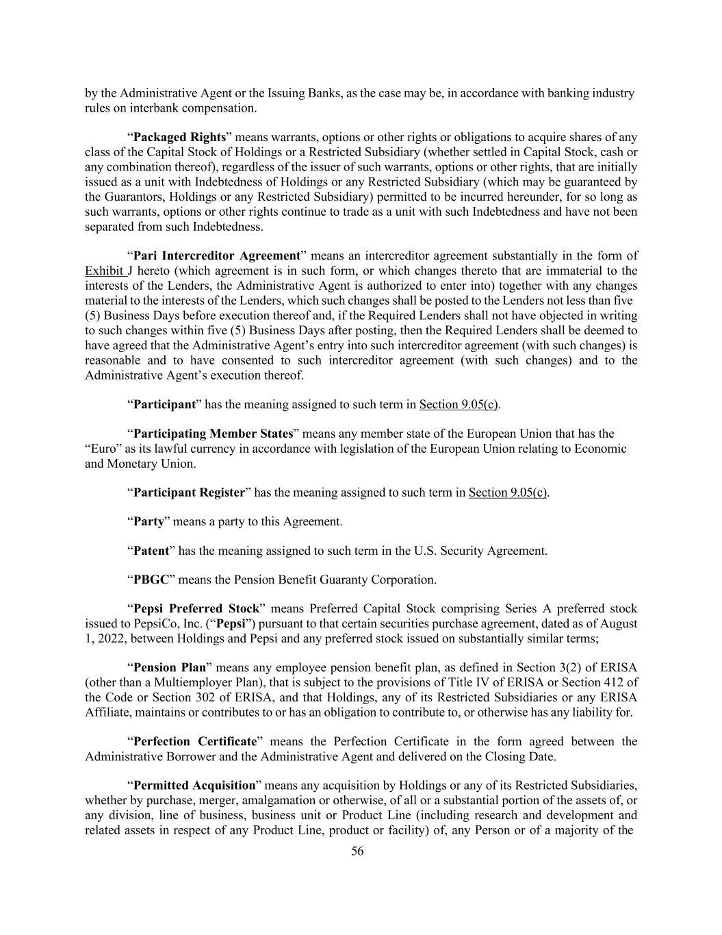 56 by the Administrative Agent or the Issuing Banks, as the case may be, in accordance with banking industry rules on interbank compensation. “Packaged Rights” means warrants, options or other rights or obligations to acquire shares of any class of the Capital Stock of Holdings or a Restricted Subsidiary (whether settled in Capital Stock, cash or any combination thereof), regardless of the issuer of such warrants, options or other rights, that are initially issued as a unit with Indebtedness of Holdings or any Restricted Subsidiary (which may be guaranteed by the Guarantors, Holdings or any Restricted Subsidiary) permitted to be incurred hereunder, for so long as such warrants, options or other rights continue to trade as a unit with such Indebtedness and have not been separated from such Indebtedness. “Pari Intercreditor Agreement” means an intercreditor agreement substantially in the form of Exhibit J hereto (which agreement is in such form, or which changes thereto that are immaterial to the interests of the Lenders, the Administrative Agent is authorized to enter into) together with any changes material to the interests of the Lenders, which such changes shall be posted to the Lenders not less than five (5) Business Days before execution thereof and, if the Required Lenders shall not have objected in writing to such changes within five (5) Business Days after posting, then the Required Lenders shall be deemed to have agreed that the Administrative Agent’s entry into such intercreditor agreement (with such changes) is reasonable and to have consented to such intercreditor agreement (with such changes) and to the Administrative Agent’s execution thereof. “Participant” has the meaning assigned to such term in Section 9.05(c). “Participating Member States” means any member state of the European Union that has the “Euro” as its lawful currency in accordance with legislation of the European Union relating to Economic and Monetary Union. “Participant Register” has the meaning assigned to such term in Section 9.05(c). “Party” means a party to this Agreement. “Patent” has the meaning assigned to such term in the U.S. Security Agreement. “PBGC” means the Pension Benefit Guaranty Corporation. “Pepsi Preferred Stock” means Preferred Capital Stock comprising Series A preferred stock issued to PepsiCo, Inc. (“Pepsi”) pursuant to that certain securities purchase agreement, dated as of August 1, 2022, between Holdings and Pepsi and any preferred stock issued on substantially similar terms; “Pension Plan” means any employee pension benefit plan, as defined in Section 3(2) of ERISA (other than a Multiemployer Plan), that is subject to the provisions of Title IV of ERISA or Section 412 of the Code or Section 302 of ERISA, and that Holdings, any of its Restricted Subsidiaries or any ERISA Affiliate, maintains or contributes to or has an obligation to contribute to, or otherwise has any liability for. “Perfection Certificate” means the Perfection Certificate in the form agreed between the Administrative Borrower and the Administrative Agent and delivered on the Closing Date. “Permitted Acquisition” means any acquisition by Holdings or any of its Restricted Subsidiaries, whether by purchase, merger, amalgamation or otherwise, of all or a substantial portion of the assets of, or any division, line of business, business unit or Product Line (including research and development and related assets in respect of any Product Line, product or facility) of, any Person or of a majority of the