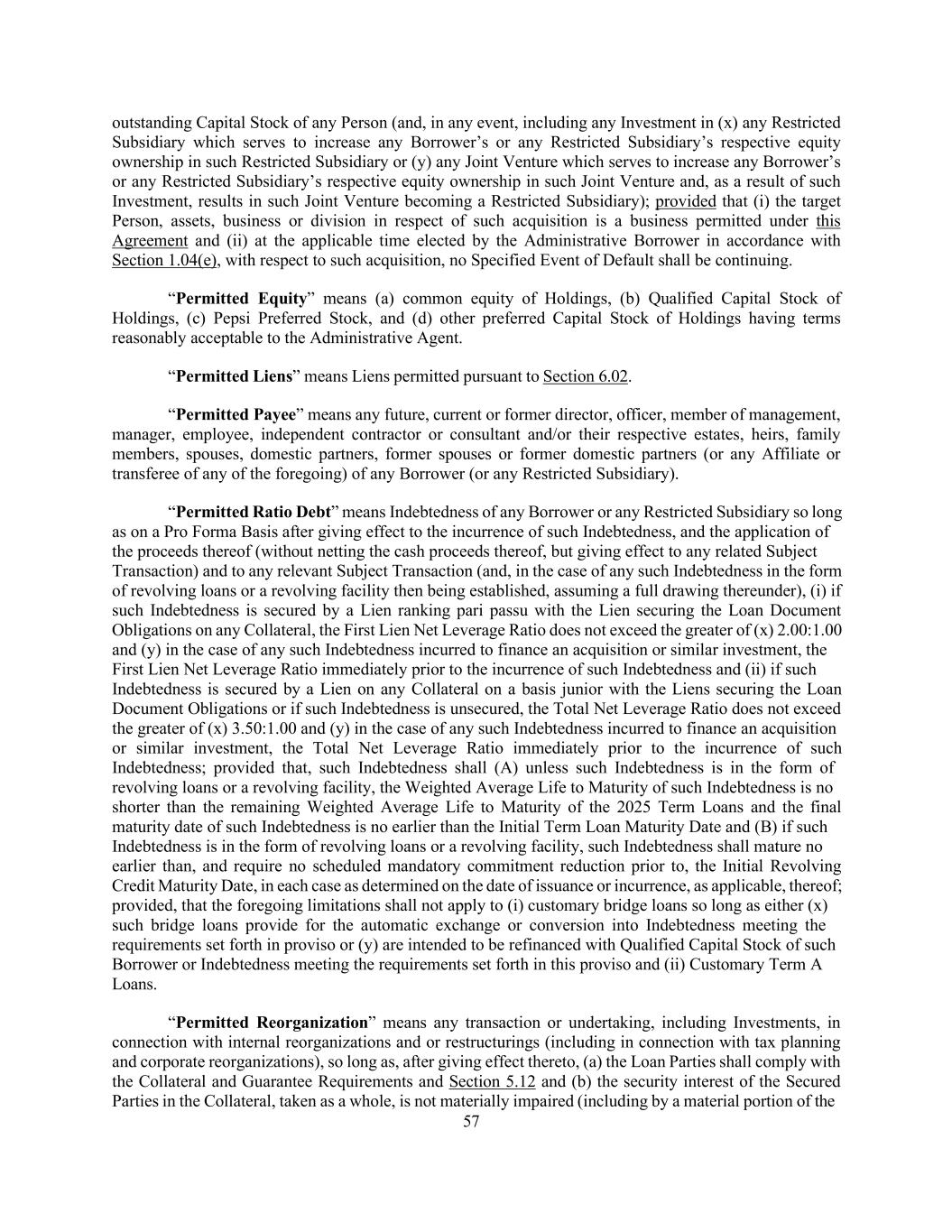 57 outstanding Capital Stock of any Person (and, in any event, including any Investment in (x) any Restricted Subsidiary which serves to increase any Borrower’s or any Restricted Subsidiary’s respective equity ownership in such Restricted Subsidiary or (y) any Joint Venture which serves to increase any Borrower’s or any Restricted Subsidiary’s respective equity ownership in such Joint Venture and, as a result of such Investment, results in such Joint Venture becoming a Restricted Subsidiary); provided that (i) the target Person, assets, business or division in respect of such acquisition is a business permitted under this Agreement and (ii) at the applicable time elected by the Administrative Borrower in accordance with Section 1.04(e), with respect to such acquisition, no Specified Event of Default shall be continuing. “Permitted Equity” means (a) common equity of Holdings, (b) Qualified Capital Stock of Holdings, (c) Pepsi Preferred Stock, and (d) other preferred Capital Stock of Holdings having terms reasonably acceptable to the Administrative Agent. “Permitted Liens” means Liens permitted pursuant to Section 6.02. “Permitted Payee” means any future, current or former director, officer, member of management, manager, employee, independent contractor or consultant and/or their respective estates, heirs, family members, spouses, domestic partners, former spouses or former domestic partners (or any Affiliate or transferee of any of the foregoing) of any Borrower (or any Restricted Subsidiary). “Permitted Ratio Debt” means Indebtedness of any Borrower or any Restricted Subsidiary so long as on a Pro Forma Basis after giving effect to the incurrence of such Indebtedness, and the application of the proceeds thereof (without netting the cash proceeds thereof, but giving effect to any related Subject Transaction) and to any relevant Subject Transaction (and, in the case of any such Indebtedness in the form of revolving loans or a revolving facility then being established, assuming a full drawing thereunder), (i) if such Indebtedness is secured by a Lien ranking pari passu with the Lien securing the Loan Document Obligations on any Collateral, the First Lien Net Leverage Ratio does not exceed the greater of (x) 2.00:1.00 and (y) in the case of any such Indebtedness incurred to finance an acquisition or similar investment, the First Lien Net Leverage Ratio immediately prior to the incurrence of such Indebtedness and (ii) if such Indebtedness is secured by a Lien on any Collateral on a basis junior with the Liens securing the Loan Document Obligations or if such Indebtedness is unsecured, the Total Net Leverage Ratio does not exceed the greater of (x) 3.50:1.00 and (y) in the case of any such Indebtedness incurred to finance an acquisition or similar investment, the Total Net Leverage Ratio immediately prior to the incurrence of such Indebtedness; provided that, such Indebtedness shall (A) unless such Indebtedness is in the form of revolving loans or a revolving facility, the Weighted Average Life to Maturity of such Indebtedness is no shorter than the remaining Weighted Average Life to Maturity of the 2025 Term Loans and the final maturity date of such Indebtedness is no earlier than the Initial Term Loan Maturity Date and (B) if such Indebtedness is in the form of revolving loans or a revolving facility, such Indebtedness shall mature no earlier than, and require no scheduled mandatory commitment reduction prior to, the Initial Revolving Credit Maturity Date, in each case as determined on the date of issuance or incurrence, as applicable, thereof; provided, that the foregoing limitations shall not apply to (i) customary bridge loans so long as either (x) such bridge loans provide for the automatic exchange or conversion into Indebtedness meeting the requirements set forth in proviso or (y) are intended to be refinanced with Qualified Capital Stock of such Borrower or Indebtedness meeting the requirements set forth in this proviso and (ii) Customary Term A Loans. “Permitted Reorganization” means any transaction or undertaking, including Investments, in connection with internal reorganizations and or restructurings (including in connection with tax planning and corporate reorganizations), so long as, after giving effect thereto, (a) the Loan Parties shall comply with the Collateral and Guarantee Requirements and Section 5.12 and (b) the security interest of the Secured Parties in the Collateral, taken as a whole, is not materially impaired (including by a material portion of the