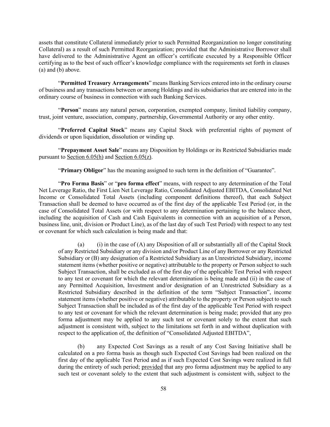 58 assets that constitute Collateral immediately prior to such Permitted Reorganization no longer constituting Collateral) as a result of such Permitted Reorganization; provided that the Administrative Borrower shall have delivered to the Administrative Agent an officer’s certificate executed by a Responsible Officer certifying as to the best of such officer’s knowledge compliance with the requirements set forth in clauses (a) and (b) above. “Permitted Treasury Arrangements” means Banking Services entered into in the ordinary course of business and any transactions between or among Holdings and its subsidiaries that are entered into in the ordinary course of business in connection with such Banking Services. “Person” means any natural person, corporation, exempted company, limited liability company, trust, joint venture, association, company, partnership, Governmental Authority or any other entity. “Preferred Capital Stock” means any Capital Stock with preferential rights of payment of dividends or upon liquidation, dissolution or winding up. “Prepayment Asset Sale” means any Disposition by Holdings or its Restricted Subsidiaries made pursuant to Section 6.05(h) and Section 6.05(z). “Primary Obligor” has the meaning assigned to such term in the definition of “Guarantee”. “Pro Forma Basis” or “pro forma effect” means, with respect to any determination of the Total Net Leverage Ratio, the First Lien Net Leverage Ratio, Consolidated Adjusted EBITDA, Consolidated Net Income or Consolidated Total Assets (including component definitions thereof), that each Subject Transaction shall be deemed to have occurred as of the first day of the applicable Test Period (or, in the case of Consolidated Total Assets (or with respect to any determination pertaining to the balance sheet, including the acquisition of Cash and Cash Equivalents in connection with an acquisition of a Person, business line, unit, division or Product Line), as of the last day of such Test Period) with respect to any test or covenant for which such calculation is being made and that: (a) (i) in the case of (A) any Disposition of all or substantially all of the Capital Stock of any Restricted Subsidiary or any division and/or Product Line of any Borrower or any Restricted Subsidiary or (B) any designation of a Restricted Subsidiary as an Unrestricted Subsidiary, income statement items (whether positive or negative) attributable to the property or Person subject to such Subject Transaction, shall be excluded as of the first day of the applicable Test Period with respect to any test or covenant for which the relevant determination is being made and (ii) in the case of any Permitted Acquisition, Investment and/or designation of an Unrestricted Subsidiary as a Restricted Subsidiary described in the definition of the term “Subject Transaction”, income statement items (whether positive or negative) attributable to the property or Person subject to such Subject Transaction shall be included as of the first day of the applicable Test Period with respect to any test or covenant for which the relevant determination is being made; provided that any pro forma adjustment may be applied to any such test or covenant solely to the extent that such adjustment is consistent with, subject to the limitations set forth in and without duplication with respect to the application of, the definition of “Consolidated Adjusted EBITDA”, (b) any Expected Cost Savings as a result of any Cost Saving Initiative shall be calculated on a pro forma basis as though such Expected Cost Savings had been realized on the first day of the applicable Test Period and as if such Expected Cost Savings were realized in full during the entirety of such period; provided that any pro forma adjustment may be applied to any such test or covenant solely to the extent that such adjustment is consistent with, subject to the