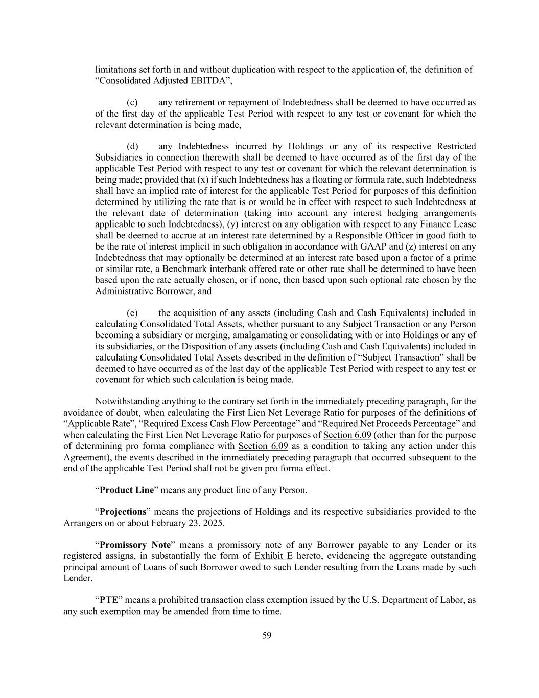 59 limitations set forth in and without duplication with respect to the application of, the definition of “Consolidated Adjusted EBITDA”, (c) any retirement or repayment of Indebtedness shall be deemed to have occurred as of the first day of the applicable Test Period with respect to any test or covenant for which the relevant determination is being made, (d) any Indebtedness incurred by Holdings or any of its respective Restricted Subsidiaries in connection therewith shall be deemed to have occurred as of the first day of the applicable Test Period with respect to any test or covenant for which the relevant determination is being made; provided that (x) if such Indebtedness has a floating or formula rate, such Indebtedness shall have an implied rate of interest for the applicable Test Period for purposes of this definition determined by utilizing the rate that is or would be in effect with respect to such Indebtedness at the relevant date of determination (taking into account any interest hedging arrangements applicable to such Indebtedness), (y) interest on any obligation with respect to any Finance Lease shall be deemed to accrue at an interest rate determined by a Responsible Officer in good faith to be the rate of interest implicit in such obligation in accordance with GAAP and (z) interest on any Indebtedness that may optionally be determined at an interest rate based upon a factor of a prime or similar rate, a Benchmark interbank offered rate or other rate shall be determined to have been based upon the rate actually chosen, or if none, then based upon such optional rate chosen by the Administrative Borrower, and (e) the acquisition of any assets (including Cash and Cash Equivalents) included in calculating Consolidated Total Assets, whether pursuant to any Subject Transaction or any Person becoming a subsidiary or merging, amalgamating or consolidating with or into Holdings or any of its subsidiaries, or the Disposition of any assets (including Cash and Cash Equivalents) included in calculating Consolidated Total Assets described in the definition of “Subject Transaction” shall be deemed to have occurred as of the last day of the applicable Test Period with respect to any test or covenant for which such calculation is being made. Notwithstanding anything to the contrary set forth in the immediately preceding paragraph, for the avoidance of doubt, when calculating the First Lien Net Leverage Ratio for purposes of the definitions of “Applicable Rate”, “Required Excess Cash Flow Percentage” and “Required Net Proceeds Percentage” and when calculating the First Lien Net Leverage Ratio for purposes of Section 6.09 (other than for the purpose of determining pro forma compliance with Section 6.09 as a condition to taking any action under this Agreement), the events described in the immediately preceding paragraph that occurred subsequent to the end of the applicable Test Period shall not be given pro forma effect. “Product Line” means any product line of any Person. “Projections” means the projections of Holdings and its respective subsidiaries provided to the Arrangers on or about February 23, 2025. “Promissory Note” means a promissory note of any Borrower payable to any Lender or its registered assigns, in substantially the form of Exhibit E hereto, evidencing the aggregate outstanding principal amount of Loans of such Borrower owed to such Lender resulting from the Loans made by such Lender. “PTE” means a prohibited transaction class exemption issued by the U.S. Department of Labor, as any such exemption may be amended from time to time.