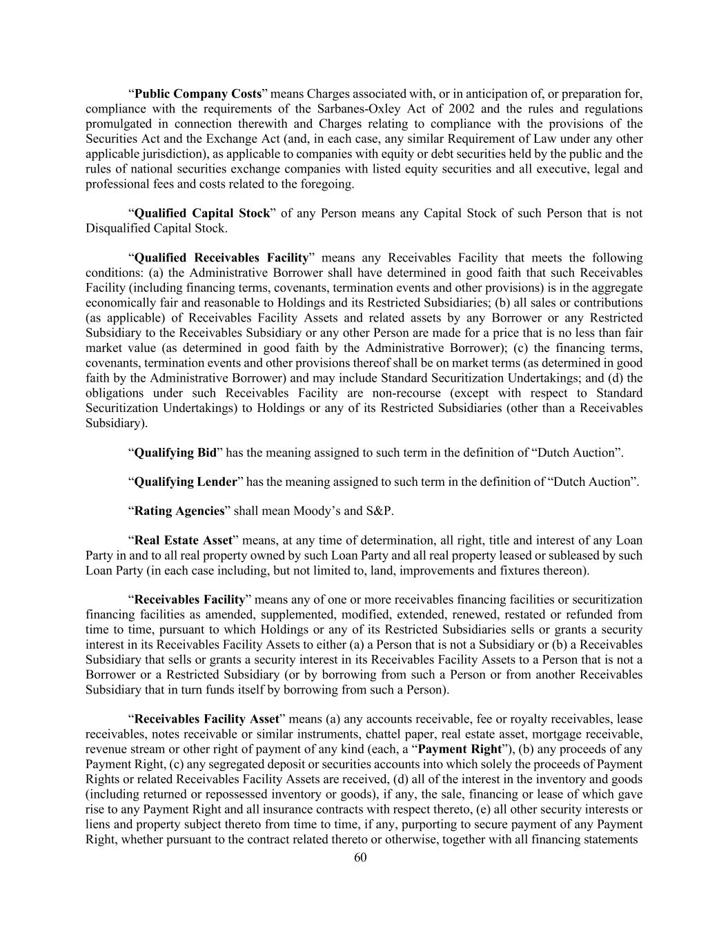 60 “Public Company Costs” means Charges associated with, or in anticipation of, or preparation for, compliance with the requirements of the Sarbanes-Oxley Act of 2002 and the rules and regulations promulgated in connection therewith and Charges relating to compliance with the provisions of the Securities Act and the Exchange Act (and, in each case, any similar Requirement of Law under any other applicable jurisdiction), as applicable to companies with equity or debt securities held by the public and the rules of national securities exchange companies with listed equity securities and all executive, legal and professional fees and costs related to the foregoing. “Qualified Capital Stock” of any Person means any Capital Stock of such Person that is not Disqualified Capital Stock. “Qualified Receivables Facility” means any Receivables Facility that meets the following conditions: (a) the Administrative Borrower shall have determined in good faith that such Receivables Facility (including financing terms, covenants, termination events and other provisions) is in the aggregate economically fair and reasonable to Holdings and its Restricted Subsidiaries; (b) all sales or contributions (as applicable) of Receivables Facility Assets and related assets by any Borrower or any Restricted Subsidiary to the Receivables Subsidiary or any other Person are made for a price that is no less than fair market value (as determined in good faith by the Administrative Borrower); (c) the financing terms, covenants, termination events and other provisions thereof shall be on market terms (as determined in good faith by the Administrative Borrower) and may include Standard Securitization Undertakings; and (d) the obligations under such Receivables Facility are non-recourse (except with respect to Standard Securitization Undertakings) to Holdings or any of its Restricted Subsidiaries (other than a Receivables Subsidiary). “Qualifying Bid” has the meaning assigned to such term in the definition of “Dutch Auction”. “Qualifying Lender” has the meaning assigned to such term in the definition of “Dutch Auction”. “Rating Agencies” shall mean Moody’s and S&P. “Real Estate Asset” means, at any time of determination, all right, title and interest of any Loan Party in and to all real property owned by such Loan Party and all real property leased or subleased by such Loan Party (in each case including, but not limited to, land, improvements and fixtures thereon). “Receivables Facility” means any of one or more receivables financing facilities or securitization financing facilities as amended, supplemented, modified, extended, renewed, restated or refunded from time to time, pursuant to which Holdings or any of its Restricted Subsidiaries sells or grants a security interest in its Receivables Facility Assets to either (a) a Person that is not a Subsidiary or (b) a Receivables Subsidiary that sells or grants a security interest in its Receivables Facility Assets to a Person that is not a Borrower or a Restricted Subsidiary (or by borrowing from such a Person or from another Receivables Subsidiary that in turn funds itself by borrowing from such a Person). “Receivables Facility Asset” means (a) any accounts receivable, fee or royalty receivables, lease receivables, notes receivable or similar instruments, chattel paper, real estate asset, mortgage receivable, revenue stream or other right of payment of any kind (each, a “Payment Right”), (b) any proceeds of any Payment Right, (c) any segregated deposit or securities accounts into which solely the proceeds of Payment Rights or related Receivables Facility Assets are received, (d) all of the interest in the inventory and goods (including returned or repossessed inventory or goods), if any, the sale, financing or lease of which gave rise to any Payment Right and all insurance contracts with respect thereto, (e) all other security interests or liens and property subject thereto from time to time, if any, purporting to secure payment of any Payment Right, whether pursuant to the contract related thereto or otherwise, together with all financing statements