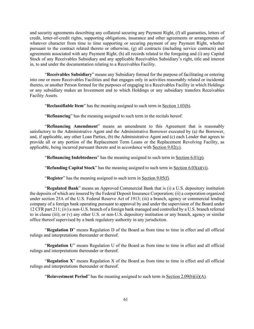 61 and security agreements describing any collateral securing any Payment Right, (f) all guaranties, letters of credit, letter-of-credit rights, supporting obligations, insurance and other agreements or arrangements of whatever character from time to time supporting or securing payment of any Payment Right, whether pursuant to the contract related thereto or otherwise, (g) all contracts (including service contracts) and agreements associated with any Payment Right, (h) all records related to the foregoing and (i) any Capital Stock of any Receivables Subsidiary and any applicable Receivables Subsidiary’s right, title and interest in, to and under the documentation relating to a Receivables Facility. “Receivables Subsidiary” means any Subsidiary formed for the purpose of facilitating or entering into one or more Receivables Facilities and that engages only in activities reasonably related or incidental thereto, or another Person formed for the purposes of engaging in a Receivables Facility in which Holdings or any subsidiary makes an Investment and to which Holdings or any subsidiary transfers Receivables Facility Assets. “Reclassifiable Item” has the meaning assigned to such term in Section 1.03(b). “Refinancing” has the meaning assigned to such term in the recitals hereof. “Refinancing Amendment” means an amendment to this Agreement that is reasonably satisfactory to the Administrative Agent and the Administrative Borrower executed by (a) the Borrower, and, if applicable, any other Loan Parties, (b) the Administrative Agent and (c) each Lender that agrees to provide all or any portion of the Replacement Term Loans or the Replacement Revolving Facility, as applicable, being incurred pursuant thereto and in accordance with Section 9.02(c). “Refinancing Indebtedness” has the meaning assigned to such term in Section 6.01(p). “Refunding Capital Stock” has the meaning assigned to such term in Section 6.03(a)(vi). “Register” has the meaning assigned to such term in Section 9.05(f). “Regulated Bank” means an Approved Commercial Bank that is (i) a U.S. depository institution the deposits of which are insured by the Federal Deposit Insurance Corporation; (ii) a corporation organized under section 25A of the U.S. Federal Reserve Act of 1913; (iii) a branch, agency or commercial lending company of a foreign bank operating pursuant to approval by and under the supervision of the Board under 12 CFR part 211; (iv) a non-U.S. branch of a foreign bank managed and controlled by a U.S. branch referred to in clause (iii); or (v) any other U.S. or non-U.S. depository institution or any branch, agency or similar office thereof supervised by a bank regulatory authority in any jurisdiction. “Regulation D” means Regulation D of the Board as from time to time in effect and all official rulings and interpretations thereunder or thereof. “Regulation U” means Regulation U of the Board as from time to time in effect and all official rulings and interpretations thereunder or thereof. “Regulation X” means Regulation X of the Board as from time to time in effect and all official rulings and interpretations thereunder or thereof. “Reinvestment Period” has the meaning assigned to such term in Section 2.09(b)(ii)(A).