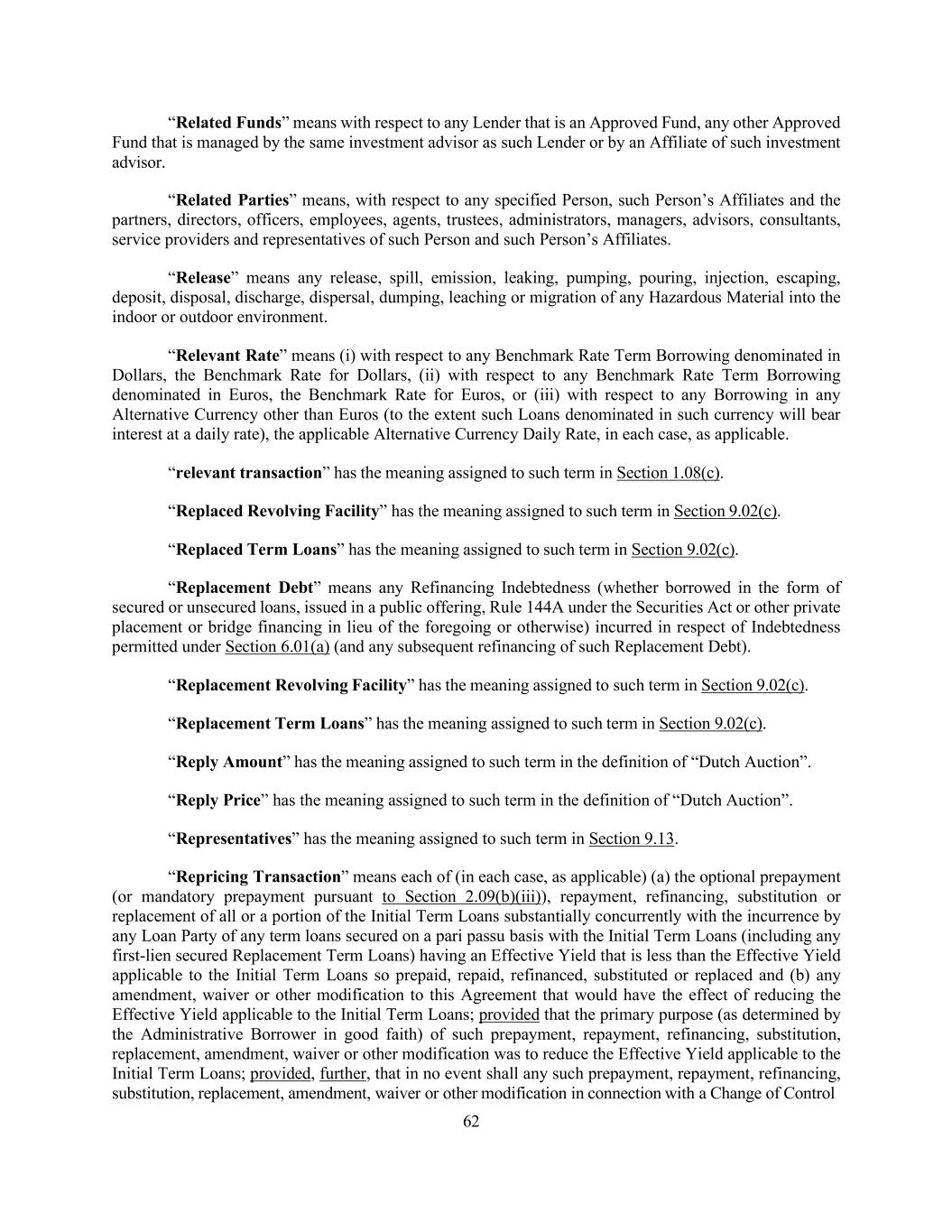 62 “Related Funds” means with respect to any Lender that is an Approved Fund, any other Approved Fund that is managed by the same investment advisor as such Lender or by an Affiliate of such investment advisor. “Related Parties” means, with respect to any specified Person, such Person’s Affiliates and the partners, directors, officers, employees, agents, trustees, administrators, managers, advisors, consultants, service providers and representatives of such Person and such Person’s Affiliates. “Release” means any release, spill, emission, leaking, pumping, pouring, injection, escaping, deposit, disposal, discharge, dispersal, dumping, leaching or migration of any Hazardous Material into the indoor or outdoor environment. “Relevant Rate” means (i) with respect to any Benchmark Rate Term Borrowing denominated in Dollars, the Benchmark Rate for Dollars, (ii) with respect to any Benchmark Rate Term Borrowing denominated in Euros, the Benchmark Rate for Euros, or (iii) with respect to any Borrowing in any Alternative Currency other than Euros (to the extent such Loans denominated in such currency will bear interest at a daily rate), the applicable Alternative Currency Daily Rate, in each case, as applicable. “relevant transaction” has the meaning assigned to such term in Section 1.08(c). “Replaced Revolving Facility” has the meaning assigned to such term in Section 9.02(c). “Replaced Term Loans” has the meaning assigned to such term in Section 9.02(c). “Replacement Debt” means any Refinancing Indebtedness (whether borrowed in the form of secured or unsecured loans, issued in a public offering, Rule 144A under the Securities Act or other private placement or bridge financing in lieu of the foregoing or otherwise) incurred in respect of Indebtedness permitted under Section 6.01(a) (and any subsequent refinancing of such Replacement Debt). “Replacement Revolving Facility” has the meaning assigned to such term in Section 9.02(c). “Replacement Term Loans” has the meaning assigned to such term in Section 9.02(c). “Reply Amount” has the meaning assigned to such term in the definition of “Dutch Auction”. “Reply Price” has the meaning assigned to such term in the definition of “Dutch Auction”. “Representatives” has the meaning assigned to such term in Section 9.13. “Repricing Transaction” means each of (in each case, as applicable) (a) the optional prepayment (or mandatory prepayment pursuant to Section 2.09(b)(iii)), repayment, refinancing, substitution or replacement of all or a portion of the Initial Term Loans substantially concurrently with the incurrence by any Loan Party of any term loans secured on a pari passu basis with the Initial Term Loans (including any first-lien secured Replacement Term Loans) having an Effective Yield that is less than the Effective Yield applicable to the Initial Term Loans so prepaid, repaid, refinanced, substituted or replaced and (b) any amendment, waiver or other modification to this Agreement that would have the effect of reducing the Effective Yield applicable to the Initial Term Loans; provided that the primary purpose (as determined by the Administrative Borrower in good faith) of such prepayment, repayment, refinancing, substitution, replacement, amendment, waiver or other modification was to reduce the Effective Yield applicable to the Initial Term Loans; provided, further, that in no event shall any such prepayment, repayment, refinancing, substitution, replacement, amendment, waiver or other modification in connection with a Change of Control
