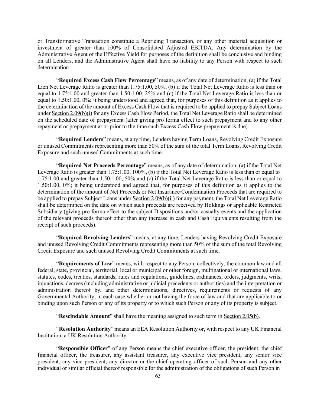 63 or Transformative Transaction constitute a Repricing Transaction, or any other material acquisition or investment of greater than 100% of Consolidated Adjusted EBITDA. Any determination by the Administrative Agent of the Effective Yield for purposes of the definition shall be conclusive and binding on all Lenders, and the Administrative Agent shall have no liability to any Person with respect to such determination. “Required Excess Cash Flow Percentage” means, as of any date of determination, (a) if the Total Lien Net Leverage Ratio is greater than 1.75:1.00, 50%, (b) if the Total Net Leverage Ratio is less than or equal to 1.75:1.00 and greater than 1.50:1.00, 25% and (c) if the Total Net Leverage Ratio is less than or equal to 1.50:1.00, 0%; it being understood and agreed that, for purposes of this definition as it applies to the determination of the amount of Excess Cash Flow that is required to be applied to prepay Subject Loans under Section 2.09(b)(i) for any Excess Cash Flow Period, the Total Net Leverage Ratio shall be determined on the scheduled date of prepayment (after giving pro forma effect to such prepayment and to any other repayment or prepayment at or prior to the time such Excess Cash Flow prepayment is due). “Required Lenders” means, at any time, Lenders having Term Loans, Revolving Credit Exposure or unused Commitments representing more than 50% of the sum of the total Term Loans, Revolving Credit Exposure and such unused Commitments at such time. “Required Net Proceeds Percentage” means, as of any date of determination, (a) if the Total Net Leverage Ratio is greater than 1.75:1.00, 100%, (b) if the Total Net Leverage Ratio is less than or equal to 1.75:1.00 and greater than 1.50:1.00, 50% and (c) if the Total Net Leverage Ratio is less than or equal to 1.50:1.00, 0%; it being understood and agreed that, for purposes of this definition as it applies to the determination of the amount of Net Proceeds or Net Insurance/Condemnation Proceeds that are required to be applied to prepay Subject Loans under Section 2.09(b)(ii) for any payment, the Total Net Leverage Ratio shall be determined on the date on which such proceeds are received by Holdings or applicable Restricted Subsidiary (giving pro forma effect to the subject Dispositions and/or casualty events and the application of the relevant proceeds thereof other than any increase in cash and Cash Equivalents resulting from the receipt of such proceeds). “Required Revolving Lenders” means, at any time, Lenders having Revolving Credit Exposure and unused Revolving Credit Commitments representing more than 50% of the sum of the total Revolving Credit Exposure and such unused Revolving Credit Commitments at such time. “Requirements of Law” means, with respect to any Person, collectively, the common law and all federal, state, provincial, territorial, local or municipal or other foreign, multinational or international laws, statutes, codes, treaties, standards, rules and regulations, guidelines, ordinances, orders, judgments, writs, injunctions, decrees (including administrative or judicial precedents or authorities) and the interpretation or administration thereof by, and other determinations, directives, requirements or requests of any Governmental Authority, in each case whether or not having the force of law and that are applicable to or binding upon such Person or any of its property or to which such Person or any of its property is subject. “Rescindable Amount” shall have the meaning assigned to such term in Section 2.05(b). “Resolution Authority” means an EEA Resolution Authority or, with respect to any UK Financial Institution, a UK Resolution Authority. “Responsible Officer” of any Person means the chief executive officer, the president, the chief financial officer, the treasurer, any assistant treasurer, any executive vice president, any senior vice president, any vice president, any director or the chief operating officer of such Person and any other individual or similar official thereof responsible for the administration of the obligations of such Person in