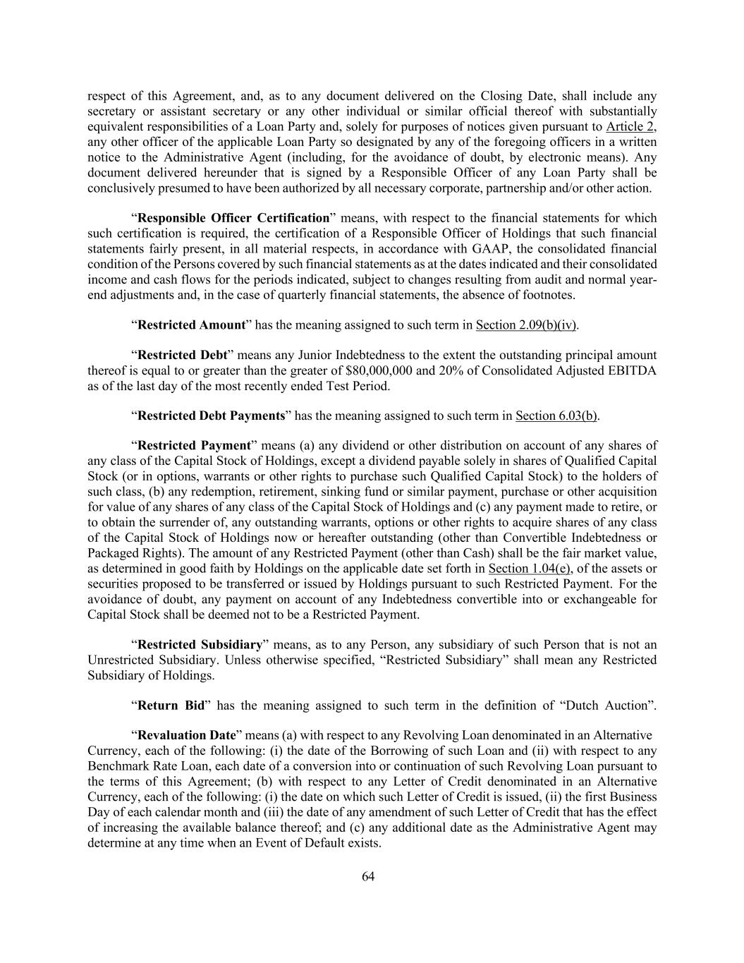 64 respect of this Agreement, and, as to any document delivered on the Closing Date, shall include any secretary or assistant secretary or any other individual or similar official thereof with substantially equivalent responsibilities of a Loan Party and, solely for purposes of notices given pursuant to Article 2, any other officer of the applicable Loan Party so designated by any of the foregoing officers in a written notice to the Administrative Agent (including, for the avoidance of doubt, by electronic means). Any document delivered hereunder that is signed by a Responsible Officer of any Loan Party shall be conclusively presumed to have been authorized by all necessary corporate, partnership and/or other action. “Responsible Officer Certification” means, with respect to the financial statements for which such certification is required, the certification of a Responsible Officer of Holdings that such financial statements fairly present, in all material respects, in accordance with GAAP, the consolidated financial condition of the Persons covered by such financial statements as at the dates indicated and their consolidated income and cash flows for the periods indicated, subject to changes resulting from audit and normal year- end adjustments and, in the case of quarterly financial statements, the absence of footnotes. “Restricted Amount” has the meaning assigned to such term in Section 2.09(b)(iv). “Restricted Debt” means any Junior Indebtedness to the extent the outstanding principal amount thereof is equal to or greater than the greater of $80,000,000 and 20% of Consolidated Adjusted EBITDA as of the last day of the most recently ended Test Period. “Restricted Debt Payments” has the meaning assigned to such term in Section 6.03(b). “Restricted Payment” means (a) any dividend or other distribution on account of any shares of any class of the Capital Stock of Holdings, except a dividend payable solely in shares of Qualified Capital Stock (or in options, warrants or other rights to purchase such Qualified Capital Stock) to the holders of such class, (b) any redemption, retirement, sinking fund or similar payment, purchase or other acquisition for value of any shares of any class of the Capital Stock of Holdings and (c) any payment made to retire, or to obtain the surrender of, any outstanding warrants, options or other rights to acquire shares of any class of the Capital Stock of Holdings now or hereafter outstanding (other than Convertible Indebtedness or Packaged Rights). The amount of any Restricted Payment (other than Cash) shall be the fair market value, as determined in good faith by Holdings on the applicable date set forth in Section 1.04(e), of the assets or securities proposed to be transferred or issued by Holdings pursuant to such Restricted Payment. For the avoidance of doubt, any payment on account of any Indebtedness convertible into or exchangeable for Capital Stock shall be deemed not to be a Restricted Payment. “Restricted Subsidiary” means, as to any Person, any subsidiary of such Person that is not an Unrestricted Subsidiary. Unless otherwise specified, “Restricted Subsidiary” shall mean any Restricted Subsidiary of Holdings. “Return Bid” has the meaning assigned to such term in the definition of “Dutch Auction”. “Revaluation Date” means (a) with respect to any Revolving Loan denominated in an Alternative Currency, each of the following: (i) the date of the Borrowing of such Loan and (ii) with respect to any Benchmark Rate Loan, each date of a conversion into or continuation of such Revolving Loan pursuant to the terms of this Agreement; (b) with respect to any Letter of Credit denominated in an Alternative Currency, each of the following: (i) the date on which such Letter of Credit is issued, (ii) the first Business Day of each calendar month and (iii) the date of any amendment of such Letter of Credit that has the effect of increasing the available balance thereof; and (c) any additional date as the Administrative Agent may determine at any time when an Event of Default exists.
