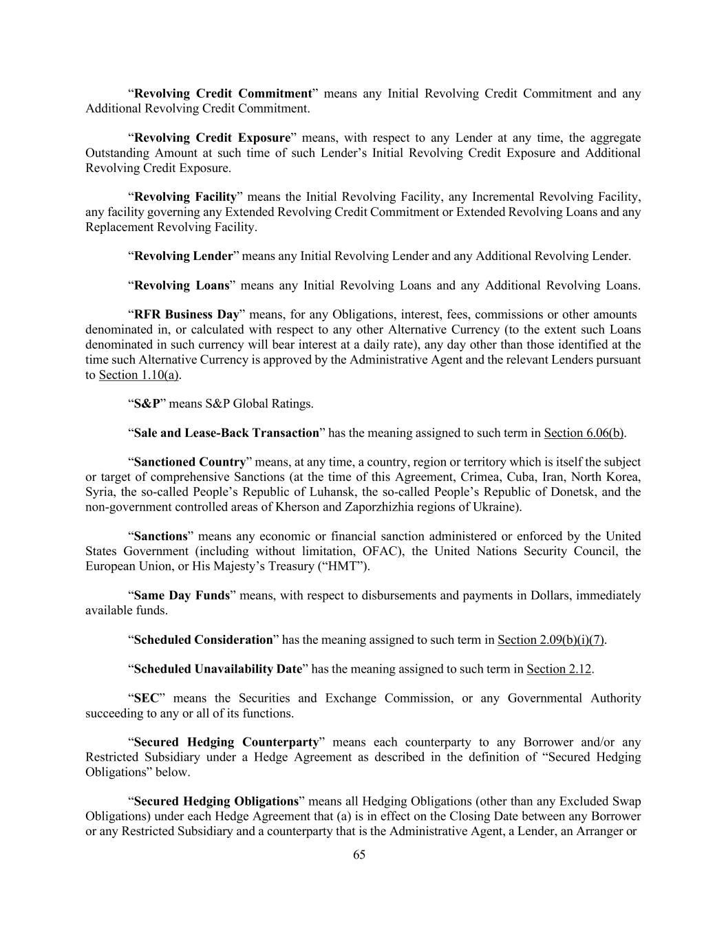 65 “Revolving Credit Commitment” means any Initial Revolving Credit Commitment and any Additional Revolving Credit Commitment. “Revolving Credit Exposure” means, with respect to any Lender at any time, the aggregate Outstanding Amount at such time of such Lender’s Initial Revolving Credit Exposure and Additional Revolving Credit Exposure. “Revolving Facility” means the Initial Revolving Facility, any Incremental Revolving Facility, any facility governing any Extended Revolving Credit Commitment or Extended Revolving Loans and any Replacement Revolving Facility. “Revolving Lender” means any Initial Revolving Lender and any Additional Revolving Lender. “Revolving Loans” means any Initial Revolving Loans and any Additional Revolving Loans. “RFR Business Day” means, for any Obligations, interest, fees, commissions or other amounts denominated in, or calculated with respect to any other Alternative Currency (to the extent such Loans denominated in such currency will bear interest at a daily rate), any day other than those identified at the time such Alternative Currency is approved by the Administrative Agent and the relevant Lenders pursuant to Section 1.10(a). “S&P” means S&P Global Ratings. “Sale and Lease-Back Transaction” has the meaning assigned to such term in Section 6.06(b). “Sanctioned Country” means, at any time, a country, region or territory which is itself the subject or target of comprehensive Sanctions (at the time of this Agreement, Crimea, Cuba, Iran, North Korea, Syria, the so-called People’s Republic of Luhansk, the so-called People’s Republic of Donetsk, and the non-government controlled areas of Kherson and Zaporzhizhia regions of Ukraine). “Sanctions” means any economic or financial sanction administered or enforced by the United States Government (including without limitation, OFAC), the United Nations Security Council, the European Union, or His Majesty’s Treasury (“HMT”). “Same Day Funds” means, with respect to disbursements and payments in Dollars, immediately available funds. “Scheduled Consideration” has the meaning assigned to such term in Section 2.09(b)(i)(7). “Scheduled Unavailability Date” has the meaning assigned to such term in Section 2.12. “SEC” means the Securities and Exchange Commission, or any Governmental Authority succeeding to any or all of its functions. “Secured Hedging Counterparty” means each counterparty to any Borrower and/or any Restricted Subsidiary under a Hedge Agreement as described in the definition of “Secured Hedging Obligations” below. “Secured Hedging Obligations” means all Hedging Obligations (other than any Excluded Swap Obligations) under each Hedge Agreement that (a) is in effect on the Closing Date between any Borrower or any Restricted Subsidiary and a counterparty that is the Administrative Agent, a Lender, an Arranger or