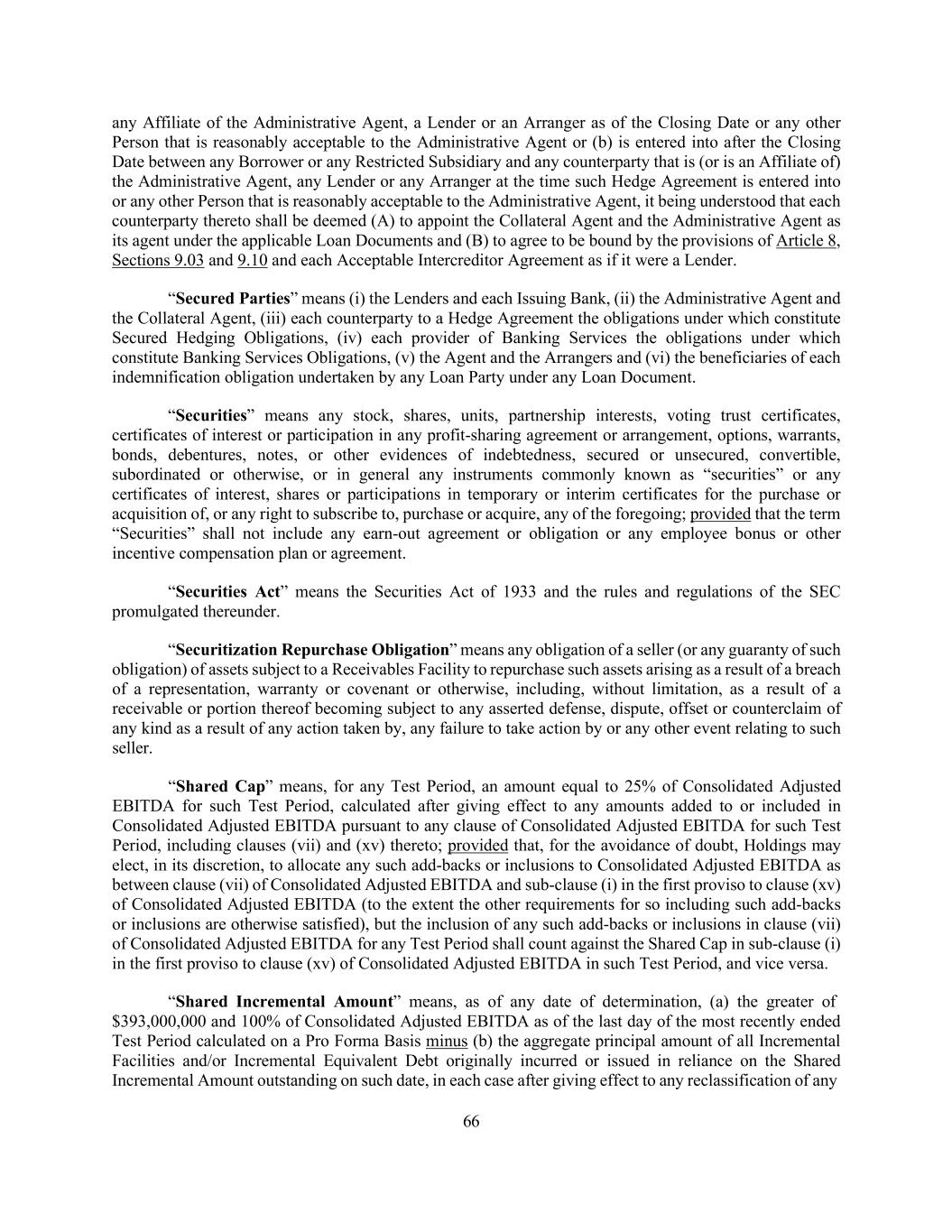 66 any Affiliate of the Administrative Agent, a Lender or an Arranger as of the Closing Date or any other Person that is reasonably acceptable to the Administrative Agent or (b) is entered into after the Closing Date between any Borrower or any Restricted Subsidiary and any counterparty that is (or is an Affiliate of) the Administrative Agent, any Lender or any Arranger at the time such Hedge Agreement is entered into or any other Person that is reasonably acceptable to the Administrative Agent, it being understood that each counterparty thereto shall be deemed (A) to appoint the Collateral Agent and the Administrative Agent as its agent under the applicable Loan Documents and (B) to agree to be bound by the provisions of Article 8, Sections 9.03 and 9.10 and each Acceptable Intercreditor Agreement as if it were a Lender. “Secured Parties” means (i) the Lenders and each Issuing Bank, (ii) the Administrative Agent and the Collateral Agent, (iii) each counterparty to a Hedge Agreement the obligations under which constitute Secured Hedging Obligations, (iv) each provider of Banking Services the obligations under which constitute Banking Services Obligations, (v) the Agent and the Arrangers and (vi) the beneficiaries of each indemnification obligation undertaken by any Loan Party under any Loan Document. “Securities” means any stock, shares, units, partnership interests, voting trust certificates, certificates of interest or participation in any profit-sharing agreement or arrangement, options, warrants, bonds, debentures, notes, or other evidences of indebtedness, secured or unsecured, convertible, subordinated or otherwise, or in general any instruments commonly known as “securities” or any certificates of interest, shares or participations in temporary or interim certificates for the purchase or acquisition of, or any right to subscribe to, purchase or acquire, any of the foregoing; provided that the term “Securities” shall not include any earn-out agreement or obligation or any employee bonus or other incentive compensation plan or agreement. “Securities Act” means the Securities Act of 1933 and the rules and regulations of the SEC promulgated thereunder. “Securitization Repurchase Obligation” means any obligation of a seller (or any guaranty of such obligation) of assets subject to a Receivables Facility to repurchase such assets arising as a result of a breach of a representation, warranty or covenant or otherwise, including, without limitation, as a result of a receivable or portion thereof becoming subject to any asserted defense, dispute, offset or counterclaim of any kind as a result of any action taken by, any failure to take action by or any other event relating to such seller. “Shared Cap” means, for any Test Period, an amount equal to 25% of Consolidated Adjusted EBITDA for such Test Period, calculated after giving effect to any amounts added to or included in Consolidated Adjusted EBITDA pursuant to any clause of Consolidated Adjusted EBITDA for such Test Period, including clauses (vii) and (xv) thereto; provided that, for the avoidance of doubt, Holdings may elect, in its discretion, to allocate any such add-backs or inclusions to Consolidated Adjusted EBITDA as between clause (vii) of Consolidated Adjusted EBITDA and sub-clause (i) in the first proviso to clause (xv) of Consolidated Adjusted EBITDA (to the extent the other requirements for so including such add-backs or inclusions are otherwise satisfied), but the inclusion of any such add-backs or inclusions in clause (vii) of Consolidated Adjusted EBITDA for any Test Period shall count against the Shared Cap in sub-clause (i) in the first proviso to clause (xv) of Consolidated Adjusted EBITDA in such Test Period, and vice versa. “Shared Incremental Amount” means, as of any date of determination, (a) the greater of $393,000,000 and 100% of Consolidated Adjusted EBITDA as of the last day of the most recently ended Test Period calculated on a Pro Forma Basis minus (b) the aggregate principal amount of all Incremental Facilities and/or Incremental Equivalent Debt originally incurred or issued in reliance on the Shared Incremental Amount outstanding on such date, in each case after giving effect to any reclassification of any