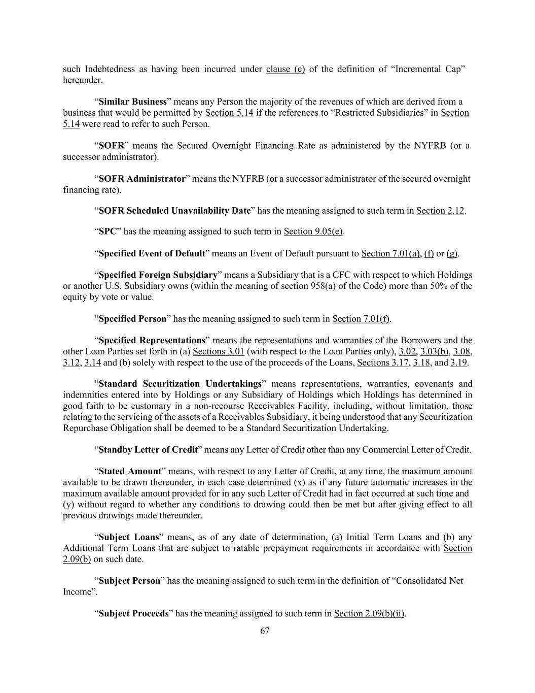 67 such Indebtedness as having been incurred under clause (e) of the definition of “Incremental Cap” hereunder. “Similar Business” means any Person the majority of the revenues of which are derived from a business that would be permitted by Section 5.14 if the references to “Restricted Subsidiaries” in Section 5.14 were read to refer to such Person. “SOFR” means the Secured Overnight Financing Rate as administered by the NYFRB (or a successor administrator). “SOFR Administrator” means the NYFRB (or a successor administrator of the secured overnight financing rate). “SOFR Scheduled Unavailability Date” has the meaning assigned to such term in Section 2.12. “SPC” has the meaning assigned to such term in Section 9.05(e). “Specified Event of Default” means an Event of Default pursuant to Section 7.01(a), (f) or (g). “Specified Foreign Subsidiary” means a Subsidiary that is a CFC with respect to which Holdings or another U.S. Subsidiary owns (within the meaning of section 958(a) of the Code) more than 50% of the equity by vote or value. “Specified Person” has the meaning assigned to such term in Section 7.01(f). “Specified Representations” means the representations and warranties of the Borrowers and the other Loan Parties set forth in (a) Sections 3.01 (with respect to the Loan Parties only), 3.02, 3.03(b), 3.08, 3.12, 3.14 and (b) solely with respect to the use of the proceeds of the Loans, Sections 3.17, 3.18, and 3.19. “Standard Securitization Undertakings” means representations, warranties, covenants and indemnities entered into by Holdings or any Subsidiary of Holdings which Holdings has determined in good faith to be customary in a non-recourse Receivables Facility, including, without limitation, those relating to the servicing of the assets of a Receivables Subsidiary, it being understood that any Securitization Repurchase Obligation shall be deemed to be a Standard Securitization Undertaking. “Standby Letter of Credit” means any Letter of Credit other than any Commercial Letter of Credit. “Stated Amount” means, with respect to any Letter of Credit, at any time, the maximum amount available to be drawn thereunder, in each case determined (x) as if any future automatic increases in the maximum available amount provided for in any such Letter of Credit had in fact occurred at such time and (y) without regard to whether any conditions to drawing could then be met but after giving effect to all previous drawings made thereunder. “Subject Loans” means, as of any date of determination, (a) Initial Term Loans and (b) any Additional Term Loans that are subject to ratable prepayment requirements in accordance with Section 2.09(b) on such date. “Subject Person” has the meaning assigned to such term in the definition of “Consolidated Net Income”. “Subject Proceeds” has the meaning assigned to such term in Section 2.09(b)(ii).