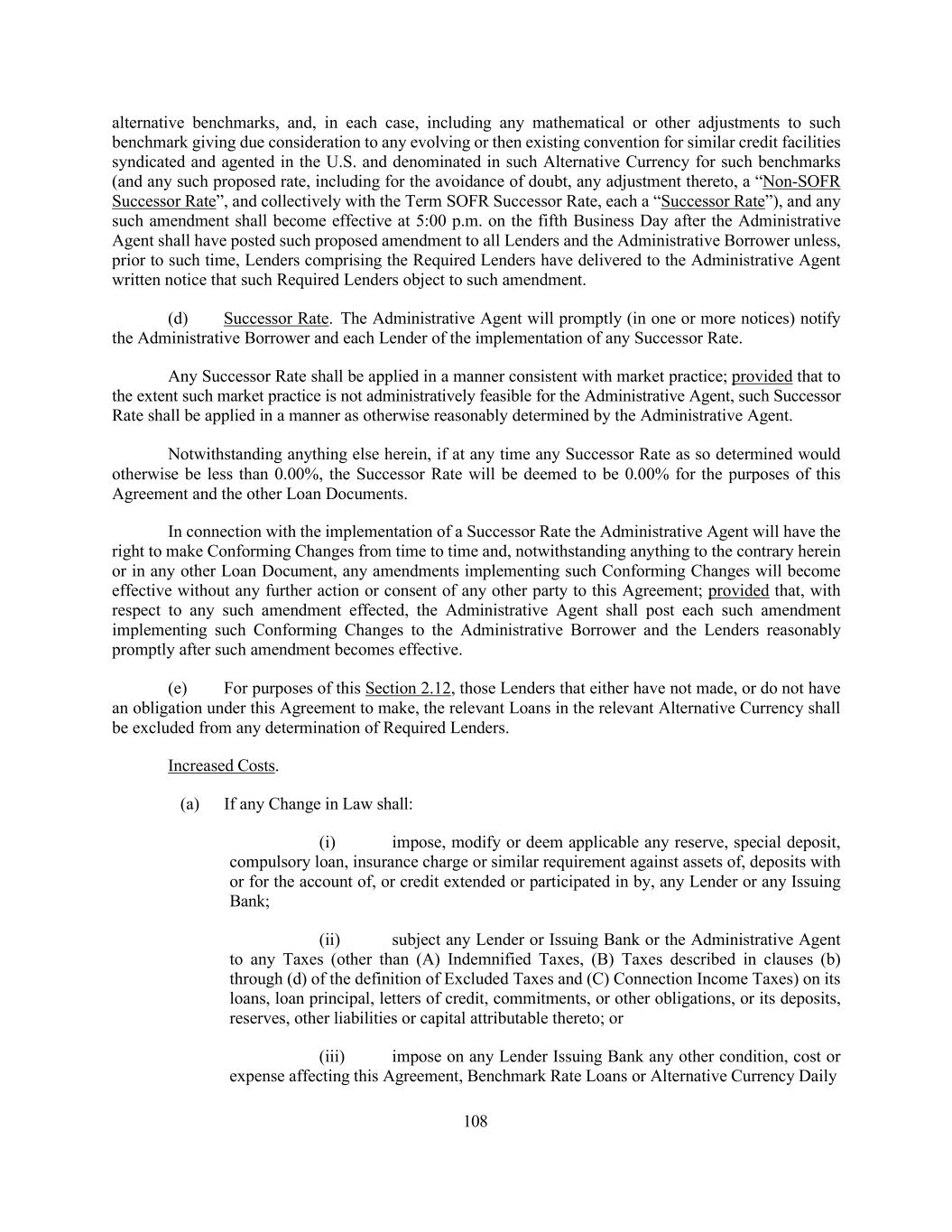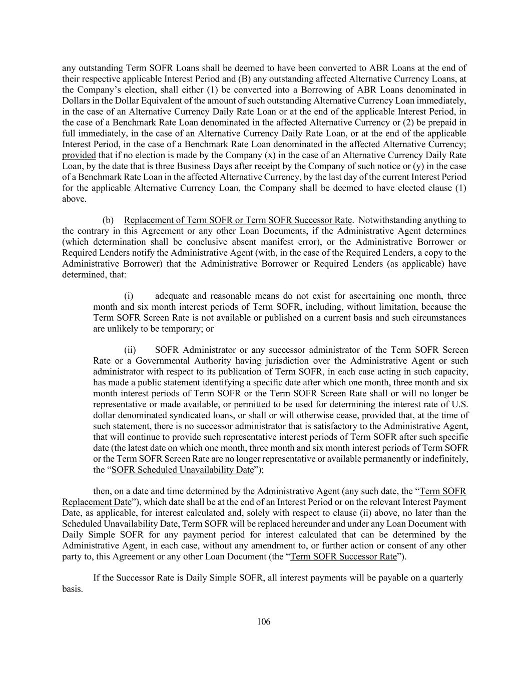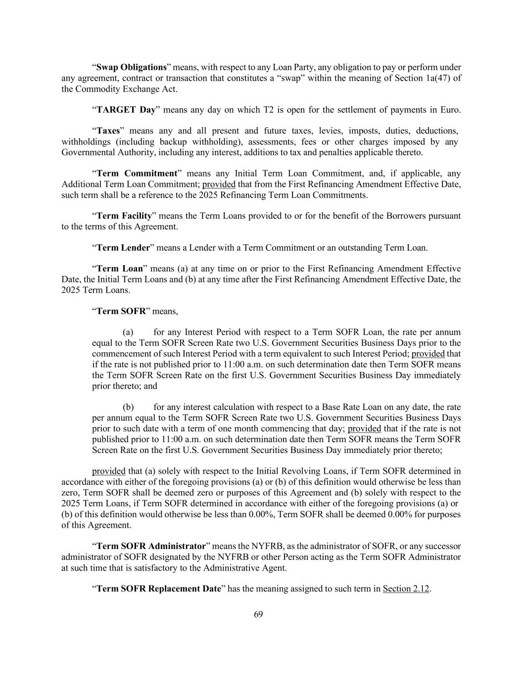 69 “Swap Obligations” means, with respect to any Loan Party, any obligation to pay or perform under any agreement, contract or transaction that constitutes a “swap” within the meaning of Section 1a(47) of the Commodity Exchange Act. “TARGET Day” means any day on which T2 is open for the settlement of payments in Euro. “Taxes” means any and all present and future taxes, levies, imposts, duties, deductions, withholdings (including backup withholding), assessments, fees or other charges imposed by any Governmental Authority, including any interest, additions to tax and penalties applicable thereto. “Term Commitment” means any Initial Term Loan Commitment, and, if applicable, any Additional Term Loan Commitment; provided that from the First Refinancing Amendment Effective Date, such term shall be a reference to the 2025 Refinancing Term Loan Commitments. “Term Facility” means the Term Loans provided to or for the benefit of the Borrowers pursuant to the terms of this Agreement. “Term Lender” means a Lender with a Term Commitment or an outstanding Term Loan. “Term Loan” means (a) at any time on or prior to the First Refinancing Amendment Effective Date, the Initial Term Loans and (b) at any time after the First Refinancing Amendment Effective Date, the 2025 Term Loans. “Term SOFR” means, (a) for any Interest Period with respect to a Term SOFR Loan, the rate per annum equal to the Term SOFR Screen Rate two U.S. Government Securities Business Days prior to the commencement of such Interest Period with a term equivalent to such Interest Period; provided that if the rate is not published prior to 11:00 a.m. on such determination date then Term SOFR means the Term SOFR Screen Rate on the first U.S. Government Securities Business Day immediately prior thereto; and (b) for any interest calculation with respect to a Base Rate Loan on any date, the rate per annum equal to the Term SOFR Screen Rate two U.S. Government Securities Business Days prior to such date with a term of one month commencing that day; provided that if the rate is not published prior to 11:00 a.m. on such determination date then Term SOFR means the Term SOFR Screen Rate on the first U.S. Government Securities Business Day immediately prior thereto; provided that (a) solely with respect to the Initial Revolving Loans, if Term SOFR determined in accordance with either of the foregoing provisions (a) or (b) of this definition would otherwise be less than zero, Term SOFR shall be deemed zero or purposes of this Agreement and (b) solely with respect to the 2025 Term Loans, if Term SOFR determined in accordance with either of the foregoing provisions (a) or (b) of this definition would otherwise be less than 0.00%, Term SOFR shall be deemed 0.00% for purposes of this Agreement. “Term SOFR Administrator” means the NYFRB, as the administrator of SOFR, or any successor administrator of SOFR designated by the NYFRB or other Person acting as the Term SOFR Administrator at such time that is satisfactory to the Administrative Agent. “Term SOFR Replacement Date” has the meaning assigned to such term in Section 2.12.