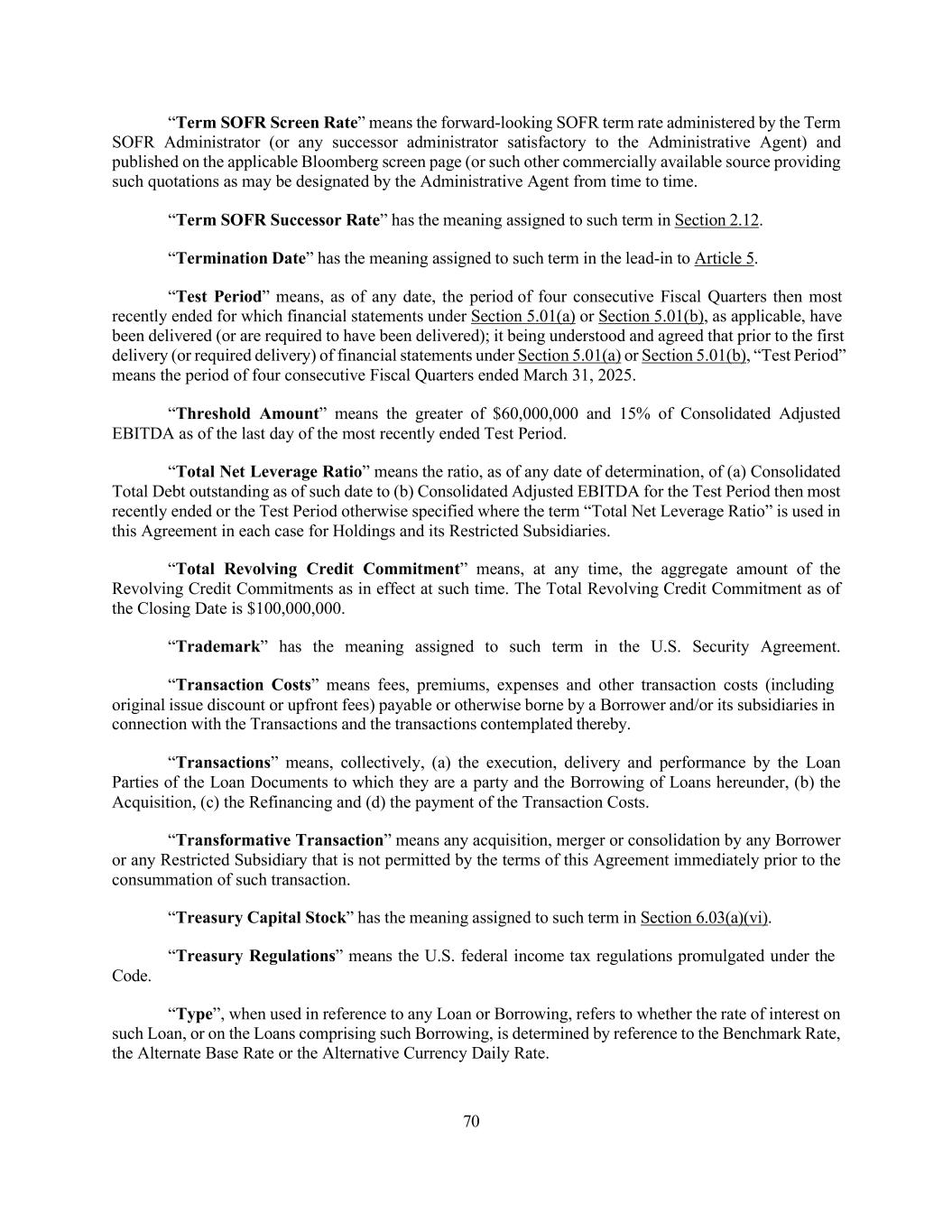 70 “Term SOFR Screen Rate” means the forward-looking SOFR term rate administered by the Term SOFR Administrator (or any successor administrator satisfactory to the Administrative Agent) and published on the applicable Bloomberg screen page (or such other commercially available source providing such quotations as may be designated by the Administrative Agent from time to time. “Term SOFR Successor Rate” has the meaning assigned to such term in Section 2.12. “Termination Date” has the meaning assigned to such term in the lead-in to Article 5. “Test Period” means, as of any date, the period of four consecutive Fiscal Quarters then most recently ended for which financial statements under Section 5.01(a) or Section 5.01(b), as applicable, have been delivered (or are required to have been delivered); it being understood and agreed that prior to the first delivery (or required delivery) of financial statements under Section 5.01(a) or Section 5.01(b), “Test Period” means the period of four consecutive Fiscal Quarters ended March 31, 2025. “Threshold Amount” means the greater of $60,000,000 and 15% of Consolidated Adjusted EBITDA as of the last day of the most recently ended Test Period. “Total Net Leverage Ratio” means the ratio, as of any date of determination, of (a) Consolidated Total Debt outstanding as of such date to (b) Consolidated Adjusted EBITDA for the Test Period then most recently ended or the Test Period otherwise specified where the term “Total Net Leverage Ratio” is used in this Agreement in each case for Holdings and its Restricted Subsidiaries. “Total Revolving Credit Commitment” means, at any time, the aggregate amount of the Revolving Credit Commitments as in effect at such time. The Total Revolving Credit Commitment as of the Closing Date is $100,000,000. “Trademark” has the meaning assigned to such term in the U.S. Security Agreement. “Transaction Costs” means fees, premiums, expenses and other transaction costs (including original issue discount or upfront fees) payable or otherwise borne by a Borrower and/or its subsidiaries in connection with the Transactions and the transactions contemplated thereby. “Transactions” means, collectively, (a) the execution, delivery and performance by the Loan Parties of the Loan Documents to which they are a party and the Borrowing of Loans hereunder, (b) the Acquisition, (c) the Refinancing and (d) the payment of the Transaction Costs. “Transformative Transaction” means any acquisition, merger or consolidation by any Borrower or any Restricted Subsidiary that is not permitted by the terms of this Agreement immediately prior to the consummation of such transaction. “Treasury Capital Stock” has the meaning assigned to such term in Section 6.03(a)(vi). “Treasury Regulations” means the U.S. federal income tax regulations promulgated under the Code. “Type”, when used in reference to any Loan or Borrowing, refers to whether the rate of interest on such Loan, or on the Loans comprising such Borrowing, is determined by reference to the Benchmark Rate, the Alternate Base Rate or the Alternative Currency Daily Rate.