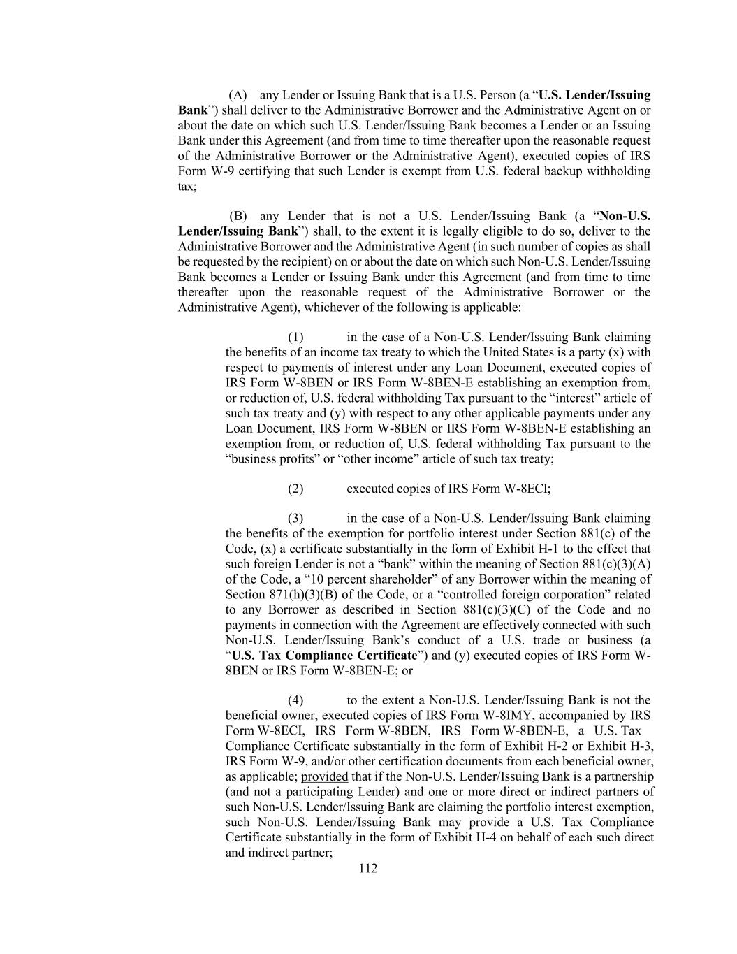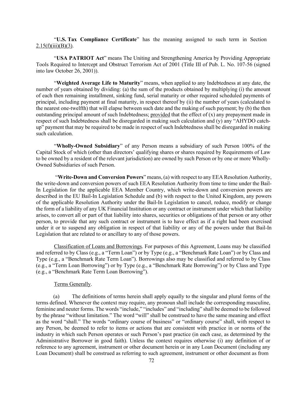 72 “U.S. Tax Compliance Certificate” has the meaning assigned to such term in Section 2.15(f)(iii)(B)(3). “USA PATRIOT Act” means The Uniting and Strengthening America by Providing Appropriate Tools Required to Intercept and Obstruct Terrorism Act of 2001 (Title III of Pub. L. No. 107-56 (signed into law October 26, 2001)). “Weighted Average Life to Maturity” means, when applied to any Indebtedness at any date, the number of years obtained by dividing: (a) the sum of the products obtained by multiplying (i) the amount of each then remaining installment, sinking fund, serial maturity or other required scheduled payments of principal, including payment at final maturity, in respect thereof by (ii) the number of years (calculated to the nearest one-twelfth) that will elapse between such date and the making of such payment; by (b) the then outstanding principal amount of such Indebtedness; provided that the effect of (x) any prepayment made in respect of such Indebtedness shall be disregarded in making such calculation and (y) any “AHYDO catch- up” payment that may be required to be made in respect of such Indebtedness shall be disregarded in making such calculation. “Wholly-Owned Subsidiary” of any Person means a subsidiary of such Person 100% of the Capital Stock of which (other than directors’ qualifying shares or shares required by Requirements of Law to be owned by a resident of the relevant jurisdiction) are owned by such Person or by one or more Wholly- Owned Subsidiaries of such Person. “Write-Down and Conversion Powers” means, (a) with respect to any EEA Resolution Authority, the write-down and conversion powers of such EEA Resolution Authority from time to time under the Bail- In Legislation for the applicable EEA Member Country, which write-down and conversion powers are described in the EU Bail-In Legislation Schedule and (b) with respect to the United Kingdom, any powers of the applicable Resolution Authority under the Bail-In Legislation to cancel, reduce, modify or change the form of a liability of any UK Financial Institution or any contract or instrument under which that liability arises, to convert all or part of that liability into shares, securities or obligations of that person or any other person, to provide that any such contract or instrument is to have effect as if a right had been exercised under it or to suspend any obligation in respect of that liability or any of the powers under that Bail-In Legislation that are related to or ancillary to any of those powers. Classification of Loans and Borrowings. For purposes of this Agreement, Loans may be classified and referred to by Class (e.g., a “Term Loan”) or by Type (e.g., a “Benchmark Rate Loan”) or by Class and Type (e.g., a “Benchmark Rate Term Loan”). Borrowings also may be classified and referred to by Class (e.g., a “Term Loan Borrowing”) or by Type (e.g., a “Benchmark Rate Borrowing”) or by Class and Type (e.g., a “Benchmark Rate Term Loan Borrowing”). Terms Generally. (a) The definitions of terms herein shall apply equally to the singular and plural forms of the terms defined. Whenever the context may require, any pronoun shall include the corresponding masculine, feminine and neuter forms. The words “include,” “includes” and “including” shall be deemed to be followed by the phrase “without limitation.” The word “will” shall be construed to have the same meaning and effect as the word “shall.” The words “ordinary course of business” or “ordinary course” shall, with respect to any Person, be deemed to refer to items or actions that are consistent with practice in or norms of the industry in which such Person operates or such Person’s past practice (in each case, as determined by the Administrative Borrower in good faith). Unless the context requires otherwise (i) any definition of or reference to any agreement, instrument or other document herein or in any Loan Document (including any Loan Document) shall be construed as referring to such agreement, instrument or other document as from