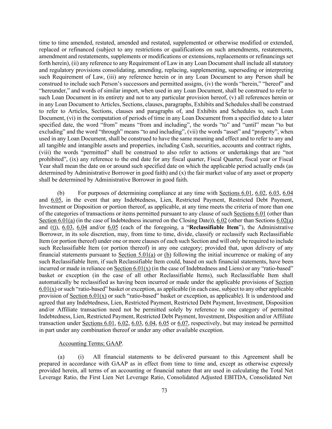 73 time to time amended, restated, amended and restated, supplemented or otherwise modified or extended, replaced or refinanced (subject to any restrictions or qualifications on such amendments, restatements, amendment and restatements, supplements or modifications or extensions, replacements or refinancings set forth herein), (ii) any reference to any Requirement of Law in any Loan Document shall include all statutory and regulatory provisions consolidating, amending, replacing, supplementing, superseding or interpreting such Requirement of Law, (iii) any reference herein or in any Loan Document to any Person shall be construed to include such Person’s successors and permitted assigns, (iv) the words “herein,” “hereof” and “hereunder,” and words of similar import, when used in any Loan Document, shall be construed to refer to such Loan Document in its entirety and not to any particular provision hereof, (v) all references herein or in any Loan Document to Articles, Sections, clauses, paragraphs, Exhibits and Schedules shall be construed to refer to Articles, Sections, clauses and paragraphs of, and Exhibits and Schedules to, such Loan Document, (vi) in the computation of periods of time in any Loan Document from a specified date to a later specified date, the word “from” means “from and including”, the words “to” and “until” mean “to but excluding” and the word “through” means “to and including”, (vii) the words “asset” and “property”, when used in any Loan Document, shall be construed to have the same meaning and effect and to refer to any and all tangible and intangible assets and properties, including Cash, securities, accounts and contract rights, (viii) the words “permitted” shall be construed to also refer to actions or undertakings that are “not prohibited”, (ix) any reference to the end date for any fiscal quarter, Fiscal Quarter, fiscal year or Fiscal Year shall mean the date on or around such specified date on which the applicable period actually ends (as determined by Administrative Borrower in good faith) and (x) the fair market value of any asset or property shall be determined by Administrative Borrower in good faith. (b) For purposes of determining compliance at any time with Sections 6.01, 6.02, 6.03, 6.04 and 6.05, in the event that any Indebtedness, Lien, Restricted Payment, Restricted Debt Payment, Investment or Disposition or portion thereof, as applicable, at any time meets the criteria of more than one of the categories of transactions or items permitted pursuant to any clause of such Sections 6.01 (other than Section 6.01(a) (in the case of Indebtedness incurred on the Closing Date)), 6.02 (other than Sections 6.02(a) and (t)), 6.03, 6.04 and/or 6.05 (each of the foregoing, a “Reclassifiable Item”), the Administrative Borrower, in its sole discretion, may, from time to time, divide, classify or reclassify such Reclassifiable Item (or portion thereof) under one or more clauses of each such Section and will only be required to include such Reclassifiable Item (or portion thereof) in any one category; provided that, upon delivery of any financial statements pursuant to Section 5.01(a) or (b) following the initial incurrence or making of any such Reclassifiable Item, if such Reclassifiable Item could, based on such financial statements, have been incurred or made in reliance on Section 6.01(x) (in the case of Indebtedness and Liens) or any “ratio-based” basket or exception (in the case of all other Reclassifiable Items), such Reclassifiable Item shall automatically be reclassified as having been incurred or made under the applicable provisions of Section 6.01(x) or such “ratio-based” basket or exception, as applicable (in each case, subject to any other applicable provision of Section 6.01(x) or such “ratio-based” basket or exception, as applicable). It is understood and agreed that any Indebtedness, Lien, Restricted Payment, Restricted Debt Payment, Investment, Disposition and/or Affiliate transaction need not be permitted solely by reference to one category of permitted Indebtedness, Lien, Restricted Payment, Restricted Debt Payment, Investment, Disposition and/or Affiliate transaction under Sections 6.01, 6.02, 6.03, 6.04, 6.05 or 6.07, respectively, but may instead be permitted in part under any combination thereof or under any other available exception. Accounting Terms; GAAP. (a) (i) All financial statements to be delivered pursuant to this Agreement shall be prepared in accordance with GAAP as in effect from time to time and, except as otherwise expressly provided herein, all terms of an accounting or financial nature that are used in calculating the Total Net Leverage Ratio, the First Lien Net Leverage Ratio, Consolidated Adjusted EBITDA, Consolidated Net